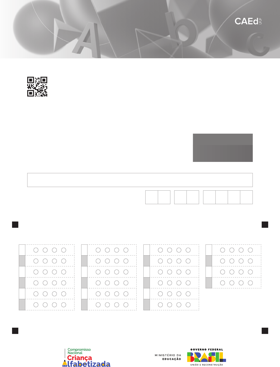 <p>CADERNO</p><p>Data de Nascimento</p><p>do(a) estudante</p><p>Nome do(a) estudante</p><p>M 0 3 0 2</p><p>AVALIAÇÃO CONTÍNUA DA APRENDIZAGEM</p><p>CICLO II</p><p>2024</p><p>1891M0302</p><p>3º ano do Ensino Fundamental</p><p>MATEMÁTICA</p><p>44445544119977332299</p><p>01 DCBA</p><p>02 DCBA</p><p>03 DCBA</p><p>04 DCBA</p><p>05 DCBA</p><p>06 DCBA</p><p>07 DCBA</p><p>08 DCBA</p><p>09 DCBA</p><p>10 DCBA</p><p>11 DCBA</p><p>12 DCBA</p><p>13 DCBA</p><p>14 DCBA</p><p>15 DCBA</p><p>16 DCBA</p><p>17 DCBA</p><p>18 DCBA</p><p>19 DCBA</p><p>20 DCBA</p><p>21 DCBA</p><p>22 DCBA</p><p>EXEMPLO</p><p>Vamos fazer juntos um exemplo de uma atividade.</p><p>OBSERVE ABAIXO A CONTA QUE A PROFESSORA ANA ESCREVEU NO</p><p>QUADRO.</p><p>15 + 4</p><p>QUAL É O RESULTADO DESSA CONTA?</p><p>q 11</p><p>q 18</p><p>q 19</p><p>q 55</p><p>BL02M03_ALUNO</p><p>OUÇA E OBSERVE O TEXTO ABAIXO PARA RESPONDER ÀS QUATRO</p><p>QUESTÕES A SEGUIR.</p><p>Pedro foi ao cinema assistir a um filme. Ele observou que, na entrada do cinema,</p><p>havia um quadro com a quantidade de pessoas que assistiram a esse filme nas</p><p>duas primeiras semanas de exibição. Além disso, Pedro viu que havia um mapa</p><p>da sala onde o filme estava sendo exibido.</p><p>ENTRADA</p><p>Público que assistiu ao filme:</p><p>1ª semana: 1 028 pessoas</p><p>2ª semana: 520 pessoas</p><p>Entrada</p><p>Tela</p><p>4 5 6 7 8 9</p><p>40 41 42 43 44 45</p><p>31 32 33 34 35 36</p><p>22 23 24 25 26 27</p><p>13 14 15 16 17 18</p><p>49 50 51 52 53 54</p><p>1 2 3</p><p>37 38 39</p><p>28 29 30</p><p>19 20 21</p><p>10 11 12</p><p>46 47 48</p><p>(M00062063_CEN)</p><p>M0302</p><p>1</p><p>BL02M03_ALUNO</p><p>Questão 01 M00062063</p><p>Observe novamente o quadro que informa a quantidade de pessoas que assistiram</p><p>ao filme nas duas primeiras semanas de exibição.</p><p>Público que assistiu ao filme:</p><p>1ª semana: 1 028 pessoas</p><p>2ª semana: 520 pessoas</p><p>Qual foi o total de pessoas que assistiram a esse filme nas duas primeiras semanas</p><p>de exibição?</p><p>q 1 028.</p><p>q 1 548.</p><p>q 6 228.</p><p>q 8 451.</p><p>M0302</p><p>2</p><p>BL02M03_ALUNO</p><p>Questão 02 M00062065</p><p>Pedro observou que 1 028 pessoas assistiram ao filme na 1ª semana de exibição</p><p>nesse cinema.</p><p>Qual é o algarismo que ocupa a ordem das centenas nesse número?</p><p>q 0.</p><p>q 1.</p><p>q 2.</p><p>q 8.</p><p>M0302</p><p>3</p><p>BL02M03_ALUNO</p><p>Questão 03 M00062066</p><p>Pedro utilizou o mapa apresentado abaixo para definir a poltrona em que ele irá se</p><p>sentar.</p><p>Tela</p><p>4 5 6 7 8 9</p><p>40 41 42 43 44 45</p><p>31 32 33 34 35 36</p><p>22 23 24 25 26 27</p><p>13 14 15 16 17 18</p><p>49 50 51 52 53 54</p><p>1 2 3</p><p>37 38 39</p><p>28 29 30</p><p>19 20 21</p><p>10 11 12</p><p>46 47 48</p><p>Entrada</p><p>Ele pretende seguir em frente e se sentar na primeira poltrona da terceira fileira, que</p><p>está à sua direita.</p><p>Qual é o número da poltrona em que Pedro irá se sentar?</p><p>q 4.</p><p>q 6.</p><p>q 21.</p><p>q 22.</p><p>M0302</p><p>4</p><p>BL02M03_ALUNO</p><p>Questão 04 M00062067</p><p>Observe abaixo a figura que apareceu na tela do cinema antes do início do filme a</p><p>que Pedro foi assistir.</p><p>Produção:</p><p>Realiza Filmes</p><p>Pedro observou que a figura é formada por quatro figuras geométricas.</p><p>Quantas dessas figuras geométricas são trapézios?</p><p>q 1.</p><p>q 2.</p><p>q 3.</p><p>q 4.</p><p>M0302</p><p>5</p><p>BL03M03_ALUNO</p><p>OUÇA E OBSERVE O TEXTO ABAIXO PARA RESPONDER ÀS QUATRO</p><p>QUESTÕES A SEGUIR.</p><p>Os amigos André, Tânia, Débora e João estão participando de uma corrida de</p><p>rua. Essa corrida tem um percurso de 9 408 metros. Observe, na figura abaixo,</p><p>esses quatro amigos em um momento da corrida, cada um deles com seu número</p><p>de inscrição.</p><p>726625</p><p>1 9041 789</p><p>(M00062083_CEN)</p><p>M0302</p><p>6</p><p>BL03M03_ALUNO</p><p>Questão 05 M00062083</p><p>O percurso dessa corrida de rua é 9 408 metros.</p><p>Uma decomposição para esse número é</p><p>q 9 CENTENAS, 4 DEZENAS E 8 UNIDADES.</p><p>q 9 UNIDADES DE MILHAR, 4 CENTENAS E 8 DEZENAS.</p><p>q 9 UNIDADES DE MILHAR, 4 CENTENAS E 8 UNIDADES.</p><p>q 9 UNIDADES DE MILHAR E 48 DEZENAS.</p><p>M0302</p><p>7</p><p>BL03M03_ALUNO</p><p>Questão 06 M00062084</p><p>Observe, na figura abaixo, Débora com seu número de inscrição nessa corrida.</p><p>1 904</p><p>A escrita desse número por extenso é</p><p>q CENTO E NOVENTA E QUATRO.</p><p>q QUATRO MIL E NOVENTA E UM.</p><p>q UM MIL E NOVENTA E QUATRO.</p><p>q UM MIL NOVECENTOS E QUATRO.</p><p>M0302</p><p>8</p><p>BL03M03_ALUNO</p><p>Questão 07 M00062086</p><p>Nos primeiros quatro minutos de corrida, João percorreu 1 255 metros. Nos dois</p><p>minutos seguintes, ele percorreu 603 metros. Para saber a distância total percorrida</p><p>por João nesses seis minutos de corrida, é preciso resolver a operação apresentada</p><p>abaixo.</p><p>1 255 + 603</p><p>O resultado dessa operação é</p><p>q 7 285.</p><p>q 1 858.</p><p>q 1 808.</p><p>q 1 318.</p><p>M0302</p><p>9</p><p>BL03M03_ALUNO</p><p>Questão 08 M00062087</p><p>Observe, nos quadros abaixo, os números de inscrição de cada um dos quatro</p><p>amigos participantes dessa corrida.</p><p>1 789 625 1 904 726</p><p>Qual desses números de inscrição é o maior?</p><p>q 1 789.</p><p>q 625.</p><p>q 1 904.</p><p>q 726.</p><p>M0302</p><p>10</p><p>BL04M03_ALUNO</p><p>OUÇA E OBSERVE O TEXTO ABAIXO PARA RESPONDER ÀS QUATRO</p><p>QUESTÕES A SEGUIR.</p><p>Um professor de matemática levou para sua sala de aula duas balanças diferentes</p><p>e alguns sólidos geométricos, como apresentado na imagem abaixo.</p><p>0 g</p><p>O professor propôs para os estudantes que pesassem esses sólidos e realizassem</p><p>algumas atividades com as medidas encontradas.</p><p>(M00062124_CEN)</p><p>M0302</p><p>11</p><p>BL04M03_ALUNO</p><p>Questão 09 M00062125</p><p>Dois sólidos foram pesados juntos, e o peso 