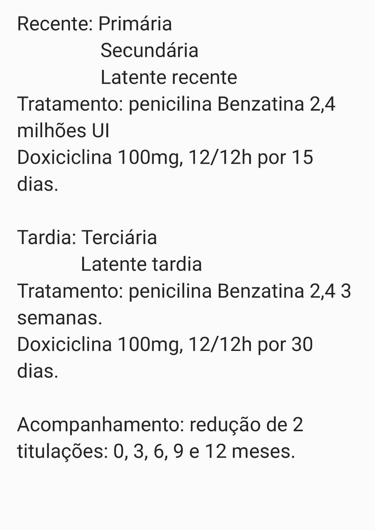 <p>Recente: Primária Secundária Latente recente Tratamento: penicilina Benzatina 2,4 milhões UI Doxiciclina 100mg, 12/12h por 15 dias. Tardia: Terciária Latente tardia Tratamento: penicilina Benzatina semanas. Doxiciclina 100mg, 12/12h por 30 dias. Acompanhamento: redução de 2 titulações: 0,3,6,9 e 12 meses.</p>