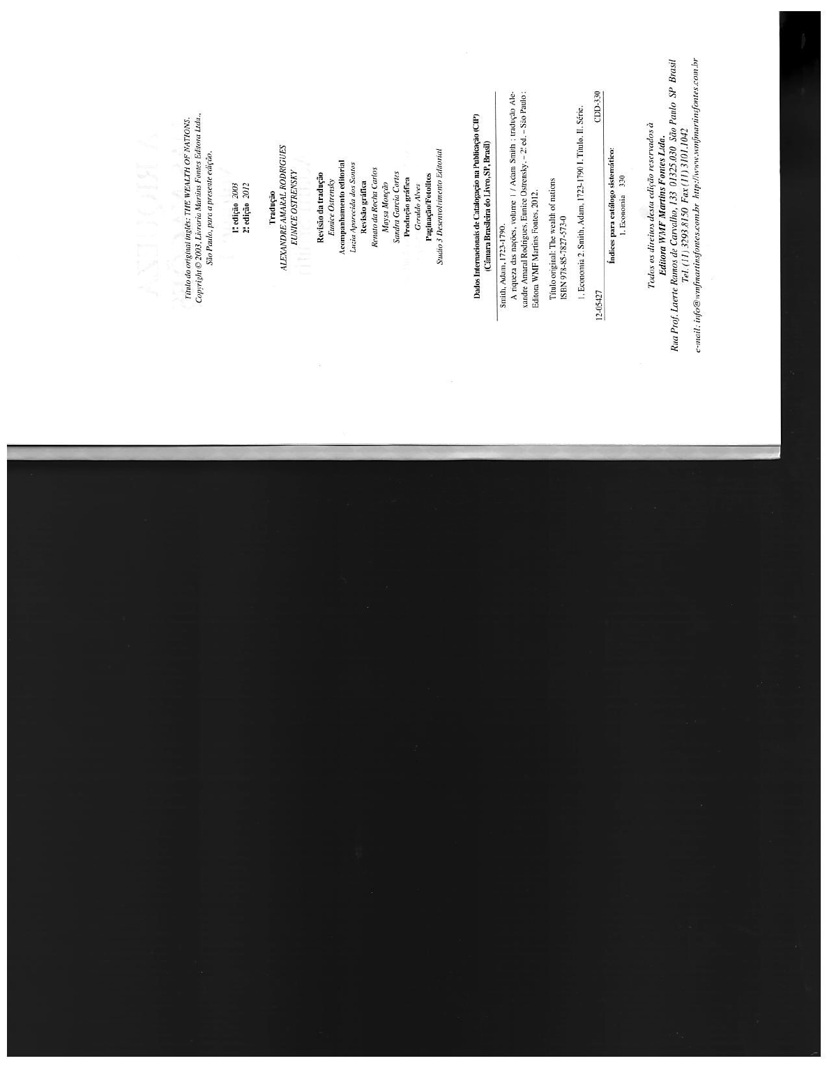 <p>Título do original THE WEALTH OF NATIONS. Copyright 2003, Livraria Martins Fontes Editora Ltda., São Paulo, para a presente edição. edição 2003 edição 2012 Tradução ALEXANDRE AMARAL RODRIGUES EUNICE OSTRENSKY Revisão da tradução Eunice Ostrensky Acompanhamento editorial Luzia Aparecida dos Santos Revisão gráfica Renato da Rocha Carlos Maysa Monção Sandra Garcia Cortes Produção gráfica Geraldo Alves Paginação/Fotolitos Studio 3 Desenvolvimento Editorial Dados de Catalogação na Publicação (CIP) (Câmara Brasileira do Livro, SP, Brasil) Adam. 1723-1790. A riqueza das volume Adam Smith : tradução Ale- xandre Amaral Rodrigues, Eunice ed São Paulo : Editora WMF Martins Fontes, 2012. Título original: The wealth of nations ISBN 978-85-7827-573-0 1. Economia 2. Smith, II. Série. CDD-330 12-05427 para sistemático: 1. Economia 330 Todos os direitos desta edição reservados à Editora WMF Martins Fontes Ltda. Rua Prof. Laerte Ramos de Carvalho, 133 01325.030 São Paulo SP Brasil Tel. (11) 3293.8150 Fax (11) 3101.1042 e-mail:</p><p>CAPÍTULO 1 Da divisão do trabalho O maior aperfeiçoamento das forças produtivas do tra- balho e grande parte da habilidade, destreza e discernimen- to com que ele é em todos os lugares dirigido ou aplicado parecem ter sido os efeitos da divisão do É possível compreender mais facilmente os efeitos da divisão do trabalho sobre a atividade geral da sociedade considerando a maneira pela qual ela opera em algumas manufaturas específicas. Em geral, admite-se que ela seja levada mais longe em algumas manufaturas muito triviais, não porque realmente seja mais nestas do que em outras de maior importância, mas porque nessas manufaturas tri- viais, número que é necessariamente destinam pequenas carências de traba- de se a suprir as um reduzido de pessoas, número total pequeno: não é reunir na mesma oficina todos os que se ferentes que ocupam raro, possível se dos colo- di- ramos do trabalho, de modo todos quem ao mesmo tempo à vista do Pelo contrá- rio, des ramo carências distinto suprir pessoas, as gran- cada nas grandes manufaturas destinadas a de um elevado número de do trabalho emprega um número tão de mesma mais de do trabalhadores, uma todos só gran- vez, na que é impossível reuni-los Raramente conseguimos ver, de que os trabalhadores que se ocupam de uma úni- ca Portanto, embora nessas manufaturas traba-</p><p>8 A RIQUEZA DAS NAÇÕES LIVRO 9 lho possa realmente ser dividido num número muito maior fabricar mais de 48 mil alfinetes num dia. Desse modo, de tarefas do que nas de natureza mais trivial, a divisão como cada pessoa produzia uma décima parte de 48 mil al- aqui não é tão evidente e por isso mesmo tem sido menos finetes, cada uma fabricava cerca de 4.800 alfinetes num observada. dia. Mas, se cada uma trabalhasse separada e independen- Tomemos, pois, como exemplo uma manufatura muito temente das outras, e sem que nenhuma delas tivesse sido trivial, mas na qual a divisão do trabalho tem sido frequen- treinada para essa atividade específica, por certo nenhuma temente notada, a forja de alfinetes; um trabalhador não delas conseguiria produzir vinte alfinetes por dia, talvez treinado para essa atividade (que a divisão do trabalho tor- nem mesmo um único alfinete num dia; ou seja, certamen- nou uma ocupação distinta) e que não estivesse familiari- te não conseguiria produzir nem a parte, e talvez nem zado com as máquinas nela utilizadas (para cuja invenção a a parte do que hoje é capaz de produzir, graças à di- divisão do trabalho provavelmente contribuiu) dificilmente visão e combinação adequadas de suas diferentes tarefas. poderia, ainda que com a máxima diligência, produzir um Em todos os ofícios e manufaturas, os efeitos da divi- alfinete por dia, e com certeza não seria capaz de produ- do trabalho são semelhantes aos que se verificam nes- zir vinte. Mas, da maneira como essa atividade é atualmen- manufatura tão trivial, embora em muitas delas O traba- te realizada, não só conjunto do trabalho constitui uma lho não possa ser tão subdividido, nem reduzido a uma ocupação específica, como a maior parte das tarefas em que simplicidade tão grande de operações. Entretanto, a divi- trabalho está subdividido consiste, igualmente, em ocupa- são do trabalho gera em todos os ofícios, na medida em ções especializadas. Um homem desenrola arame, outro que é possível introduzi-la, um aumento proporcional das estica, um terceiro corta, um quarto O aponta e um forças produtivas do trabalho. A distinção entre as diversas quinto afia a outra extremidade para receber a cabeça; a atividades e empregos parece ter-se realizado em conse- fabricação da cabeça exige duas ou três operações distin- dessa vantagem. Aliás, verifica-se que essa distin- tas; encaixe da cabeça é uma ocupação específica, assim é geralmente levada mais longe nos países que desfru- como é alvejar os alfinetes; mesmo a embalagem dos al- um nível mais elevado de atividade e aperfeiçoamen- finetes é uma tarefa distinta; e a importante atividade de for- to: O que constitui trabalho de um homem num estágio primitivo da sociedade corresponde comumente ao de vá- jar alfinetes é, dessa maneira, dividida em cerca de dezoi- rios homens numa sociedade mais desenvolvida. Em todas to operações distintas, as quais, em algumas manufaturas, as sociedades desenvolvidas, agricultor é geralmente ape- são todas executadas por diferentes operários, embora em nas agricultor*; operário, tão-somente um operário. Além outras mesmo homem às vezes execute duas ou três de- disso, trabalho necessário para produzir um artigo com- las. Conheci uma pequena manufatura desse tipo, que em- pleto quase sempre se divide entre um grande número de pregava apenas dez homens e onde, por conseguinte, vá- rios deles executavam duas ou três operações distintas. Mas, embora fossem muito pobres e por isso estivessem