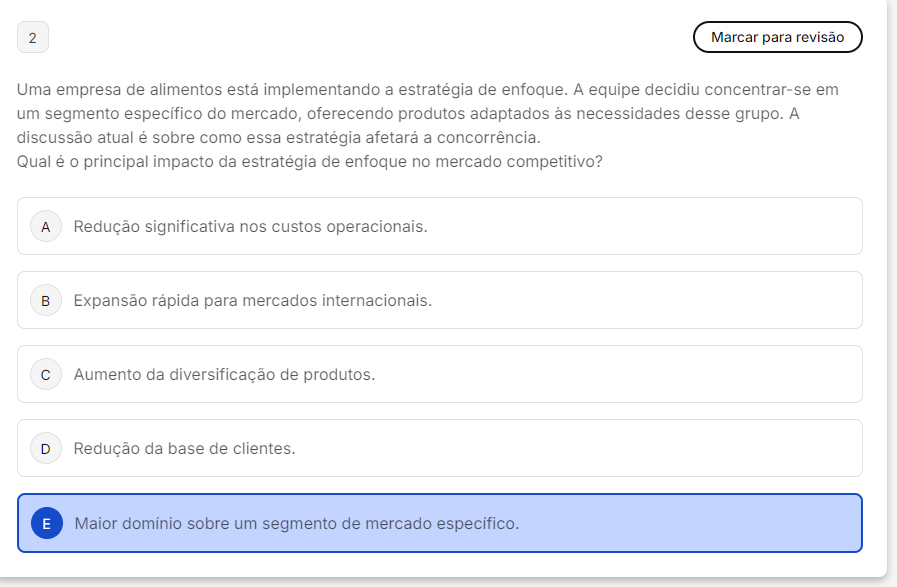 <p>2 Marcar para revisão Uma empresa de alimentos está implementando a estratégia de enfoque. A equipe decidiu concentrar-se em um segmento específico do mercado, oferecendo produtos adaptados às necessidades desse grupo. A discussão atual é sobre como essa estratégia afetará a concorrência. Qual é principal impacto da estratégia de enfoque no mercado competitivo? A Redução significativa nos custos operacionais. B Expansão rápida para mercados internacionais. C Aumento da diversificação de produtos. D Redução da base de clientes. E Maior domínio sobre um segmento de mercado específico.</p>
