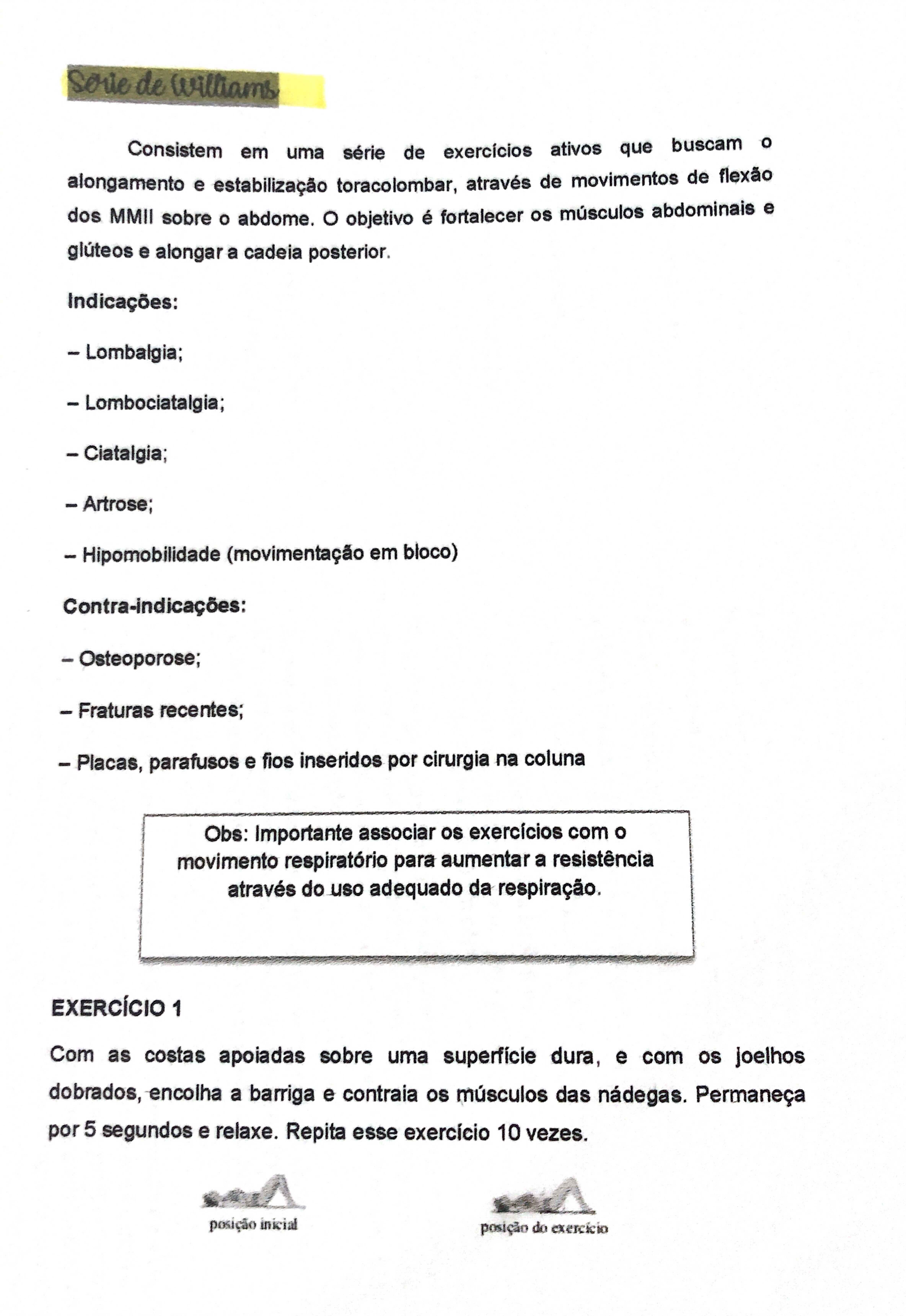 <p>Serie de Williams Consistem em uma série de exercícios ativos que buscam o alongamento e estabilização toracolombar, através de movimentos de flexão dos MMII sobre o abdome. objetivo é fortalecer os músculos abdominais e glúteos e alongar a cadeia posterior. Indicações: - Lombalgia; Lombociatalgia; Ciatalgia; Artrose; Hipomobilidade (movimentação em bloco) Contra-indicações: Osteoporose; Fraturas recentes; - Placas, parafusos e fios inseridos por cirurgia na coluna Obs: Importante associar os exercícios com o movimento respiratório para aumentar a resistência através do uso adequado da respiração. EXERCÍCIO 1 Com as costas apoiadas sobre uma superfície dura, e com os joelhos dobrados, encolha a barriga e contraia os músculos das nádegas. Permaneça por 5 segundos e relaxe. Repita esse exercício 10 vezes. posição inicial posição do exercício</p><p>EXERCÍCIO 2 Deitado na posição inicial, contraia o abdome, cruze os braços sobre o peito, levante tronco olhando para cima e leve o queixo em direção ao peito. Mantenha-se assim por 20s. Repita esse exercício 10 vezes. posição inicial posição do exercício EXERCÍCIO 3 Na mesma posição, levante um joelho em direção ao tórax, alternadamente. E levante ao mesmo tempo a cabeça e os ombros. Mantenha esta posição durante 20 segundos. Repita esse exercício 10 vezes. posição inicial posição do exercício EXERCÍCIO 4 Puxe os dois joelhos em direção ao tórax, e ao mesmo tempo levante a cabeça e os ombros do chão. Mantenha esta posição durante 20 segundos. Repita esse exercício 10 vezes. posição inicial posição do exercício Para alongamento, há uma série de Williams composta de seis exercícios básicos e cinco exercícios derivados. IMPORTANTE REALIZAR AQUECIMENTO ANTES DO ALONGAMENTO!</p><p>DE WILLIAMS DERIVAÇÕES COMPLEMENTARES PROTOCOLO BASE PARA PREVENÇÃO DE DOENÇAS POSTURAIS E FORTALECIMENTO DA MUSCULATURA ESTABILIZADORA DA POSTURA E ELIMINAÇÃO DE DORES LOMBARES E MEMBROS INFERIORES. 1° EXERCÍCIO: -PACIENTE EM DECÚBITO DORSAL, FLETE UMA PERNA, SEGURANDO-A POR TRÁS DO JOELHO DE FORMA CONFORTÁVEL. TRACIONA-SE A PERNA CONTANDO ATÉ 25 SEGUNDOS PARA PROMOVER o ALONGAMENTO. FAZ-SE 6 - SE o PACIENTE ESTIVER BEM E SEM DOR, PEDE-SE A REALIZAÇÃO DE UMA DORSOFLEXÃO DURANTE A REALIZAÇÃO DO EXERCÍCIO. 1° DERIVADO: REALIZA-SE ESTE EXERCÍCIO COM A OUTRA PERNA. 2° EXERCÍCIO: o PACIENTE AGARRA AS PERNAS DEVE-SE OBSERVAR SE FORMAÇÃO DO ARCO NA COLUNA LOMBAR. EM CASO POSITIVO, APERTA-SE o RETO ABDOMINAL E EMPURRA SACRO PARA TRÁS A FIM DE REALIZAR A CORREÇÃO DO MESMO. 3° EXERCÍCIO: ALONGAMENTO DO PACIENTE COM A PERNA ESTENDIDA E DORSOFLEXÃO POR CERCA DE COM SEIS SE PACIENTE TIVER DOR, FLETIR A OUTRA PERNA. ESTABILIZAR CALCANHAR COM COTOVELO E JOELHO COM A MÃO. O TERAPEUTA DEVE BUSCAR A MELHOR POSIÇÃO PARA A SUA 4° ELEVAÇÃO DAS PERNAS PODE-SE COLOCAR UMA FAIXA OU UMA CORDA PARA QUE PACIENTE SUSTENTE AS PERNAS SOZINHO. 5° REALIZAÇÃO DA PONTE. FORTALECENDO A REGIÃO POSTERIOR E ALONGANDO A REGIÃO ERGUESSE QUADRIL COM AS MÃO NO SOLO. FAZER 6 CADA UMA COM 20 SEGUNDOS DE DURAÇÃO. 6° PACIENTE SENTADO TENTANDO ENCOSTAR AS MÃOS NOS DEDOS DOS PES. DORSO DEVE FORMAR UM ARCO E A CABEÇA DEVE ESTAR LEVEMENTE PODE-SE DOBRAR E IR ESTENDENDO AOS</p>