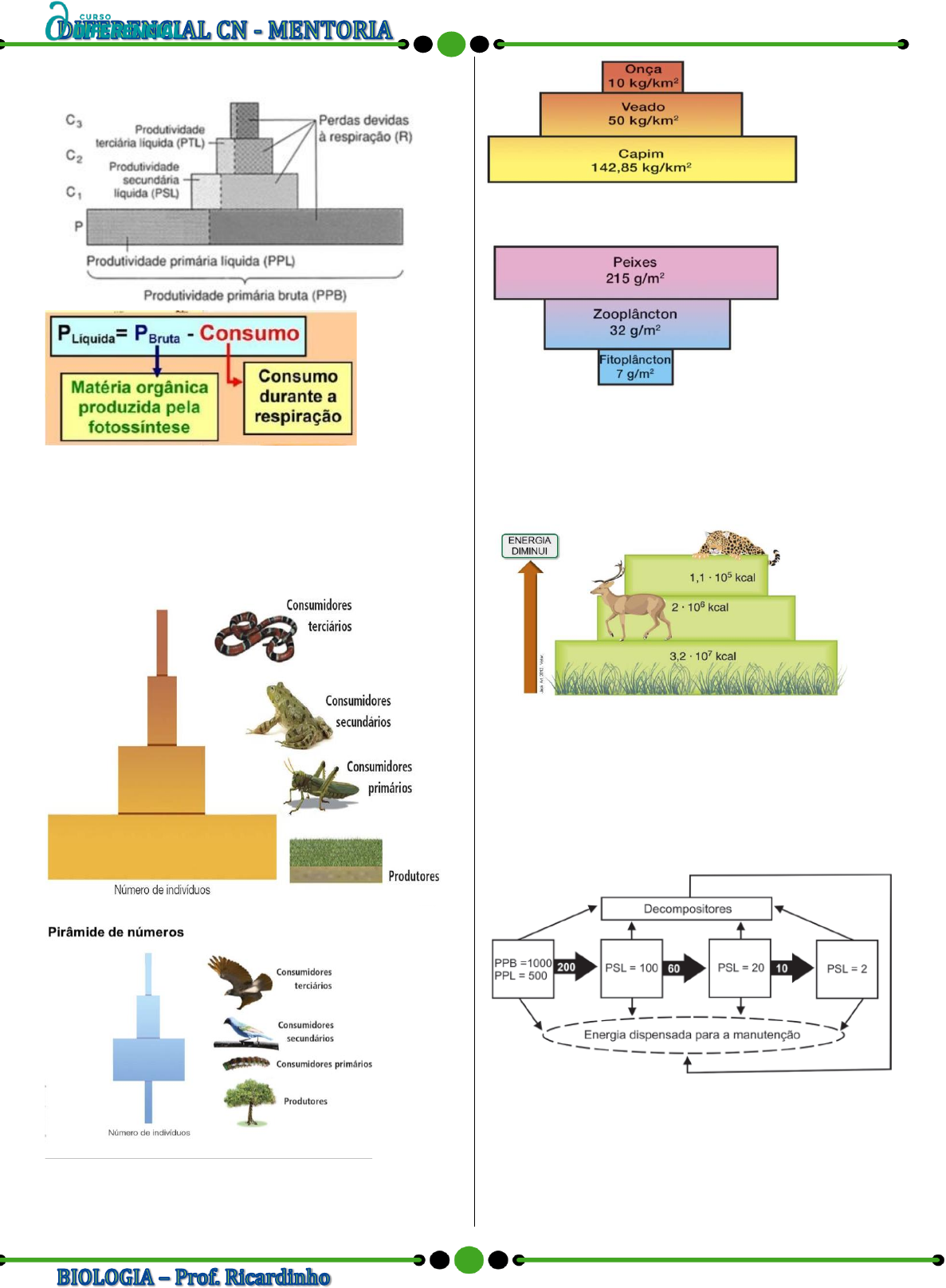 <p>PRODUTIVIDADE NOS ECOSSISTEMAS</p><p>Pirâmides ecológicas – representam por gráficos na forma de</p><p>retângulos superpostos o número de organismos, a biomassa e o</p><p>fluxo energético da cadeia alimentar.</p><p>Pirâmide de números – expressa a quantidade de seres vivos</p><p>em cada nível trófico da cadeia alimentar durante certo período de</p><p>tempo. Podem ter a base maior quando os produtores são</p><p>pequenos e numerosos e podem não ter formato de pirâmide,</p><p>quando o produtor é de grande porte.</p><p>Pirâmide de biomassa – representa a quantidade de matéria</p><p>orgânica existente em cada nível trófico e que está disponível para</p><p>os organismos do nível seguinte durante um determinado período</p><p>de tempo. A biomassa pode ser expressa por kg/km2 ou g/m2.</p><p>A pirâmide de biomassa pode ser invertida no ambiente aquático,</p><p>onde os produtores são pequenos e apresentam alta</p><p>produtividade e rápida reprodução.</p><p>Pirâmide de energia – representa a quantidade de energia</p><p>existente em cada nível trófico. Como os organismos de cada nível</p><p>trófico consomem boa parte da energia que recebem e perdem</p><p>uma parte na dissipação de calor. Apenas parte da energia de um</p><p>nível trófico passa para o nível trófico seguinte. Isso restringe o</p><p>número de níveis tróficos a quatro ou cinco e impede que essa</p><p>pirâmide possa ser invertida.</p><p>1- (Unicamp/2023) As relações ecológicas podem ser</p><p>representadas por modelos de fluxo de energia, cujas principais</p><p>vantagens são as representações dos decompositores, da matéria</p><p>orgânica armazenada no sistema e da energia dispendida para a</p><p>manutenção dos organismos. O modelo hipotético a seguir indica</p><p>os valores (kcal/m2/ano) de produtividade primária bruta (PPB), de</p><p>produtividade primária líquida (PPL), de produtividade secundária</p><p>líquida (PSL) e do fluxo de energia (setas). Os valores dentro das</p><p>setas indicam a energia assimilada pelo próximo nível trófico.</p><p>Considerando os dados apresentados, é correto afirmar que a</p><p>energia</p><p>A) utilizada para a manutenção do consumidor primário é de 40</p><p>kcal/m2/ano.</p><p>B) direcionada aos decompositores é de 352 kcal/m2/ano.</p><p>C) consumida na manutenção dos autotróficos é de 700 kcal/</p><p>m2/ano.</p><p>D) assimilada pelos carnívoros é de 270 kcal/m2/ano.</p><p>2- A pirâmide de números a seguir representa uma cadeia, em que</p><p>os indivíduos estão relacionados pela transferência de alimentos</p><p>em perfeito equilíbrio no ecossistema</p><p>Assinale a opção que apresenta a seqüência que poderia</p><p>representar essa cadeia.</p><p>a) Vegetais – grilos – louva-a-deus – rãs</p><p>b) Árvore – pulgões – joaninhas – aranhas</p><p>c) Capinzal – preás – pulgas – bactérias</p><p>d) Algas – crustáceos – peixes menores – peixes maiores</p><p>e) Capim – boi – carrapatos – anus</p><p>3- (Enem/2013 – PPL)</p><p>A posição ocupada pela vaca, na interação apresentada na tirinha,</p><p>a caracteriza como:</p><p>A) produtora.</p><p>B) consumidora primária.</p><p>C) consumidora secundária.</p><p>D) consumidora terciária.</p><p>E) decompositora.</p><p>4- Leia as afirmativas a seguir:</p><p>I. A energia introduzida no ecossistema sob a forma de luz é</p><p>transformada, passando de organismo para organismo sob a</p><p>forma de energia química.</p><p>II. No fluxo energético, há perda de energia em cada elo da cadeia</p><p>alimentar.</p><p>III. A transferência de energia na cadeia alimentar é unidirecional,</p><p>tendo inicio pela ação dos decompositores.</p><p>IV. A energia química armazenada nos compostos orgânicos dos</p><p>seus produtores é transferida para os demais componentes da</p><p>cadeia e permanece estável.</p><p>Estão corretas as afirmativas:</p><p>a) I e II. d) I e III.</p><p>b) II e III. e) II e IV.</p><p>c) III e IV.</p><p>5- Para qualquer ecossistema, a quantidade de energia presente</p><p>ao nível _________________ é maior do que aquela presente em</p><p>qualquer outro nível trófico:</p><p>a) do consumidor principal .</p><p>b) do decompositor.</p><p>c) do produtor.</p><p>d) herbívoro.</p><p>e) do consumidor secundário.</p><p>6- As pirâmides ecológicas podem ser de números, de biomassa</p><p>ou de energia.</p><p>Observando as pirâmides simplificadas representadas acima,</p><p>podemos concluir que:</p><p>a) as três formas podem representar qualquer tipo de pirâmide,</p><p>dependendo apenas das populações consideradas.</p><p>b) somente a pirâmide I pode ser de energia porque, levando em</p><p>conta o tempo, sua forma não pode se apresentar invertida.</p><p>c) a pirâmide II não pode ser de biomassa porque ocorre grande</p><p>perda na transferência de um nível trófico para outro.</p><p>d) a pirâmide III poderia ser uma pirâmide de números cujos níveis</p><p>tróficos seriam grama / zebras / carrapatos.</p><p>e) o nível trófico correspondente aos produtores é representado</p><p>pelo retângulo de maior área, em quaisquer das três pirâmides</p><p>7- Fuvest-SP</p><p>O esquema representa o fluxo de energia entre os níveis tróficos</p><p>(pirâmide de energia) de um ecossistema. Essa representação</p><p>indica, necessariamente, que:</p><p>a) o número de indivíduos produtores é maior do que o de</p><p>indivíduos herbívoros.</p><p>b) o número de indivíduos carnívoros é maior do que o de</p><p>indivíduos produtores.</p><p>c) a energia armazenada no total das moléculas orgânicas é maior</p><p>no nível dos produtores e menor no nível dos carnívoros.</p><p>d) cada indivíduo carnívoro concentra mais energia do que cada</p><p>herbívoro ou cada produtor.</p><p>e) o conjunto dos carnívoros consome mais energia do que o</p><p>conjunto de herbívoros e produtores.</p><p>8- (UEL-PR) Considere a pirâmide de números