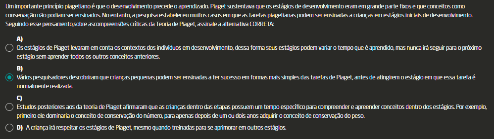 <p>Um importante princípio piagetiano é que desenvolvimento precede Piaget sustentava que estágios de desenvolvimento eram em grande parte fixos e que conceitos como conservação não podiam ser No entanto. a pesquisa estabeleceu muitos casos em que as tarefas piagetianas podem ser ensinadas a crianças em estágios iniciais de desenvolvimento. Seguindo esse pensamento,sobre ascompreensões críticas da Teoria de Piaget, assinale a alternativa CORRETA: A) Os estágios de Piaget levaram em conta os contextos dos indivíduos em desenvolvimento, dessa forma seus estágios podem variar tempo que é aprendido, mas nunca irá seguir para próximo estágio todos outros conceitos anteriores. B) Vários pesquisadores descobriram que crianças pequenas podem ser ensinadas a ter sucesso em formas mais simples das tarefas de Piaget, antes de atingirem estágio em que essa tarefa é normalmente C) Estudos posteriores aos da teoria de Piaget afirmaram que as crianças dentro das etapas possuem um tempo específico para compreender e apreender conceitos dentro dos Por exemplo, primeiro ele dominaria conceito de conservação do para apenas depois de um ou dois anos conceito de conservação do peso. D) A criança irá respeitar estágios de Piaget, mesmo quando treinadas para se aprimorar em outros estágios.</p>