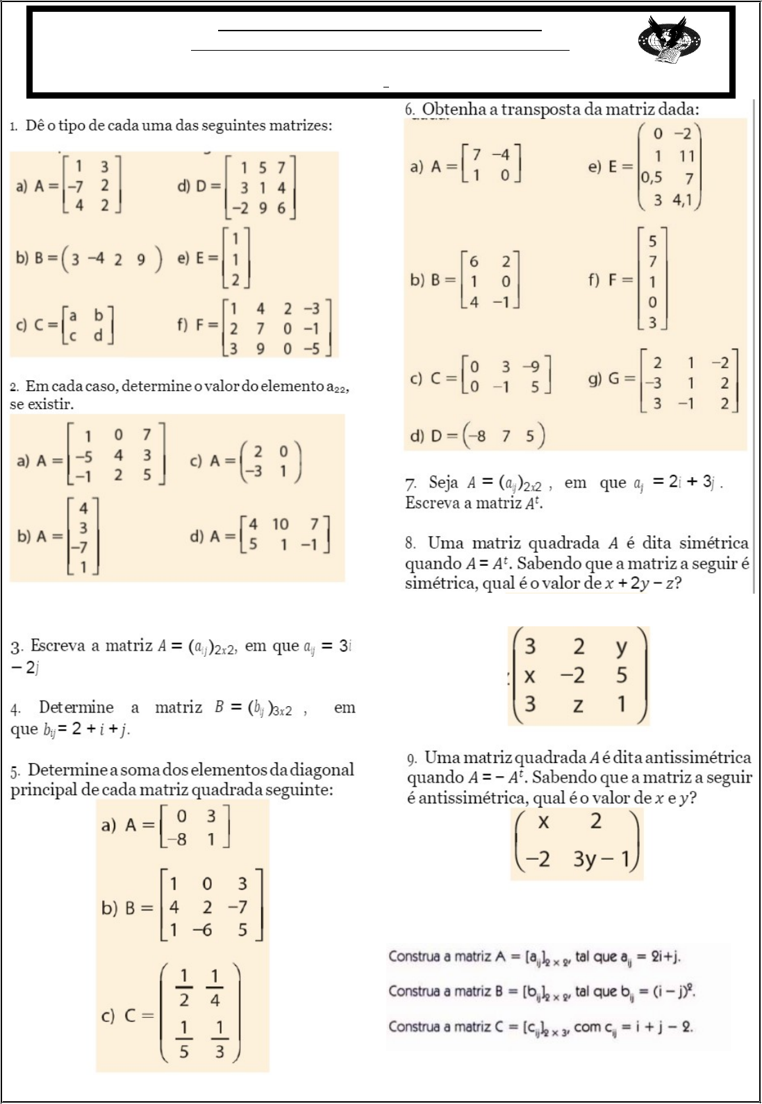 <p>EXERCÍCIOS DE MATEMÁTICA</p><p>Instituto de Educação Eliana Duarte da Silva Breijão</p><p>Aluno(a):____________________________________Data: ______________</p><p>Turma: _ Valor: _,0__ Bimestre:_ 4° Nota:___ Professora: Waleska</p><p>10 - As vendas em uma loja de departamentos em relação aos produtos bolsa, sapato e cintos, no primeiro trimestre de determinado ano podem ser expressas pela tabela a seguir.</p><p>Janeiro</p><p>Fevereiro</p><p>Março</p><p>Bolsa</p><p>20000</p><p>18000</p><p>23000</p><p>Sapato</p><p>17500</p><p>23000</p><p>22000</p><p>Cinto</p><p>12350</p><p>12000</p><p>15000</p><p>a) Escreva a matriz que representa a tabela mostrada.</p><p>b) Qual a sua ordem (indique linhas e colunas: Amxn)?</p><p>c) Que elemento ocupa a posição a23?</p><p>11 – Escreva as matrizes de acordo com as relações entre as posições i e j.</p><p>a) A = (aij)2x3, onde aij = 2i – j b) B = [bij]2x2, onde bij =</p><p>12 - (UFRJ) Considere a matriz A =em que aij representa quantas unidades do material j serão empregados para fabricar uma roupa do tipo i em uma confecção que vai fabricar 3 tipos de roupas utilizando materiais diferentes.</p><p>a) Quantas unidades do material 3 serão empregados na confecção de uma roupa do tipo 2?</p><p>b) Calcule o total de unidades do material 1 que será empregado para fabricar cinco roupas do tipo 1, quatro</p><p>roupas do tipo 2 e duas roupas do tipo 3.</p><p>13- Observando o quadrado, com lado medindo 1, da figura, construa uma matriz 4x4 tal que aij é a distância entre os vértices i e j.</p><p>14- (Curso Impacto – PA) Uma rede é composta por cinco lojas, numeradas de 1 a 5. A tabela a seguir representa o faturamento, em reais, de cada loja nos quatro primeiros dias de janeiro:</p><p>a) Qual foi o faturamento da loja 3 no dia 2?</p><p>b) Qual foi o faturamento de todas as lojas no dia 3?</p><p>c) Qual o faturamento da loja 1 nos 4 dias?</p><p>15- Realizado um estudo sobre a aceitação de dois novos modelos de veículos nos quatros primeiros dias de fevereiro, foram obtidos os seguintes resultados: A = e B =</p><p>- A matriz A descreve o desempenho da loja A, de modo que cada elemento aij é o número de unidades vendidas do modelo i no dia j.</p><p>- A matriz B descreve o desempenho da loja B, de modo que cada elemento bij é o número de unidades vendidas do modelo i no dia j.</p><p>a) Quantas unidades do modelo 2 foram vendidas no dia 3 de fevereiro pela loja A?</p><p>b) No período considerado, construa uma matriz que descreva, dia a dia, as vendas de cada modelo nas duas lojas juntas.</p><p>image6.png</p><p>image7.png</p><p>image1.jpeg</p><p>image2.png</p><p>image3.png</p><p>image4.png</p><p>image5.wmf</p><p>î</p><p>í</p><p>ì</p><p>¹</p><p>-</p><p>=</p><p>+</p><p>j</p><p>i</p><p>j</p><p>i</p><p>j</p><p>i</p><p>j</p><p>i</p><p>,</p><p>2</p><p>,</p><p>oleObject1.bin</p>