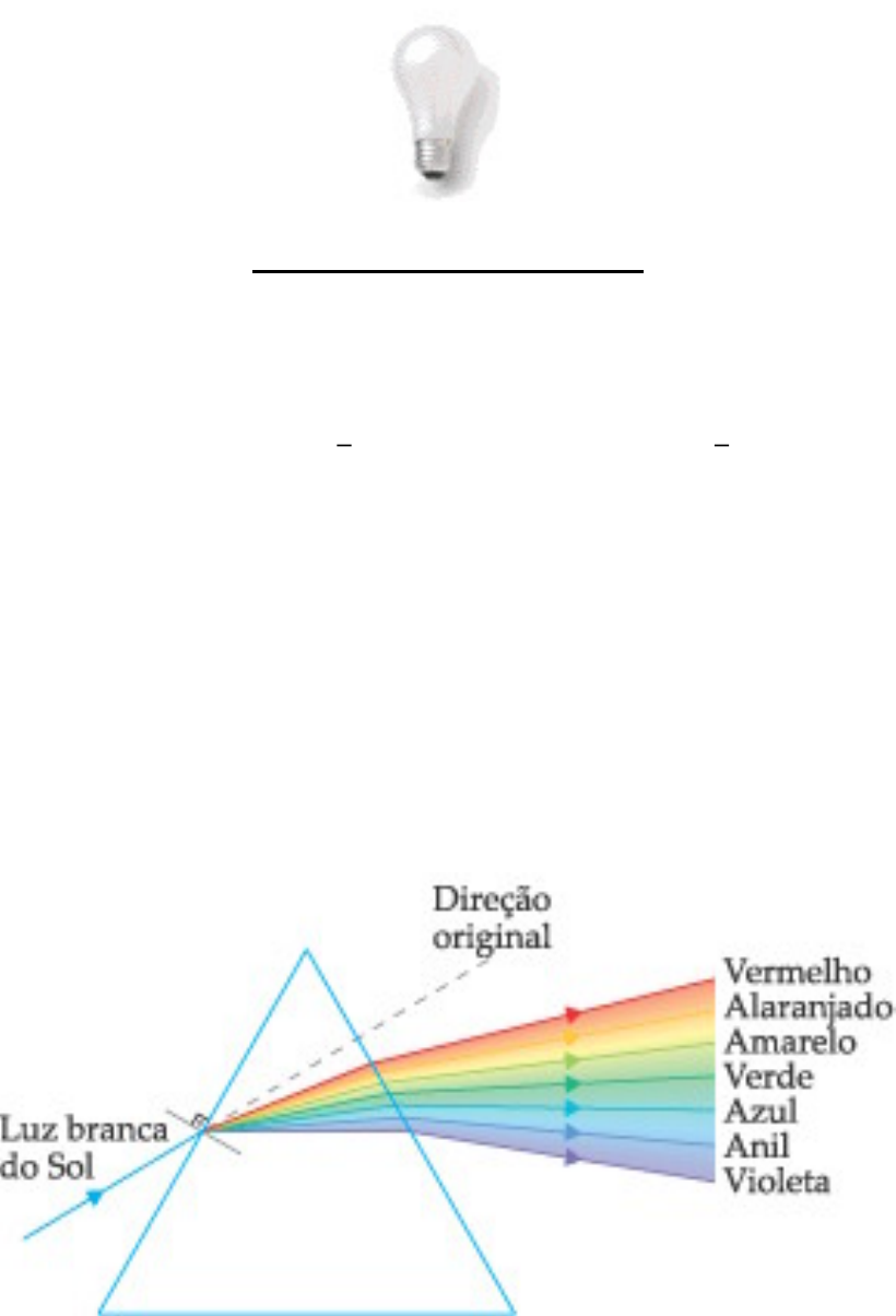 <p>Introdução à Óptica</p><p>Luz</p><p>A luz é uma forma de energia que se propaga nos meios materiais e também</p><p>no vácuo. A luz emitida pelo Sol estrela mais próxima da Terra chega a nós</p><p>em 8 minutos e 20 segundos, percorrendo 150 milhões de quilômetros a uma</p><p>velocidade de 300 mil quilômetros por segundo.</p><p>Depois do Sol, a estrela mais próxima da Terra é a estrela alfa da constelação</p><p>de Centauro que se encontra a 4,3 anos-luz da Terra, isto é, a luz emitida pela</p><p>estrela alfa demora 4,3 anos para chegar à Terra.</p><p>A luz emitida pelo Sol é branca, uma luz policromática (várias cores) que pode</p><p>ser decomposta em luzes monocromáticas (uma só cor). As luzes</p><p>monocromáticas principais que compõem a luz branca são em número de sete, a</p><p>saber: vermelha, alaranjada, amarela, verde, azul, anil e violeta. Para</p><p>observarmos a decomposição da luz branca em suas cores componentes</p><p>principais, basta fazermos a luz solar incidir sobre um prisma ou sobre gotículas</p><p>de água (arco-íris).</p><p>Nos meios homogêneos e transparentes, a luz se propaga em linha reta. Para</p><p>representarmos a propagação retilínea da luz, utilizamos os raios de luz que são</p><p>linhas orientadas que representam a direção e o sentido de propagação da luz. O</p><p>conjunto de raios de luz constitui um feixe de luz. Assim, podemos ter feixe de luz</p><p>constituído por raios paralelos, convergentes ou divergentes.</p><p>Com base no conceito de raio de luz, podemos representar os três fenômenos</p><p>luminosos básicos: reflexão, refração e absorção.</p><p>A reflexão regular é obtida quando a luz incide sobre superfícies totalmente</p><p>polidas, como no caso dos espelhos; e a reflexão difusa é obtida em superfícies</p><p>ásperas, como no caso de uma parede pintada de branco.</p><p>3. A Cor de um Corpo</p><p>Vimos que os objetos que não possuem luz própria objetos iluminados são</p><p>vistos porque refletem difusamente a luz que neles incide. Quando iluminados por</p><p>uma luz policromática, um objeto pode não refletir todos os componentes da luz</p><p>incidente, absorvendo alguns deles. Assim, podemos afirmar que as cores com</p><p>que vemos os objetos correspondem às cores da luz refletida por eles.</p><p>A cor de um objeto é determinada pela luz que ele difunde.</p><p>Uma rosa é vermelha porque absorve todas as cores e reflete difusamente a</p><p>vermelha; pelo mesmo motivo a grama é verde, e um carro é azul.</p><p>Observada através de um vidro amarelo, uma parede branca fica amarela</p><p>porque o vidro colorido funciona como um filtro: absorve todas as cores exceto o</p><p>amarelo.</p><p>Um corpo é branco quando reflete todas as cores componentes da luz branca,</p><p>e um corpo é negro quando absorve todas as cores que nele incidem.</p><p>Vivemos num mundo de cores. No entanto, devemos lembrar que os objetos</p><p>coloridos que vemos ao nosso redor somente possuem essa cor porque são</p><p>iluminados com luz branca: luz do Sol ou de uma lâmpada. Mas, como veríamos,</p><p>por exemplo, a bandeira brasileira se ela fosse iluminada por uma fonte luminosa</p><p>que emitisse somente luz monocromática verde?</p><p>Sabemos que as cores da bandeira brasileira são verde, amarela, azul e</p><p>branca. Isto somente acontece quando a bandeira é iluminada com luz branca. Se</p><p>a iluminação for com luz verde, teremos:</p><p>a parte verde será vista verde;</p><p>as partes amarela e azul serão vistas negras (um objeto amarelo ou azul</p><p>absorve totalmente a luz verde);</p><p>a parte branca será vista verde (a luz verde é uma das componentes da luz</p><p>branca).</p><p>Portanto, a nossa percepção de cores depende da fonte de luz, da luz que é</p><p>refletida difusamente e da sensibilidade de nossos olhos em relação à luz refletida.</p><p>Vejamos um exemplo. Consideremos que um objeto iluminado com luz branca</p><p>absorva todos os seus componentes, com exceção da vermelha. Portanto, esse</p><p>objeto reflete, difusamente, somente a luz vermelha e, então, para nós, esse</p><p>objeto é vermelho. Se ele refletisse somente a luz azul, nós o enxergaríamos azul.</p><p>A faculdade que os corpos têm de difundir determinada luz é atribuída à</p><p>existência de pigmentos que absorvem especificamente certas radiações</p><p>monocromáticas.</p><p>Como você já deve ter estudado em Biologia, é graças aos pigmentos de</p><p>clorofila que as folhas exibem cor verde: a clorofila absorve todas as radiações</p><p>que compõem a luz branca, com exceção da verde.</p><p>Conceitos Básicos</p><p>As fontes de luz se classificam em dois tipos: fontes de luz primárias e fontes</p><p>de luz secundárias.</p><p>Corpos Luminosos (ou Fonte de Luz Primária): são os que emitem luz</p><p>própria. Por exemplo: o Sol, uma lâmpada elétrica incandescente ou fluorescente</p><p>e um lampião.</p><p>Corpos Iluminados (ou Fonte de Luz Secundária): são os que refletem a luz</p><p>proveniente de uma fonte de luz primária. Por exemplo: a Lua, uma parede de</p><p>uma sala que difunde no ambiente a luz recebida de uma lâmpada. A Lua e os</p><p>planetas são fontes secundárias de luz</p><p>Fonte de Luz Puntiforme</p><p>Uma fonte de luz é chamada de puntiforme quando as suas dimensões são</p><p>desprezíveis em relação à distância do objeto iluminado.</p><p>Por exemplo: uma vela longe do objeto iluminado.</p><p>Fonte de Luz Extensa</p><p>Uma fonte de luz é chamada de extensa quando suas dimensões são</p><p>consideráveis em relação à distância do objeto iluminado.</p><p>Exemplo: uma vela próxima ao objeto iluminado.</p><p>Meios Ópticos</p><p>Corpos opacos: são os corpos que impedem a passagem da luz. Exemplos:</p><p>madeira e metais.</p><p>Corpos transparentes: são os corpos que se deixam atravessar totalmente pela</p><p>luz.</p><p>Corpos translúcidos: são os corpos que se dei
