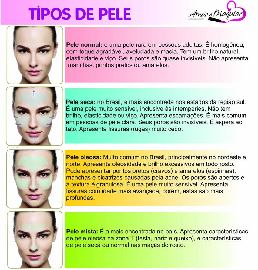 <p>1</p><p>2º MÓDULO - TIPOS DE PELE</p><p>São sete classificações: normal, oleosa, mista, seca, sensível, acneica e madura.</p><p>O tecido epitelial, mais conhecido como pele, é o maior e mais visível órgão do</p><p>corpo humano - corresponde a 16% do peso corporal. Ele é uma estrutura elástica, ao</p><p>mesmo tempo flexível e muito resistente, que envolve toda a superfície do corpo.</p><p>Mais do que um simples invólucro, a pele é um órgão extremamente complexo,</p><p>responsável por várias funções vitais. Além de proteger o organismo contra infecções,</p><p>Ana Fonseca</p><p>Licenciado para - A</p><p>N</p><p>A</p><p>D</p><p>A</p><p>N</p><p>IE</p><p>LLE</p><p>M</p><p>O</p><p>T</p><p>A</p><p>F</p><p>O</p><p>N</p><p>S</p><p>E</p><p>C</p><p>A</p><p>- 45298529000171 - P</p><p>rotegido por E</p><p>duzz.com</p><p>2</p><p>doenças e outras agressões do ambiente, ela desempenha um papel fundamental no</p><p>controle da umidade e temperatura do corpo - o que, entre outras coisas, permite que</p><p>o ser humano se adapte aos mais diversos climas, inclusive os mais inóspitos.</p><p>A pele é também um termômetro preciso do estado geral de saúde do</p><p>organismo. Ela reage a fatores internos e externos, tais como alimentação, alterações</p><p>hormonais, ação do tempo, estresse, variações climáticas, poluição e radiação solar,</p><p>entre outros. A combinação desses agentes interfere diretamente no funcionamento e</p><p>também na aparência da pele. Por isso mesmo, para mantê-la sempre saudável e</p><p>bonita é necessário corrigir e prevenir eventuais desequilíbrios - sejam eles intrínsecos</p><p>ou extrínsecos.</p><p>Quanto ao grau de oleosidade, a pele pode ser normal, seca ou oleosa. Mas,</p><p>apesar dessa divisão, todas as peles têm uma concentração maior de glândulas</p><p>sebáceas na zona T do que nas regiões laterais da face. Assim, todas as peles secas são</p><p>menos secas na região médio-facial, o que também ocorre com as peles normais e</p><p>oleosas. A pele acneica não corresponde a um tipo especial de pele, e sim uma doença</p><p>- ou predisposição a ela - própria das pessoas de pele oleosa: a acne.</p><p>Cada pessoa tem seu próprio metabolismo, que varia de acordo com a herança</p><p>genética, os hábitos alimentares, os ambientes em que vive, entre outros fatores. A</p><p>pele reage a essas condições biológicas e climáticas e se constitui de formas distintas:</p><p>pode ser seca, oleosa, normal, acneica, ou sensível.</p><p>PELE OLEOSA</p><p>O nome não nega: é a pele que produz maior quantidade de secreções sebáceas</p><p>e sudoríparas e, por isso, tem aparência espessa, brilhante e úmida. Além disso, os</p><p>seus poros são visíveis, pois estão sempre dilatados, o que facilita o aparecimento de</p><p>cravos, principalmente no rosto, e cistos em algumas regiões do corpo. Pele oleosa</p><p>pode resultar em acnes, cravos e espinhas.</p><p>Seu pH é alcalino. Devido à superatividade das glândulas, esse tipo de pele</p><p>suporta melhor as ações de agentes externos e resiste mais à ação do tempo.</p><p>É importante saber que é comum as pessoas com pele oleosa ou normal terem</p><p>algumas partes do corpo ressecadas, como os pés, joelhos e cotovelos.</p><p>Normalmente a pele oleosa é aquela que apresenta um aspecto brilhante</p><p>devido à hiper produção de sebo pelas glândulas sebáceas. Alguns aspectos tornam a</p><p>textura da pele oleosa grosseira, como orifícios dos folículos pilosos (pelos) e os poros</p><p>dilatados, secreções sebáceas e sudoríparas abundantes, superfície cutânea untuosa e</p><p>úmida.</p><p>Licenciado para - A</p><p>N</p><p>A</p><p>D</p><p>A</p><p>N</p><p>IE</p><p>LLE</p><p>M</p><p>O</p><p>T</p><p>A</p><p>F</p><p>O</p><p>N</p><p>S</p><p>E</p><p>C</p><p>A</p><p>- 45298529000171 - P</p><p>rotegido por E</p><p>duzz.com</p><p>3</p><p>As consequências ultrapassam largamente o simples ponto de vista estético, já</p><p>que o excesso de produção glandular muitas vezes conduz à hiperqueratinização, que</p><p>leva a formação de micro cravos pela oclusão do orifício pilo sebáceo.</p><p>Estes micro cravos são os locais preferidos para o desenvolvimento acelerado</p><p>da flora bacteriana, que através da liberação de uma enzima chamada lípase, vai</p><p>digerir este sebo (os triglicerídeos), transformando-os prematuramente em ácidos</p><p>graxos livres, formadores de reações inflamatórias, e posteriormente acne em seus</p><p>diversos graus.</p><p>Tendência ao aparecimento de cravos e espinhas, brilho excessivo,</p><p>envelhecimento retardado também são características marcantes da pele oleosa. Além</p><p>disso, apresenta marcas de expressões grossas, linhas profundas, alta reação aos</p><p>cosméticos habituais e a peelings.</p><p>Confira alguns cuidados para combater a oleosidade da pele:</p><p>- Evite usar hidratantes nas áreas de maior oleosidade, eles raramente são</p><p>necessários. Mesmo que a pele pareça ressecada logo após o banho, não se preocupe,</p><p>em pouco tempo a oleosidade natural vai retornar.</p><p>- Procure não lavar a face com água quente, pois isso estimula a produção de</p><p>mais oleosidade.</p><p>- Tente não lavar seu rosto varias vezes ao dia. Esta prática estimulará mais a</p><p>produção do sebo, tornando sua pele cada vez mais oleosa. Lavar o rosto duas vezes</p><p>ao dia já é suficiente.</p><p>- Beba bastante água e coma frutas, legumes e verduras.</p><p>- Só use filtros solares ou cosméticos com o rótulo oil free (sem óleo), ou aquele</p><p>recomendado por seu médico.</p><p>- Evite bebidas alcoólicas e tudo que for muito calórico.</p><p>- Se, além de oleosa, a pele descama, fica avermelhada ou com coceira, procure</p><p>um dermatologista, você pode estar com dermatite seborreica. Neste caso somente</p><p>um especialista poderá prescrever medicações específicas.</p><p>PELE 