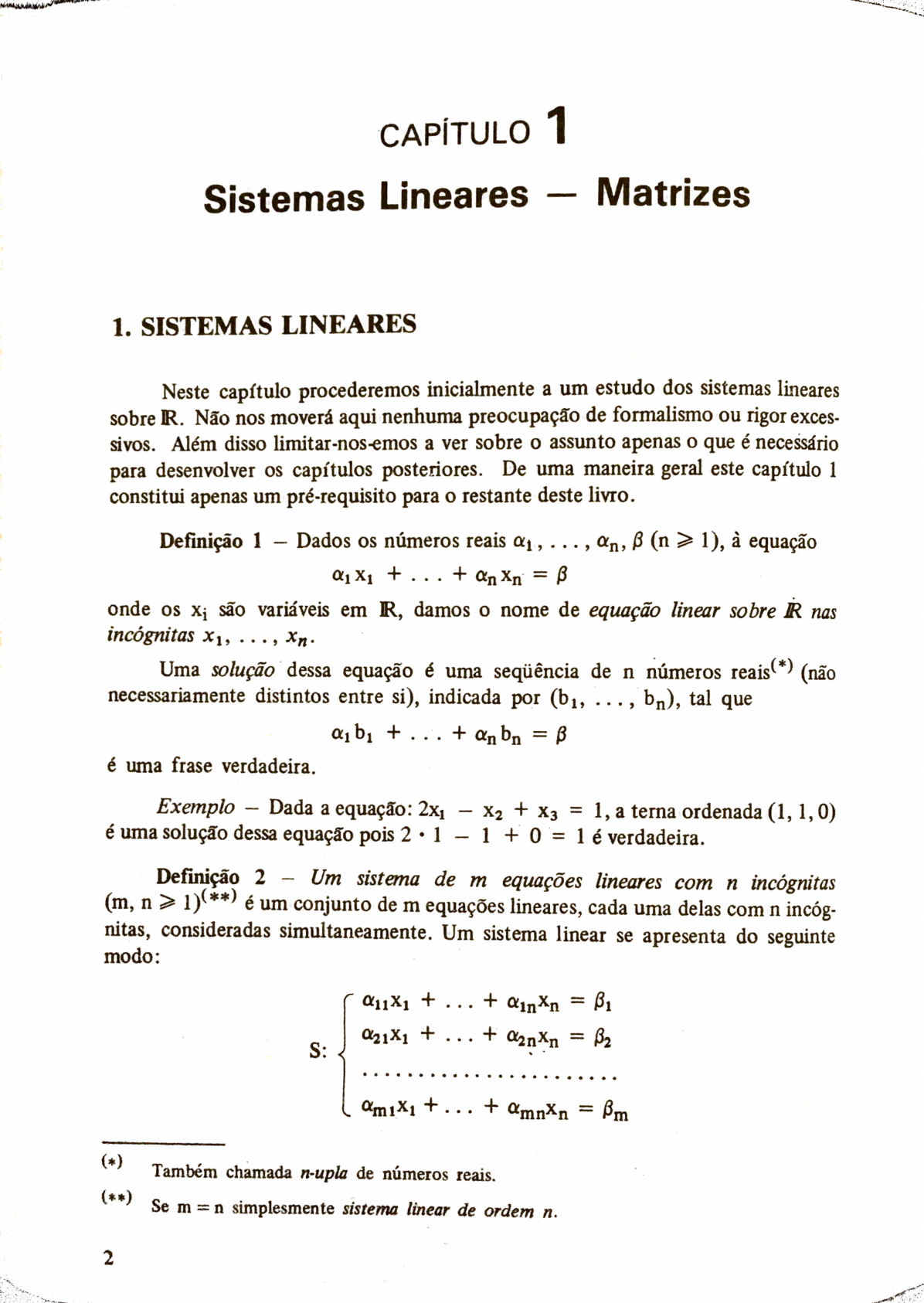 <p>CAPÍTULO 1 Sistemas Lineares - Matrizes 1. SISTEMAS LINEARES Neste capítulo procederemos inicialmente a um estudo dos sistemas lineares sobre IR. Não nos moverá aqui nenhuma preocupação de formalismo ou rigor exces- sivos. Além disso limitar-nos-emos a ver sobre o assunto apenas o que é necessário para desenvolver os capítulos posteriores. De uma maneira geral este capítulo 1 constitui apenas um pré-requisito para o restante deste livro. Definição 1 - Dados os números reais an, B (n > 1), à equação + . + = B onde os Xj são variáveis em R, damos o nome de equação linear sobre R nas incógnitas Uma solução dessa equação é uma de n números reais(*) (não necessariamente distintos entre si), indicada por , bn), tal que é uma frase verdadeira. Exemplo Dada a equação: 2x1 - X2 + X3 = 1, a terna ordenada (1, 1,0) é uma solução dessa equação pois 2 1 - 1 + 0 = 1 é verdadeira. Definição 2 - Um sistema de m equações lineares com n incógnitas (m, n > 1)(**) é um conjunto de m equações lineares, cada uma delas com n incóg- nitas, consideradas simultaneamente. Um sistema linear se apresenta do seguinte modo: A11X1 + B1 A21X1 = S: + . . + = Bm (*) Também chamada n-upla de números reais. (**) Se m = n simplesmente sistema linear de ordem n. 2</p><p>Uma solução do sistema acima é uma n-upla de números reais que é solução de cada uma das equações do sistema. Exemplo Dado o sistema - = 6 uma solução de S é (0, 3, 4). Notemos que essa solução não é única: a terna , 5 , também é solução de S. Se, no sistema S, tivermos B1=B2 = ... = Bm = 0, o sistema S será homo- gêneo. A n-upla (0, 0,..., 0) é solução de S neste caso e por isso todo sistema homogêneo é compatível, de acordo com a definição 3 a seguir. A solução (0,0, 0) chama-se solução trivial do sistema homogêneo. Definição 3 Dizemos que um sistema linear S é incompatível se S não admite nenhuma solução. Um sistema linear que admite uma única solução é chamado compatível determinado. Se um sistema linear S admitir mais do que uma solução então ele recebe o nome de compatível Exemplos 1) Um sistema do tipo A11X1 0x1 +... = Bi am1X1 +... + = Bm é necessariamente incompatível: como nenhuma n-upla é solução da equação i-ésima, então nenhuma n-upla é solução do sistema. 2) Um sistema do tipo X1 X2 Xn = Bn é compatível determinado e é a sua solução única. 3</p><p>sistema { 2x - 2y é indeterminado pois, conforme vimos atrás, as ternas 5 são soluções deste sistema. Conforme veremos, existem infinitas soluções deste sistema. Tente achar uma. 2. SISTEMAS EQUIVALENTES Seja S um sistema linear de m equações com n incógnitas. Interessa-nos considerar os sistemas que podem ser obtidos de S de uma das seguintes maneiras: (I) Permutar duas das equações de S. É evidente que se indicar o sistema assim obtido, então toda solução de S1 é solução de S e vice-versa. (II) Multiplicar uma das equações de S por um número real # 0. Indicando por o sistema assim obtido mostremos que toda solução de é solução de S e vice-versa. Devido a (I) podemos supor que a equação multiplicada seja a primeira. Como as demais equações de S e S1 coincidem basta verificar nossa afirmação quanto à primeira equação. Se bn) é uma solução de S (conforme definição 2), então: + . . (1) Multiplicando por esta igualdade obteremos: + + NB1 (2) o que mostra que bn) é também solução da primeira equação de S1. Por outro lado, se bn) é solução de S1, então a igualdade (2) é verdadeira. Dividindo (2) por A obtemos (1). Portanto bn) pertence ao conjunto das soluções de S. 4</p><p>(III) Somar a uma das equações do sistema uma outra equação desse sistema multiplicada por um número real. Deixamos como exercício a verificação de que o sistema: A11X1 + S1: + + ... + am1X1 + + amnXn = Bm assim obtido e o sistema S ou são ambos incompatíveis ou admitem ambos as mesmas soluções. Sugerimos ao leitor que faça alguns casos particulares antes de tentar o caso geral. Definição 4 Dado um sistema linear S, uma qualquer das modificações explicadas acima em e (III) que se faça com esse sistema recebe o nome de ope- ração elementar com S. Se um sistema linear foi obtido de um sistema linear S através de um número finito de operações elementares, dizemos que S1 é equivalen- te a S. Notação: É fácil ver que para a relação ~ assim definida valem as seguintes propriedades: S1 (simétrica); (c) S1 ~ S e (transitiva). Convém frisar, por último, que em virtude do que já vimos neste parágrafo, se S1 ~ S, então toda solução de S é solução de S1 e vice-versa. Em particular, se S1 é incompatível, o mesmo acontece com S. Desta forma criamos um mecanismo extremamente útil para a procura de solu- ções de um sistema linear S. Procuramos sempre encontrar um sistema linear equivalente a S e que seja "mais simples". Veremos um exemplo. Considere- mos o sistema: X y + = 1 S: 2x - y + Z = 4 X - 2y + 2z = 0 5</p><p>Para estudar este sistema deve-se aplicar a ele uma série de operações ele- mentares visando fazer com que o número de coeficientes iniciais nulos seja maior em cada equação (a partir da segunda) do que na precedente. Vejamos como se pode fazer X - y + X - 1 X -y+z= - 1 2x - y + ~ { ** y - 2 ~ y - 2 - 1 * Multiplicamos por - 2 a primeira equação e somamos o resultado com a segunda equação; multiplicamos a primeira equação por -1 - e somamos com a terceira. Somamos a segunda equação com a terceira. Como este último sistema é incompatível, o mesmo acontece com o sistema S dado inicialmente. 3. SISTEMAS ESCALONADOS Consideremos um sistema linear de m equações com n incógnitas que tem o seguinte aspecto: + B1 + + S: + + = onde Se tivermos 1 < diremos que S é um sistema li- near escalonado. É claro que se 1=0, a última equação de S pode ser elimina- da do sistema. Logo, num sistema escalonado o número