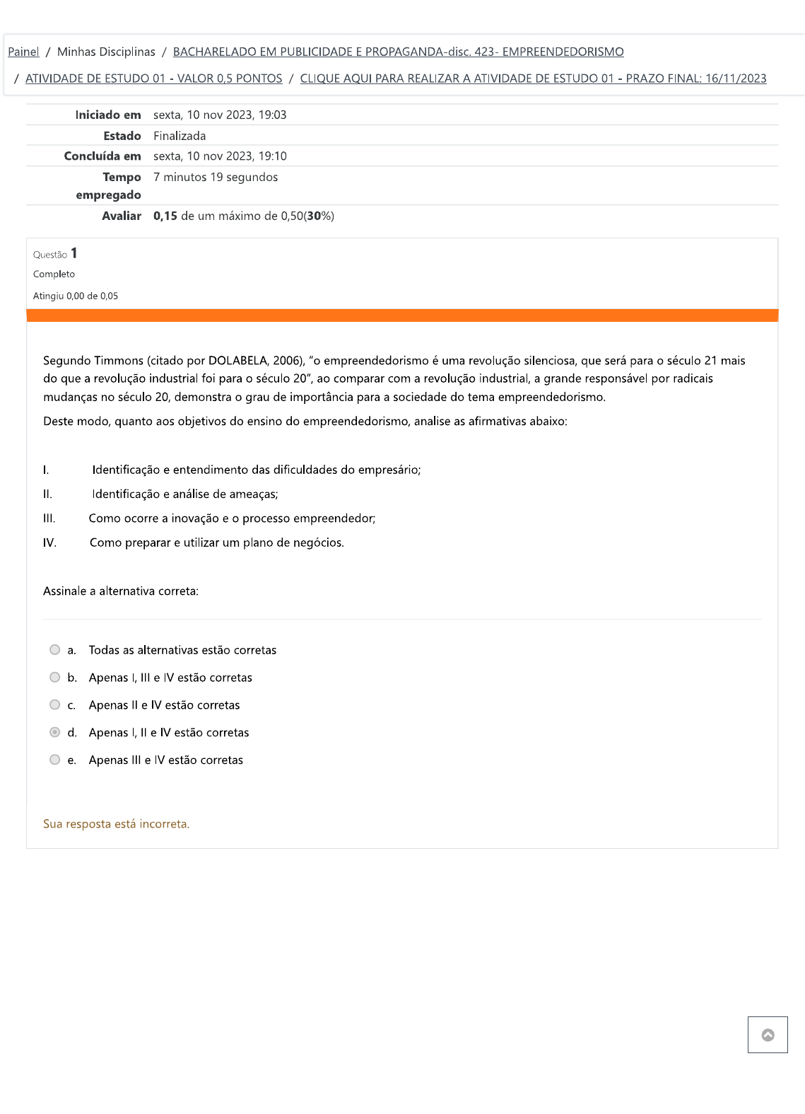 <p>Painel / Minhas Disciplinas / BACHARELADO EM PUBLICIDADE E 423- EMPREENDEDORISMO / ATIVIDADE DE ESTUDO 01 - VALOR 0,5 PONTOS / CLIQUE PARA REALIZAR A ATIVIDADE DE ESTUDO 01 - PRAZO FINAL: 16/11/2023 Iniciado em sexta, 10 nov 2023, 19:03 Estado Finalizada Concluída em sexta, 10 nov 2023, 19:10 Tempo 7 minutos 19 segundos empregado Avaliar 0,15 de um máximo de 0,50(30%) Questão 1 Completo Atingiu 0,00 de 0,05 Segundo Timmons (citado por DOLABELA, 2006), "o empreendedorismo é uma revolução silenciosa, que será para o século 21 mais do que a revolução industrial foi para o século 20", ao comparar com a revolução industrial, a grande responsável por radicais mudanças no século 20, demonstra o grau de importância para a sociedade do tema empreendedorismo. Deste modo, quanto aos objetivos do ensino do empreendedorismo, analise as afirmativas abaixo: I. Identificação e entendimento das dificuldades do empresário; II. Identificação e análise de ameaças; III. Como ocorre a inovação e o processo empreendedor; IV. Como preparar e utilizar um plano de negócios. Assinale a alternativa correta: a. Todas as alternativas estão corretas b. Apenas I, III e IV estão corretas C. Apenas e IV estão corretas d. Apenas I, e IV estão corretas e. Apenas III e IV estão corretas Sua resposta está incorreta.</p><p>Questão 2 Completo Atingiu 0,00 de 0,05 Atualmente o empreendedorismo já tem sido centro das políticas na maioria dos países e existem muitas ações relacionadas com o empreendedorismo e inovações tecnológicas como, por exemplo, programas de incubação de empresas e parques tecnológicos, programas e incentivos governamentais para promover a inovação e transferência de tecnologia, entre outros. Não obstante, analise as afirmativas abaixo e classifique-as com "V" para verdadeiro e "F" para falso: ( ) empreendedor é a pessoa que destrói a ordem econômica existente graças à introdução no mercado de novos produtos e serviços, pela criação de novas formas de gestão ou pela exploração de novos recursos, materiais e tecnologias. ( ) empreendedor é aquele que cria negócios, que inova dentro da empresa já construída, que detecta uma oportunidade e cria um negócio para capitalizar sobre ele, assumindo riscos calculados. ( ) empreendimento é o envolvimento de pessoas e processos que, em conjunto, levam à transformação de ideias em oportunidades. ( ) empreendedorismo nunca tem a ver com criar uma nova forma de uso dos recursos nacionais, em que eles sejam deslocados de seu emprego tradicional e sujeitos a novas combinações. Assinale a alternativa correta: a. F, V, F, V b. V, V, V, V C. V, F, F, V d. F, F, F, F e. Sua resposta está incorreta.</p><p>Questão 3 Completo Atingiu 0,00 de 0,05 A utilização do termo "empreendedorismo" é atribuído a Richard Cantillon. Assim, os empreendedores de sucesso são visionários, sabem tomar decisões, são indivíduos que fazem a diferença, sabem explorar ao máximo as oportunidades. Dito isto, analise as afirmativas abaixo: I. O primeiro uso do termo empreendedorismo foi por Marco Pólo, que assinou um contrato com um homem que possuía dinheiro que hoje é mais conhecido como capitalista, para vender as mercadorias deste. II. Schumpeter descreveu ainda o empreendedor como responsável por processos de "destruição criativa", que resultaram na criação de novos métodos de produção, novos produtos e novos mercados. III. A essência do empreendedorismo está na percepção e aproveitamento das novas oportunidades no âmbito de negócios. IV. Em 1985 com Pinchot foi introduzido o conceito de Intra empreendedor, uma pessoa empreendedora dentro da organização a que pertence. Assinale a alternativa correta: a. Apenas II e IV estão corretas b. Apenas II, III e IV estão corretas C. Apenas I, e III estão corretas d. Todas as alternativas estão corretas. e. Apenas I, e IV estão corretas Sua resposta está incorreta.</p><p>Questão 4 Completo Atingiu 0,00 de 0,05 Segundo Peter Drucker, "o trabalho específico do empreendedorismo numa empresa de negócios, é fazer os negócios de hoje capazes de fazer o futuro, transformando-se em um negócio diferente". "Empreendedorismo não é nem ciência, nem arte. É uma prática." Analise as afirmativas abaixo e classifique-as com "V" para verdadeiro e "F" para falso: ( ) A decisão de tornar-se empreendedor pode ocorrer aparentemente por acaso. Mas na verdade, essa decisão ocorre devido fatores externos, sociais e ambientais, e aptidões pessoais. ( ) O sucesso de um empreendimento inovador não depende de "mágica" e sim de uma série de fatores e condições - tanto pessoais, como do negócio - que o empreendedor deve levar em consideração antes de iniciá-lo. ( ) Muitas vezes, as pessoas motivadas pela ambição de ter dinheiro, condições para adquirir valiosos bens, melhores roupas, uma busca por melhores moradias e dar boas condições para si e para seus entes mais próximos, são estas as pessoas que sonham em ter seu próprio negócio e muitas delas acabam virando por questão de decisão de melhorias um empreendedor. ( ) A pessoa deve procurar formar uma cultura empreendedora primeiramente dentro dela, e de posse desta formação fazer uma autoanálise, despertando-a para a sua função de pessoa executora na transformação de conhecimento em riquezas para a sociedade, para comércio e principalmente para ele. Assinale a alternativa correta: a. V, V, F, b. V, V, V C. F, F, V, V d. F, F, F, F e. F, V, F, V Sua resposta está incorreta.</p><p>Questão 5 Completo Atingiu 0,05 de 0,05 mundo atualmente tem passado por várias transformações, onde as inovações mudaram o estilo de vida das pessoas. Por trás dessas inovações existem pessoas ou equipes, com características especiais. São pessoas visionárias, que questionam, arriscam, querem algo diferente. São os chamados empreendedores. Diante disso, analise as afirmativas abaixo: I. A pessoa qu