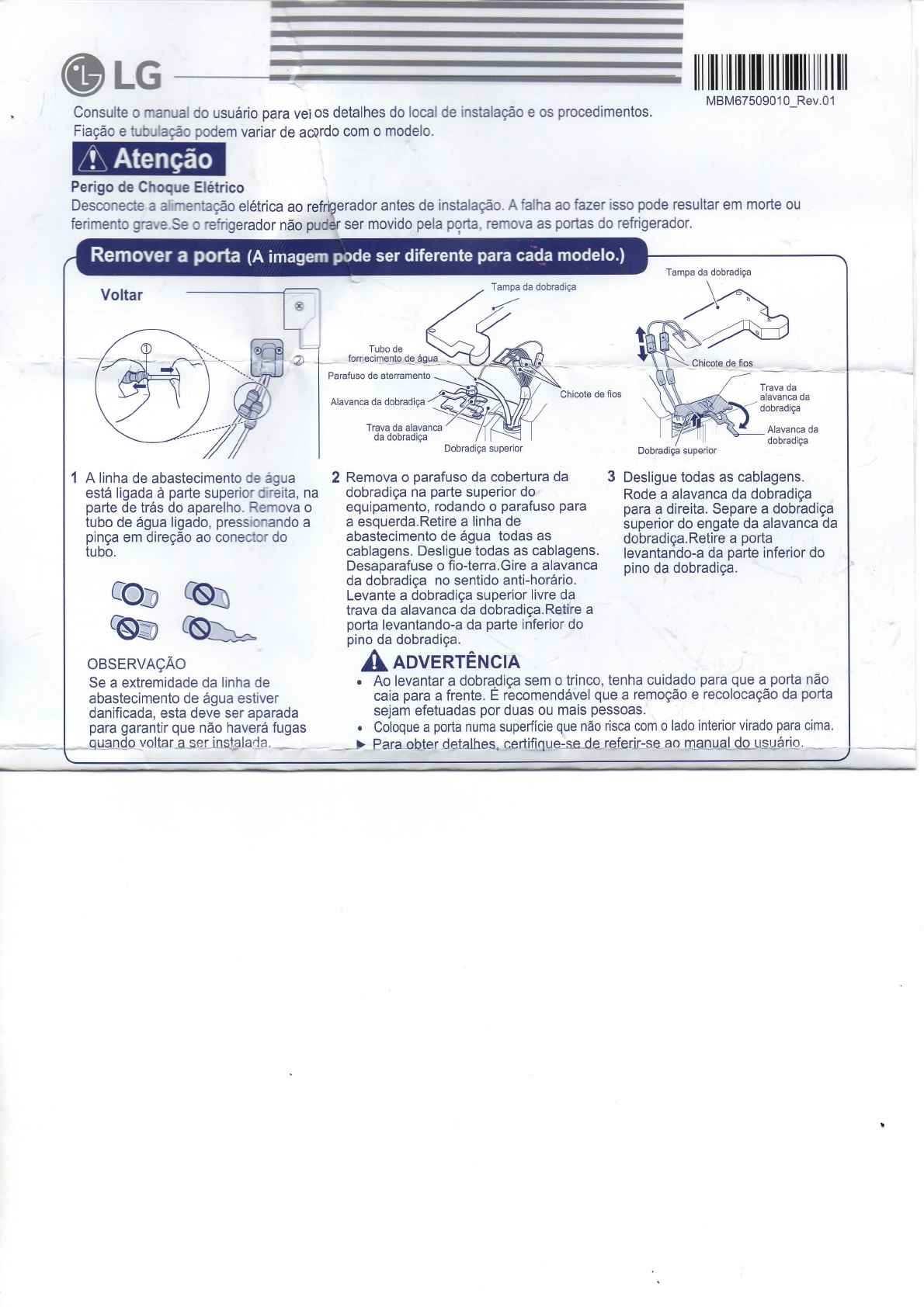 <p>⑤」G</p><p>Consulte o manual do usu釦o para vel OS detaihes do Iocal de instaia辞O e OS ProCedimentos"</p><p>Fia9aO e tubula9aO POdem variar de ac寄rdo com o modeIo・</p><p>Perigo de Choque E書6請co</p><p>Desconecte a a=menta車O e16trica ao 「e什</p><p>fchmento g「ave,Se o 「e師ge「ado「 nao pud</p><p>1 A iinha de abastecimento de agua</p><p>esta "gada a parte superio「 d主「eita, na</p><p>Parte de tras do apareiho, Remova o</p><p>tubo de agua iigado, PreSSionando a</p><p>Pjn9a em dire9aO aO COneCtO「 do</p><p>tub〇〇</p><p>匹国書匝国</p><p>懲鞄 ⑥二女</p><p>O BSE RVACÅo</p><p>Se a extremidade da iinha de</p><p>abastecimento de agua estiver</p><p>音i剛1=音看=!1 1看!看11剛</p><p>MBM67509010 Rev.01</p><p>「ado「 antes de instalaeao. Afalha ao faze「 isso pode 「esulta「 em morte ou</p><p>Se「 mOVido peia p9rta了emOVa aS POrtaS do 「e価ge「ado「</p><p>Dob「ad19a SuPe「lOr</p><p>2 Remova o pa「afuso da cobe巾ura da</p><p>dobradi9a na Parte SuPerior do</p><p>equipamento, 「Odando o parafuso para</p><p>a esque「da,Retire a linha de</p><p>abastecimento de agua todas as</p><p>Cablagens, Desiigue todas as cabiagens"</p><p>Desapa「afuse o fio-te「ra,Gire a aiavanca</p><p>da dobradi9a nO Sentido anti-ho「緬o.</p><p>Levante a dobradi9a SuPerio「 iivre da</p><p>t「ava da alavanca da dob「adi9a"Reti「e a</p><p>POrta levantando-a da parte infe「ior do</p><p>Pino da dobradi9a"</p><p>▲ ADVER丁ENCIA</p><p>Dob「ad19a SuPerlO「</p><p>3 Desiigue todas as cabiagens.</p><p>Rode a aIavanca da dobrad吟a</p><p>Pa「a a direita, Separe a dob「adi9a</p><p>SuPe「ior do engate da aiavanca da</p><p>dob「adi9a,Retire a po巾a</p><p>ievantando-a da pa巾e inferior do</p><p>Pino da dob「adi?a・</p><p>飴誓書言語鵠謹書罵葦霊露盤嵩捲窪普請</p><p>謹雑器冶講話露s .講話謹書「薄蒜i:器m。iad。int。「i。「Vi.ad。。a「a。ima,</p><p>」辿蔓坦吐J/Q蛙r遥S§山車しa如- _ト_葛__ _+ Parar班eLr de土a岨es. ce埋頓ue=S亀LdeJ-〔波並tsfLaO哩鎚蛙L出L±±S頭重・ _.</p><p>’捌elSIS OP SeZ創nd皿Se e 」e O</p><p>」eu岬ie別gd (’u!山C eluelueP叩XO」d∀) so」川9 e」ed</p><p>en6? eP 」OPeSueds旧OP 」OP巴r岬O e」事uco Odoo o e」n6as (Z</p><p>i叩eqe引Se e」!eu」O事e enb e co即O帥Oe ePe6時事Se</p><p>en6? eP OlueuJPe事Seqe eP lue6eqnl e enb ep es-e」n6ess∀ (し</p><p>elu執S!S OP SeZ訓nd叩Se ○ ○e O 」eu晒Ie E肥d</p><p>t]Oa∀SN]dS旧Oa OiOjNI</p><p>O叩eLueueOue eP SOiePO田切ed seued∀ *</p><p>’Oie6 seuo!O!Pe `cos副J elue山e叩e!O町nS</p><p>」e^!事Se O剥きn6ラビeS’○○S9」l</p><p>」elSe O則男ePOd en6? eP Odoo o」!制r!」d o ・</p><p>o写るビルeSqO</p><p>O事uelueuc○ue lueS SOIePO田e」ed seuedv.</p><p>圏</p><p>蒔</p><p>き〇」Od e 」叫ed巳s∂P e」Bd</p><p>0∀e∀^轡∃ S甘0</p><p>’0リ引OII-e」叫00 OPi事ueS Ou O-OPue」い</p><p>`捌Od ep iBO岬^ e事ueluO田O eXi] ’ウ</p><p>“⑤山田8</p><p>ep epeu!q山O〇 e∧elIO oun山OO eP」enbse</p><p>t3巳」ed no即e」的巳E」ed B5iP削qOP</p><p>ep e事Sn「e eP Ou!d o opuepo」 `o叫eued叩be</p><p>OP叩Od ep e」nlie eu e§u剣e掴t3 e書Sniv ’C</p><p>’① eueld e伸lIO e OPut2Z冊n `o鳴」OII</p><p>OP!lueS Ou eO」Od ep lt3O胆e^ e叩eluO山O e」!∧“乙</p><p>“os!d op sopenbepBu! S!e^ju SOe</p><p>OPV¥eP OP岡山O」duoo 」eS ePOd s印od sep</p><p>S!e^川SOP elSnre O ’OS!d o oput300う…串事Se</p><p>S岬luO」J S9d so soqlue enb ep es-enb!刑eO 轄</p><p>⑦</p><p>霞</p><p>丁</p><p>①</p>