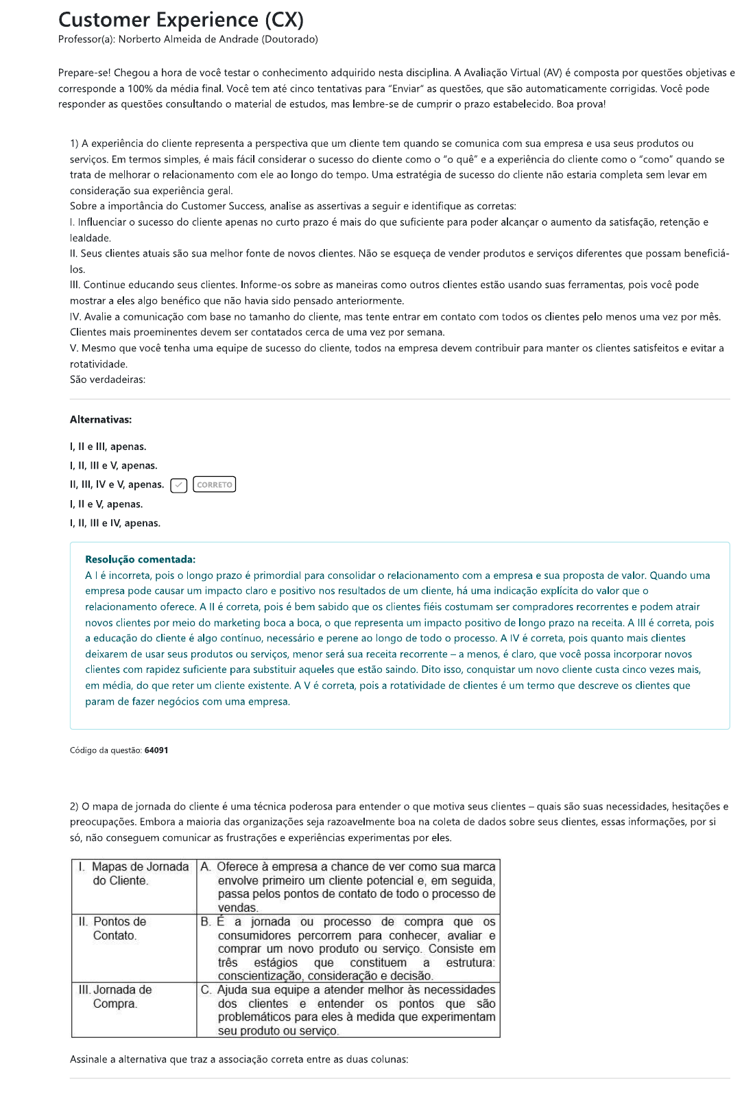 <p>Customer Experience (CX) Professor(a): Norberto Almeida de Andrade (Doutorado) Prepare-se! Chegou a hora de você testar o conhecimento adquirido nesta disciplina. A Avaliação Virtual (AV) é composta por questões objetivas e corresponde a 100% da média final. Você tem até cinco tentativas para "Enviar" as questões, que são automaticamente corrigidas. Você pode responder as questões consultando o material de estudos, mas lembre-se de cumprir o prazo estabelecido. Boa prova! 1) A experiência do cliente representa a perspectiva que um cliente tem quando se comunica com sua empresa e usa seus produtos ou serviços. Em termos simples, é mais fácil considerar o sucesso do cliente como o quê" e a experiência do cliente como o "como" quando se trata de melhorar o relacionamento com ele ao longo do tempo. Uma estratégia de sucesso do cliente não estaria completa sem levar em consideração sua experiência geral. Sobre a importância do Customer Success, analise as assertivas a seguir e identifique as corretas: I. Influenciar o sucesso do cliente apenas no curto prazo é mais do que suficiente para poder alcançar o aumento da satisfação, retenção e lealdade. II. Seus clientes atuais são sua melhor fonte de novos clientes. Não se esqueça de vender produtos e serviços diferentes que possam los. III. Continue educando seus clientes. Informe-os sobre as maneiras como outros clientes estão usando suas ferramentas, pois você pode mostrar a eles algo benéfico que não havia sido pensado anteriormente. IV. Avalie a comunicação com base no tamanho do cliente, mas tente entrar em contato com todos os clientes pelo menos uma vez por mês. Clientes mais proeminentes devem ser contatados cerca de uma vez por semana. V. Mesmo que você tenha uma equipe de sucesso do cliente, todos na empresa devem contribuir para manter os clientes satisfeitos e evitar a rotatividade. São verdadeiras: Alternativas: I, II e III, apenas. I, II, III e V, apenas. II, III, IV e V, apenas. CORRETO I, II e V, apenas. I, II, III e IV, apenas. Resolução comentada: A é incorreta, pois o longo prazo é primordial para consolidar o relacionamento com a empresa e sua proposta de valor. Quando uma empresa pode causar um impacto claro e positivo nos resultados de um cliente, há uma indicação explícita do valor que o relacionamento oferece. A é correta, pois é bem sabido que os clientes fiéis costumam ser compradores recorrentes e podem atrair novos clientes por meio do marketing boca a boca, o que representa um impacto positivo de longo prazo na receita. A III é correta, pois a educação do cliente é algo contínuo, necessário e perene ao longo de todo o processo. A IV é correta, pois quanto mais clientes deixarem de usar seus produtos ou serviços, menor será sua receita recorrente a menos, é claro, que você possa incorporar novos clientes com rapidez suficiente para substituir aqueles que estão saindo. Dito isso, conquistar um novo cliente custa cinco vezes mais, em média, do que reter um cliente existente. A V é correta, pois a rotatividade de clientes é um termo que descreve os clientes que param de fazer negócios com uma empresa. Código da questão: 64091 2) mapa de jornada do cliente é uma técnica poderosa para entender o que motiva seus clientes quais são suas necessidades, hesitações e preocupações. Embora a maioria das organizações seja razoavelmente boa na coleta de dados sobre seus clientes, essas informações, por si só, não conseguem comunicar as frustrações e experiências experimentas por eles. I. Mapas de Jornada A. Oferece à empresa a chance de ver como sua marca do Cliente. envolve primeiro um cliente potencial e, em seguida, passa pelos pontos de contato de todo o processo de vendas. II. Pontos de B. É a jornada ou processo de compra que os Contato. consumidores percorrem para conhecer, avaliar e comprar um novo produto ou serviço. Consiste em três estágios que constituem a estrutura: conscientização, consideração e decisão. III. Jornada de C. Ajuda sua equipe a atender melhor às necessidades Compra. dos clientes e entender os pontos que são problemáticos para eles à medida que experimentam seu produto ou serviço. Assinale a alternativa que traz a associação correta entre as duas colunas:</p><p>Alternativas: A; C; III B. B; A; III C. C; C; III A. B; C; III A. - C; A; III B. CORRETO Resolução comentada: Com táticas adequadas de mapas de jornada do cliente, pontos de contato e jornada de compra aplicadas a cada um dos três estágios da jornada do cliente, você poderá disponibilizar conteúdo por meio dos canais apropriados e mapear cada parte do conteúdo para o estágio correto no funil. Quando você estiver construindo a jornada do comprador, converse com sua equipe de vendas. Eles têm uma perspectiva única porque falam com clientes em potencial e clientes todos os dias. Código da questão: 64083 3) objetivo de um mapa da jornada do cliente é obter uma compreensão de como a experiência do cliente se desenvolve ao longo do tempo e mostrar isso em uma entrega que possa ser apreciada por todos na organização. Sobre essa perspectiva, analise as afirmativas a seguir e assinale-as com V (verdadeiro) ou F (falso): Muitas organizações não fizeram da experiência do funcionário uma prioridade para os líderes de RH, sendo muitas vezes delegada a uma pesquisa anual de engajamento do funcionário. A maioria das organizações não atribuiu a responsabilidade da experiência do funcionário a um executivo ou não alocou uma equipe para projetar e fornecer a experiência do funcionário. As empresas precisam atualizar suas ferramentas para envolver os funcionários de forma contínua, pelo menos com pesquisas de pulso, para ajudar a equipe de RH e a liderança a entender o que os talentos que empregam esperam. Muitas organizações ainda não reuniram o estabelecimento de metas, revisões de objetivos, aprendizagem, geração de