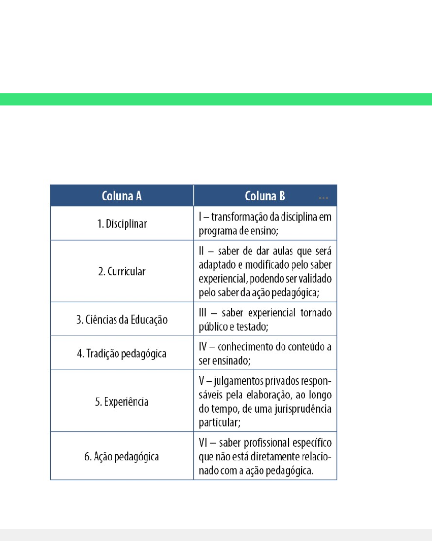 <p>Didática - Turma_001</p><p>Atividade de Sistematização – Unidade VI</p><p>Pergunta 3</p><p>0,17/0,17</p><p>Sabemos que o professor precisa ter conhecimentos essenciais que estão para além daqueles relacionados à sua área de pesquisa. Esse docente necessita ter conhecimentos relacionados à gestão escolar e atualização profissional. Gauthier e colaboradores (1998, p. 22,) retratam que os saberes necessários à prática docente se organizam da seguinte forma:</p><p>Relacione as colunas A e B</p><p>Mostrar opções de resposta</p><p>Comentários</p><p>Sabemos que o professor precisa ter conhecimentos essenciais que estão para além daqueles relacionados à sua área de pesquisa. Esse docente necessita ter conhecimentos relacionados à gestão escolar e atualização profissional.</p><p>Gauthier e colaboradores (1998, p. 22, grifos nossos) retratam que os saberes necessários à prática docente se organizam da seguinte forma:</p><p>· Disciplinar: conhecimento do conteúdo a ser ensinado;</p><p>· Curricular: transformação da disciplina em programa de ensino;</p><p>· Ciências da Educação: saber profissional específico que não está diretamente relacionado com a ação pedagógica;</p><p>· Tradição pedagógica: saber de dar aulas que será adaptado e modificado pelo saber experiencial, podendo ser validado pelo saber da ação pedagógica;</p><p>· Experiência: julgamentos privados responsáveis pela elaboração, ao longo do tempo, de uma jurisprudência particular;</p><p>· Ação pedagógica: saber experiencial tornado público e testado.</p><p>image1.png</p>