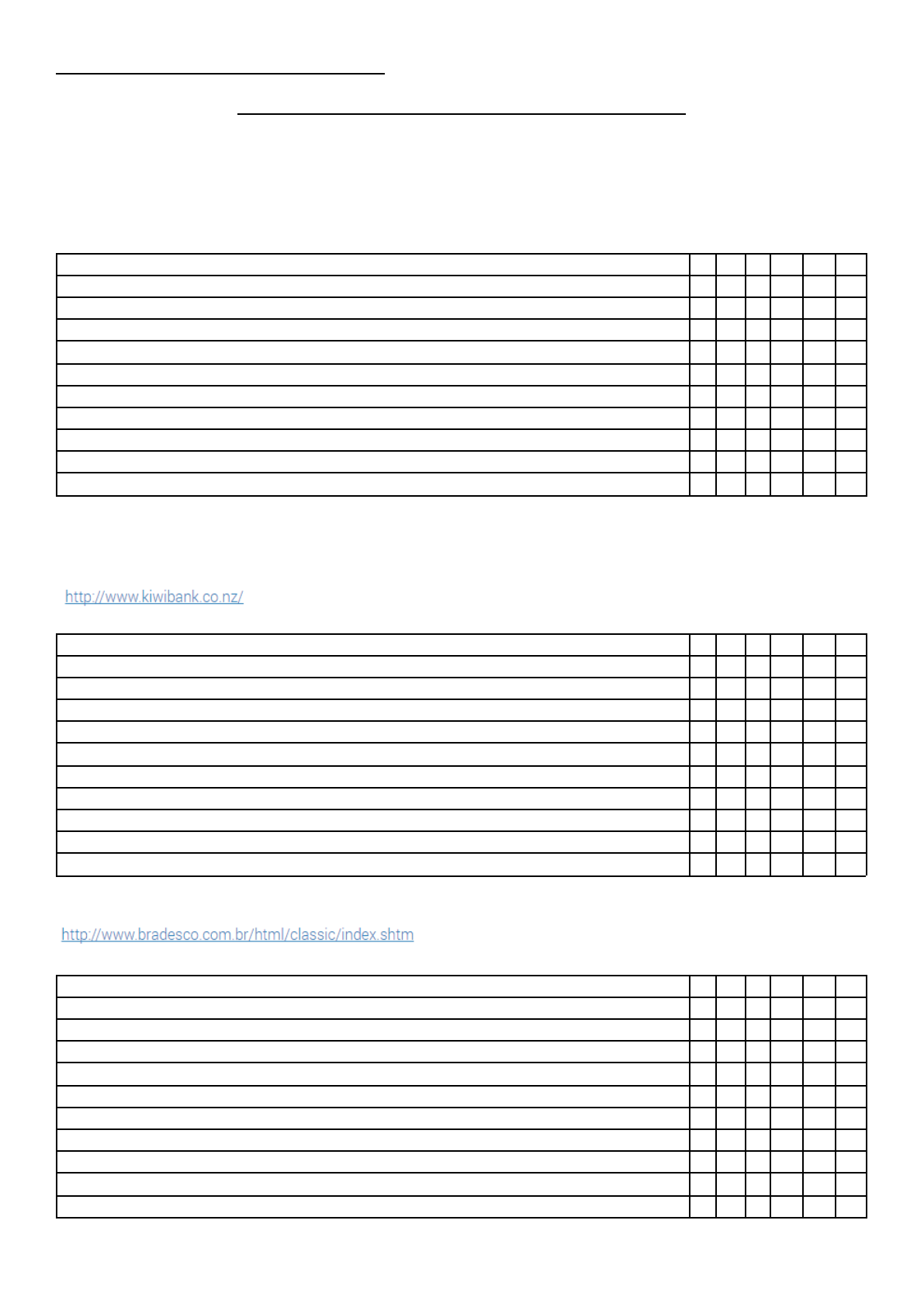 <p>Helen Cristina Bárbara -ciência da computação</p><p>Exercício prático: Análise Heurística e usabilidade de aplicativos</p><p>Exercício 1- Faça a análise heurística nos Sites abaixo, pontuando de</p><p>(0 ruim a 5 Excelente) conforme os critérios da tabela.</p><p>http://www.retailmenot.com/</p><p>HEURISTICA 0 1 2 3 4 5</p><p>Diálogo simples e natural X</p><p>Fala a língua do usuário X</p><p>Minimiza a carga cognitiva do usuário X</p><p>Consistência X</p><p>Feedback X</p><p>Saídas marcadas claramente</p><p>Atalhos X</p><p>Mensagens de erro precisas e construtivas X</p><p>Previne erros X</p><p>Ajuda e documentação X</p><p>http://www.kiwibank.co.nz</p><p>HEURISTICA 0 1 2 3 4 5</p><p>Diálogo simples e natural X</p><p>Fala a língua do usuário X</p><p>Minimiza a carga cognitiva do usuário X</p><p>Consistência X</p><p>Feedback X</p><p>Saídas marcadas claramente X</p><p>Atalhos X</p><p>Mensagens de erro precisas e construtivas X</p><p>Previne erros X</p><p>Ajuda e documentação X</p><p>HEURISTICA 0 1 2 3 4 5</p><p>Diálogo simples e natural X</p><p>Fala a língua do usuário X</p><p>Minimiza a carga cognitiva do usuário X</p><p>Consistência X</p><p>Feedback X</p><p>Saídas marcadas claramente X</p><p>Atalhos X</p><p>Mensagens de erro precisas e construtivas X</p><p>Previne erros X</p><p>Ajuda e documentação X</p><p>HEURISTICA 0 1 2 3 4 5</p><p>Diálogo simples e natural X</p><p>Fala a língua do usuário X</p><p>Minimiza a carga cognitiva do usuário X</p><p>Consistência X</p><p>Feedback X</p><p>Saídas marcadas claramente X</p><p>Atalhos X</p><p>Mensagens de erro precisas e construtivas X</p><p>Previne erros X</p><p>Ajuda e documentação X</p><p>HEURISTICA 0 1 2 3 4 5</p><p>Diálogo simples e natural X</p><p>Fala a língua do usuário X</p><p>Minimiza a carga cognitiva do usuário X</p><p>Consistência X</p><p>Feedback X</p><p>Saídas marcadas claramente X</p><p>Atalhos X</p><p>Mensagens de erro precisas e construtivas X</p><p>Previne erros X</p><p>Ajuda e documentação X</p><p>HEURISTICA 0 1 2 3 4 5</p><p>Diálogo simples e natural X</p><p>Fala a língua do usuário X</p><p>Minimiza a carga cognitiva do usuário X</p><p>Consistência X</p><p>Feedback X</p><p>Saídas marcadas claramente X</p><p>Atalhos X</p><p>Mensagens de erro precisas e construtivas X</p><p>Previne erros X</p><p>Ajuda e documentação X</p><p>HEURISTICA 0 1 2 3 4 5</p><p>Diálogo simples e natural X</p><p>Fala a língua do usuário X</p><p>Minimiza a carga cognitiva do usuário X</p><p>Consistência X</p><p>Feedback X</p><p>Saídas marcadas claramente X</p><p>Atalhos X</p><p>Mensagens de erro precisas e construtivas X</p><p>Previne erros X</p><p>Ajuda e documentação X</p><p>HEURISTICA 0 1 2 3 4 5</p><p>Diálogo simples e natural X</p><p>Fala a língua do usuário X</p><p>Minimiza a carga cognitiva do usuário X</p><p>Consistência X</p><p>Feedback X</p><p>Saídas marcadas claramente X</p><p>Atalhos X</p><p>Mensagens de erro precisas e construtivas X</p><p>Previne erros X</p><p>Ajuda e documentação X</p><p>HEURISTICA 0 1 2 3 4 5</p><p>Diálogo simples e natural X</p><p>Fala a língua do usuário X</p><p>Minimiza a carga cognitiva do usuário X</p><p>Consistência X</p><p>Feedback X</p><p>Saídas marcadas claramente X</p><p>Atalhos X</p><p>Mensagens de erro precisas e construtivas X</p><p>Previne erros X</p><p>Ajuda e documentação X</p><p>HEURISTICA 0 1 2 3 4 5</p><p>Diálogo simples e natural X</p><p>Fala a língua do usuário X</p><p>Minimiza a carga cognitiva do usuário X</p><p>Consistência X</p><p>Feedback X</p><p>Saídas marcadas claramente X</p><p>Atalhos X</p><p>Mensagens de erro precisas e construtivas X</p><p>Previne erros X</p><p>Ajuda e documentação X</p><p>HEURISTICA 0 1 2 3 4 5</p><p>Diálogo simples e natural X</p><p>Fala a língua do usuário X</p><p>Minimiza a carga cognitiva do usuário X</p><p>Consistência X</p><p>Feedback X</p><p>Saídas marcadas claramente X</p><p>Atalhos X</p><p>Mensagens de erro precisas e construtivas X</p><p>Previne erros X</p><p>Ajuda e documentação X</p><p>HEURISTICA 0 1 2 3 4 5</p><p>Diálogo simples e natural x</p><p>Fala a língua do usuário X</p><p>Minimiza a carga cognitiva do usuário X</p><p>Consistência X</p><p>Feedback X</p><p>Saídas marcadas claramente X</p><p>Atalhos X</p><p>Mensagens de erro precisas e construtivas X</p><p>Previne erros X</p><p>Ajuda e documentação X</p><p>Exercício 2:</p><p>1 2 3 4 5</p><p>INTERESSE</p><p>Conteúdo prendeu minha atenção e fiquei muito tempo navegando no site</p><p>X</p><p>ENCANTAMENTO</p><p>A forma de navegação, a interação e o conteúdo me deixaram muito envolvido com</p><p>produto/serviço</p><p>X</p><p>DIVERTIMENTO</p><p>O desenho, a mensagem e a forma de navegação me fizeram sorrir, lembrar-se de</p><p>coisas divertidas até dei risadas</p><p>X</p><p>TÉDIO</p><p>A forma apresentada me deixou desinteressado e comecei a pensar em várias outras</p><p>coisas</p><p>X</p><p>ABORRECIMENTO</p><p>A forma como foi informado o conteúdo me pareceu agressiva e de certa forma achei</p><p>incorreta a forma de apresentar a informação</p><p>X</p><p>1 2 3 4 5</p><p>INTERESSE</p><p>Conteúdo prendeu minha atenção e fiquei muito tempo navegando no site</p><p>X</p><p>ENCANTAMENTO</p><p>A forma de navegação, a interação e o conteúdo me deixaram muito envolvido com</p><p>produto/serviço</p><p>X</p><p>DIVERTIMENTO</p><p>O desenho, a mensagem e a forma de navegação me fizeram sorrir, lembrar-se de</p><p>coisas divertidas até dei risadas</p><p>X</p><p>TÉDIO</p><p>A forma apresentada me deixou desinteressado e comecei a pensar em várias outras</p><p>coisas</p><p>X</p><p>ABORRECIMENTO</p><p>A forma como foi informado o conteúdo me pareceu agressiva e de certa forma achei</p><p>incorreta a forma de apresentar a informação</p><p>X</p><p>1 2 3 4 5</p><p>INTERESSE</p><p>Conteúdo prendeu minha atenção e fiquei muito tempo navegando no site</p><p>X</p><p>ENCANTAMENTO</p><p>A forma d