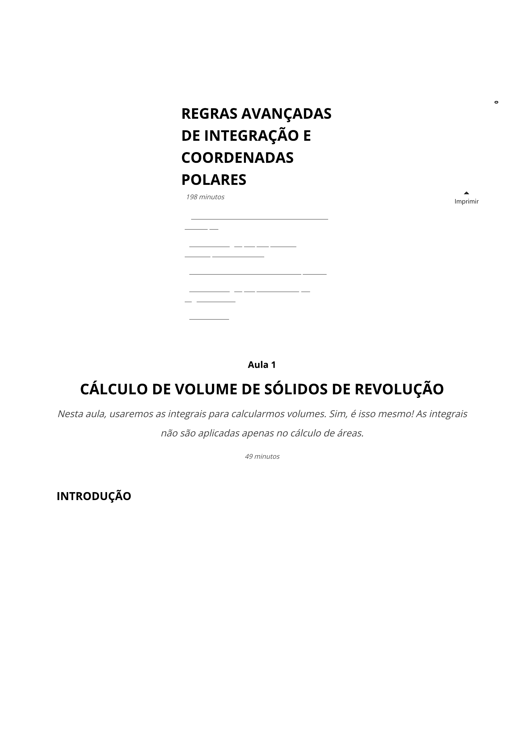 <p>Nesta aula, usaremos as integrais para calcularmos volumes. Sim, é isso mesmo! As integrais não são</p><p>aplicadas apenas no cálculo de áreas. Para isso, trabalharemos com os chamados sólidos de revolução, que</p><p>são descritos pela rotação de uma função em torno de um eixo no plano cartesiano bidimensional.</p><p>Assim, na primeira parte do nosso material, descreveremos os conceitos que embasam essa teoria. Após</p><p>essa etapa, resolveremos aplicações dessa teoria, auxiliando a �xar o conteúdo. Na última parte da aula,</p><p>ampliaremos nosso conhecimento de cálculo de volumes usando mais do que uma função para a</p><p>construção de nossos sólidos de revolução.</p><p>Esse é o enfoque da nossa aula. Misturaremos teoria e prática, aproximando os conceitos teóricos</p><p>aprendidos com a resolução de problemas.</p><p>Nesta aula, usaremos as integrais para calcularmos volumes. Sim, é isso mesmo! As integrais</p><p>não são aplicadas apenas no cálculo de áreas.</p><p>49 minutos</p><p> Aula 1 - Cálculo de volume de sólidos de</p><p>revolução</p><p> Aula 2 - Integração por partes e</p><p>mudanças de variáveis</p><p> Aula 3 - Curvas em coordenadas polares</p><p> Aula 4 - Integração por substituição</p><p>trigonométrica</p><p> Referências</p><p>198 minutos Imprimir</p><p>V</p><p>er</p><p>a</p><p>n</p><p>o</p><p>ta</p><p>çõ</p><p>es</p><p>wlldd_231_u2_cal_dif_int_II https://cm-kls-content.s3.amazonaws.com/202301/WHITE_LABEL/CALCULO_DIFERENCIAL_...</p><p>1 of 47 8/5/2024, 6:16 PM</p><p>Desejamos a você, estudante, boas-vindas ao estudo do cálculo integral!</p><p>A ideia de um sólido de revolução é poder imaginar uma �gura plana construída por meio de uma função</p><p>f(x) limitada em um intervalo aberto ]a,b[, que, ao “girar” (rotacionar) em torno de um dos eixos do plano</p><p>cartesiano, gera um sólido. Esse sólido carrega o nome que dá sua origem: sólido de revolução.</p><p>Figura 1 | Diversos tipos de sólidos de revolução</p><p>Fonte: Wikimedia Commons</p><p>As imagens estão representando sólidos originados pela rotação em torno do eixo x, porém também</p><p>podemos avaliar rotações ao redor do eixo y, como pode ser observado nas �guras a seguir.</p><p>Figura 2 | Rotação em torno dos eixo y</p><p>Fonte: Wikimedia Commons</p><p>Aplicaremos o conceito de integral para calcular o volume desses sólidos. Iniciaremos essa representação</p><p>por um método conhecido como “volume por fatiamento”.</p><p>y</p><p>V</p><p>er</p><p>a</p><p>n</p><p>o</p><p>ta</p><p>çõ</p><p>es</p><p>wlldd_231_u2_cal_dif_int_II https://cm-kls-content.s3.amazonaws.com/202301/WHITE_LABEL/CALCULO_DIFERENCIAL_...</p><p>2 of 47 8/5/2024, 6:16 PM</p><p>A ideia por traz dessa técnica é a de fatiar um sólido ao longo do seu domínio com uma espessura tão</p><p>pequena quanto possível (in�nitesimal) e somar todas as áreas dessas secções transversais ao longo desse</p><p>domínio.</p><p>Figura 3 | Volume por fatiamento</p><p>Fonte: Stewart (2017, p. 389).</p><p>Note que o domínio é particionado de forma similar às somas de Riemann. Dessa forma, se for possível</p><p>somar todas as áreas geradas pela intersecção entre o sólido, S, e um plano P perpendicular ao eixo das</p><p>abscissas, será possível obter o volume de S.</p><p>Assim, seja um sólido S, gerado pela rotação de uma função f(x) em torno do eixo das abscissas, com</p><p>domínio conhecido. Seja também a área P formada pela interseção entre um plano A(x),</p><p>perpendicularmente ao eixo , e o sólido S, conforme a Figura 3. Analise a �gura a seguir:</p><p>Figura 4 | Área da seção transversal</p><p>Fonte: Stewart (2017, p. 390).</p><p>Considerando que é tão pequeno quanto possível, então o volume de será dado por</p><p>(1)</p><p>Agora, seja a função , rotacionada em torno do eixo x, no intervalo .</p><p>Figura 5 | Função rotacionada em torno do eixo das abscissas</p><p>x</p><p>x</p><p>Δx</p><p>V =</p><p>n</p><p>i=1</p><p>A (x</p><p>*</p><p>i</p><p>)Δx =</p><p>b</p><p>a</p><p>A (x)dx</p><p>f (x) = √x x ∈ [0, 4]</p><p>f (x) =</p><p>√</p><p>x</p><p>V</p><p>er</p><p>a</p><p>n</p><p>o</p><p>ta</p><p>çõ</p><p>es</p><p>wlldd_231_u2_cal_dif_int_II https://cm-kls-content.s3.amazonaws.com/202301/WHITE_LABEL/CALCULO_DIFERENCIAL_...</p><p>3 of 47 8/5/2024, 6:16 PM</p><p>Fonte: https://www.geogebra.org/m/nc8x8rr3. Acesso em: 27 dez. 2022.</p><p>Aplicar o fatiamento nesse sólido é particioná-lo em discos, de acordo com as �guras a seguir.</p><p>Figura 6 | Sólido de revolução particionado em discos</p><p>Fonte: https://www.geogebra.org/m/SHu4kZ4V. Acesso em: 27 dez. 2022.</p><p>E com os discos reunidos:</p><p>Figura 7 | Sólido de revolução particionado em discos para</p><p>Fonte: https://www.geogebra.org/m/wgqwmy9h. Acesso em: 27 dez. 2022</p><p>f (x) =</p><p>√</p><p>x</p><p>V</p><p>er</p><p>a</p><p>n</p><p>o</p><p>ta</p><p>çõ</p><p>es</p><p>wlldd_231_u2_cal_dif_int_II https://cm-kls-content.s3.amazonaws.com/202301/WHITE_LABEL/CALCULO_DIFERENCIAL_...</p><p>4 of 47 8/5/2024, 6:16 PM</p><p>https://www.geogebra.org/m/nc8x8rr3</p><p>https://www.geogebra.org/m/nc8x8rr3</p><p>https://www.geogebra.org/m/SHu4kZ4V</p><p>https://www.geogebra.org/m/SHu4kZ4V</p><p>https://www.geogebra.org/m/wgqwmy9h</p><p>https://www.geogebra.org/m/wgqwmy9h</p><p>Note que, ao fatiarmos esse sólido, a área A(x) gerada, com , é a área de um círculo.</p><p>Figura 8 | Sólido de revolução particionado em discos</p><p>Fonte: adaptada de Stewart (2017, p. 392).</p><p>Na geometria plana, a área de círculos é dada pela equação , portanto, se conhecermos o raio de</p><p>cada fatia (ou disco) ao longo do domínio determinado, poderemos aplicar a Equação 1.</p><p>Como o raio R(x) desse círculo será exatamente a função , então a Equação 1 passa a ser escrita</p><p>da forma:</p><p>(2)</p><p>A mesma ideia pode ser aplicada quando a rotação