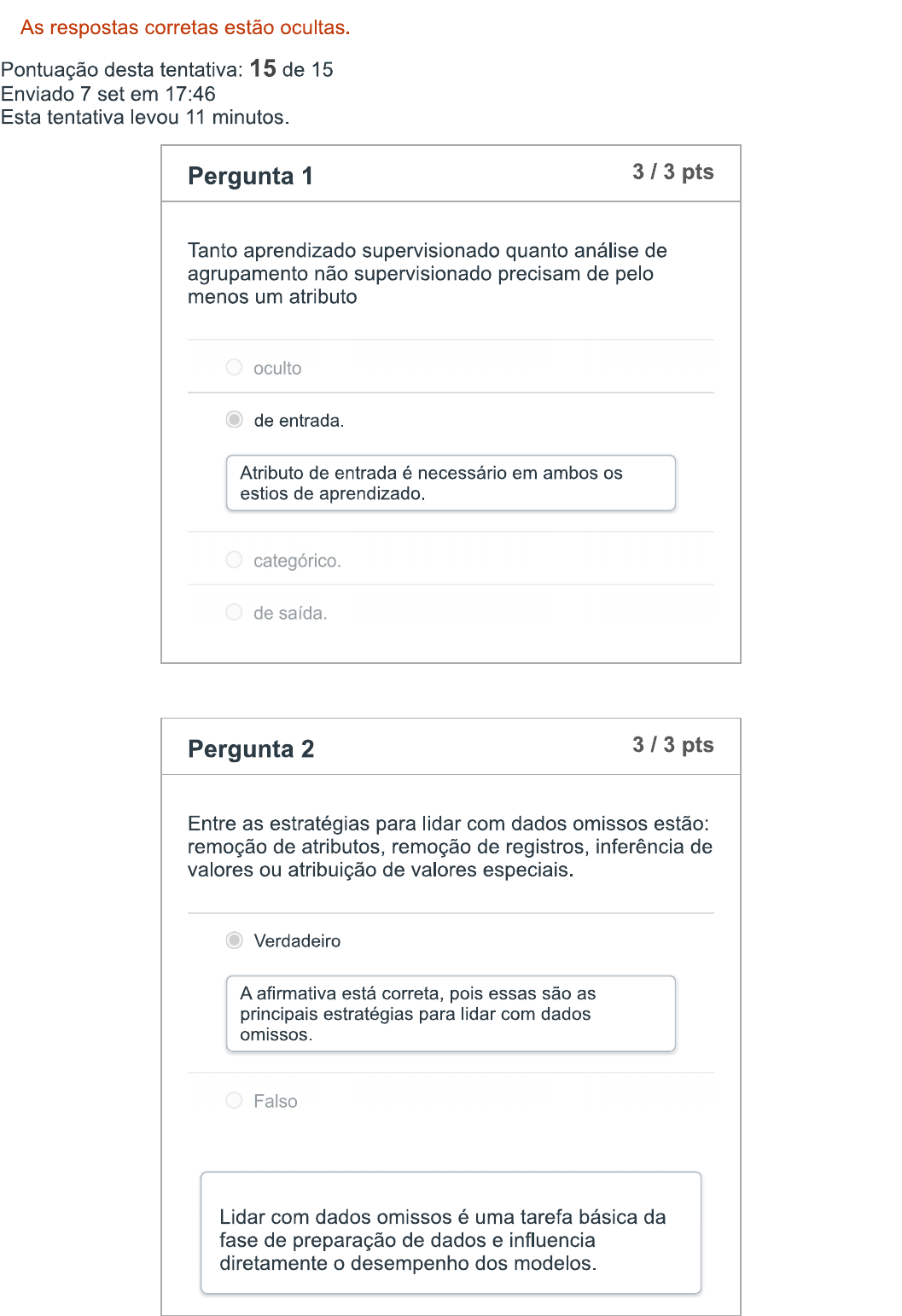 <p>As respostas corretas estão ocultas. Pontuação desta tentativa: 15 de 15 Enviado 7 set em 17:46 Esta tentativa levou 11 minutos. Pergunta 1 3/3 pts Tanto aprendizado supervisionado quanto análise de agrupamento não supervisionado precisam de pelo menos um atributo oculto de entrada. Atributo de entrada é necessário em ambos os estios de aprendizado. categórico. de saída. Pergunta 2 3/3 pts Entre as estratégias para lidar com dados omissos estão: remoção de atributos, remoção de registros, inferência de valores ou atribuição de valores especiais. Verdadeiro A afirmativa está correta, pois essas são as principais estratégias para lidar com dados omissos Falso Lidar com dados omissos é uma tarefa básica da fase de preparação de dados e influencia diretamente o desempenho dos modelos.</p><p>Pergunta 3 3/3 pts Suponha que você identificou diversos atributos multi- colineares (que podem ser escritos em função de outros atributos). Você tem as seguintes alternativas para preparação de dados. 1. Remover ambos os atributos colineares. 2. Remover apenas um dos atributos colineares. 3. Utilizar modelos que penalizem dados colineares, se possível. As ações que você executaria seriam: As ações 1, 2 ou 3, apenas. As ações 1 ou 2, As ações 2 ou 3, apenas. A alternativa está correta. As ações 1 ou 3, Você não pode remover todos os atributos pois, após a remoção dos atributos, você perderá toda a informação sobre esses elementos. Você pode remover apenas um dos atributos, pois ele seria explicado pelo seu atributo colinear ou você pode buscar identificar modelos que se mantém estáveis com atributos colineares ou que penalizam esses atributos. Um exemplo desse tipo de modelo é a regressão LASSO. Pergunta 4 3/3 pts Baseado nos estilos de aprendizado de máquina, associe as colunas corretamente. Detecção de anomalias é um estilo de ap</p><p>Rede Neural Artifical pode ser usado ( Indução de regras é um estilo de ap Monte Carlo é usado em apre Pergunta 5 3/3 pts Sobre o processo de preparação de dados, podemos afirmar que Ruídos de atributos tendem a ser aleatórios, enquanto ruídos de classe devem-se a erros de medição. Atributos redundantes podem ajudar a acelerar a convergência dos modelos. Campos do tipo data ou moeda podem frequentemente sofrer com inconsistência por formato de codificação. Campos do tipo data ou moeda podem realmente sofrer com inconsistência por formato de codificação. Registros com dados conflitantes devem ser agregados em um único registro para não produzirem conhecimento falso. Pontuação do teste: 15 de 15</p>