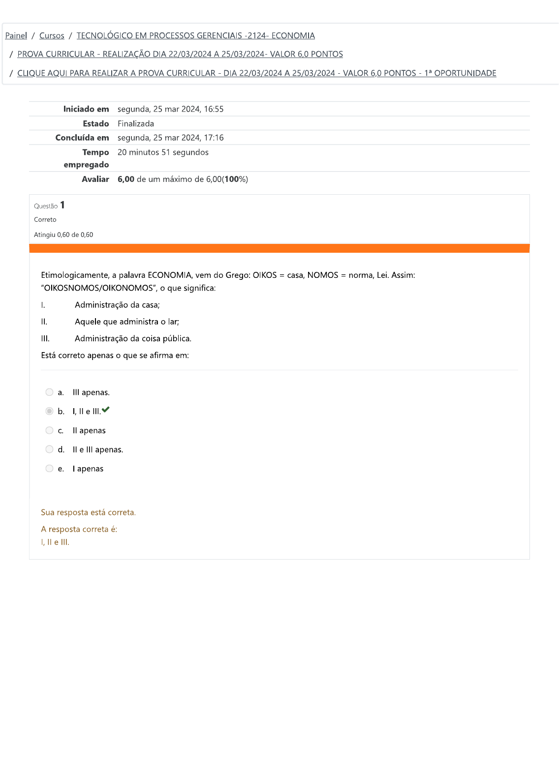 <p>Painel / Cursos / TECNOLÓGICO EM PROCESSOS GERENCIAIS -2124- ECONOMIA / PROVA CURRICULAR - REALIZAÇÃO DIA 22/03/2024 A 25/03/2024- VALOR 6,0 PONTOS / CLIQUE AQUI PARA REALIZAR A PROVA CURRICULAR - DIA 22/03/2024 A 25/03/2024 - VALOR 6,0 PONTOS - OPORTUNIDADE Iniciado em segunda, 25 mar 2024, 16:55 Estado Finalizada Concluída em segunda, 25 mar 2024, 17:16 Tempo 20 minutos 51 segundos empregado Avaliar 6,00 de um máximo de 6,00(100%) Questão 1 Correto Atingiu 0,60 de 0,60 Etimologicamente, a palavra ECONOMIA, vem do Grego: OIKOS = casa, NOMOS = norma, Lei. Assim: o que significa: I. Administração da casa; Aquele que administra o lar; III. Administração da coisa pública. Está correto apenas o que se afirma em: a. III apenas. b. I, e III. C. apenas d. e III apenas. e. apenas Sua resposta está correta. A resposta correta é: I, e III.</p><p>Questão 2 Correto Atingiu 0,60 de 0,60 ... foi o Primeiro a dividir a economia em setores, mostrando a relação entre eles. Está na origem do sistema de circulação monetária input-output criado no século XX (anos 1940) pelo economista russo, naturalizado norte-americano, Wassily Leontief, da Universidade de Harvard. Assinale a alternativa correta: a. Adam Smith b. Vasconcellos C. François Quesnay d. John Stuart Mill e. David Ricardo Sua resposta está correta. A resposta correta é: François Quesnay Questão 3 Correto Atingiu 0,60 de 0,60 Imprimiu ao pensamento econômico um cunho de arte empírica, de preceitos de administração pública que os governantes deveriam usar para aumentar a riqueza da nação e do Assinale a alternativa correta: a. Período Neoclássico b. Mercantilismo C. Fisiocrácia d. Monarquismo e. Realismo Sua resposta está correta. A resposta correta é: Mercantilismo</p><p>Questão 4 Correto Atingiu 0,60 de 0,60 De acordo com a teoria macroeconômica, assinale a opção correta: a. Estrutura concorrencial e equilíbrio dos mercados. b. Importa-se com a empresa e a análise da oferta. C. Foco na remuneração dos fatores de produção e estrutura de repartição da renda. d. Importa-se com o consumidor e a análise de procura. e. A condução do processo econômico considerado como um todo. Sua resposta está correta. A resposta correta é: A condução do processo econômico considerado como um todo. Questão 5 Correto Atingiu 0,60 de 0,60 De acordo com as definições de demanda ou procura, avalie as afirmativas a seguir: I. A quantidade de um determinado bem ou serviço que os consumidores desejam adquirir em determinado período de tempo. II. A quantidade de determinado bem ou serviço que os consumidores desejam adquirir, num dado período, dada sua renda, seus gastos e o preço de mercado. Representa um desejo, um plano: o máximo a que o consumidor pode aspirar, dada sua renda e os preços no mercado. III. A procura depende de variáveis que influenciam a escolha do consumidor. São elas: o preço do bem ou serviço, o preço de outros bens, a renda do consumidor e o gosto ou preferência do indivíduo. Para estudar-se a influência dessas variáveis utiliza-se a hipótese do coeteris paribus (Ceteris paribus), ou seja, considera-se cada uma dessas variáveis afetando separadamente as decisões do consumidor Está correto apenas o que se afirma em: a. III b. I, e III. C. I. d. II. e. e III. Sua resposta está correta. A resposta correta é: I, III.</p><p>Questão 6 Correto Atingiu 0,60 de 0,60 Com relação à política cambial avalie as afirmações a seguir: I. A CVM (comissão de valores mobiliários) define o regime cambial, ao estabelecer as diretrizes do mercado de câmbio e como o BC deve atuar para assegurar o seu funcionamento adequado. II. A política cambial reflete-se na atuação do governo na taxa de câmbio, no mercado de negociação de moedas estrangeiras. III. A política cambial afeta a vida do cidadão, mesmo daquele que não viaja para o exterior, devido ao comércio internacional. IV. Os preços de produtos importados e exportados são afetados pela taxa de câmbio que, ao flutuar, influencia as exportações e importações. Está correto apenas o que se afirma em: a. I, II, III e IV. b. II, III e IV. C. III e IV. d. II e III. e. e IV. Sua resposta está correta. A resposta correta é: II, III e IV.</p><p>Questão 7 Correto Atingiu 0,60 de 0,60 Sobre políticas de Rendas julgue as afirmações a seguir: I. A política de rendas consiste, na Intervenção direta do consumidor na formação de renda (salários, alugueis), com o controle e congelamento de preços. II. Trata-se de um conjunto de intervenções diretas que geralmente complementam a atuação dos instrumentos fiscais, monetários e cambiais. III. A denominação política de rendas justifica-se pelos tipos predominantes de intervenções, como os controles diretos de preços e os controles legais sobre salários e demais remunerações de fatores de produção. Está correto apenas o que se afirma em: a. I, e III b. lell C. III Sua resposta está correta. A resposta correta é: Questão 8 Correto Atingiu 0,60 de 0,60 Sobre elasticidade-preço demanda, assinale a única opção correta: a. resultado da elasticidade será positivo, pois a correlação entre preço e quantidade ofertada é direta b. Sua função é avaliar a reação da quantidade da demanda de um bem ou serviço em relação às variações em seu preço. Essa é a visão do quando considerado o lado do consumidor C. A elasticidade-preço da demanda pode ser definida "como sendo a relação entre a variação percentual na quantidade ofertada e a variação percentual no preço d. Quanto maior o preço, maior a quantidade que o empresário estará disposto a ofertar, coeteris paribus. e. Oferta mede o quanto a quantidade ofertada responde a mudanças no preço. Sua resposta está correta. A resposta correta é: Sua função é avaliar a reação da quantidade da demanda de um bem ou serviço em relação às variações em seu preço. Essa é a visão do