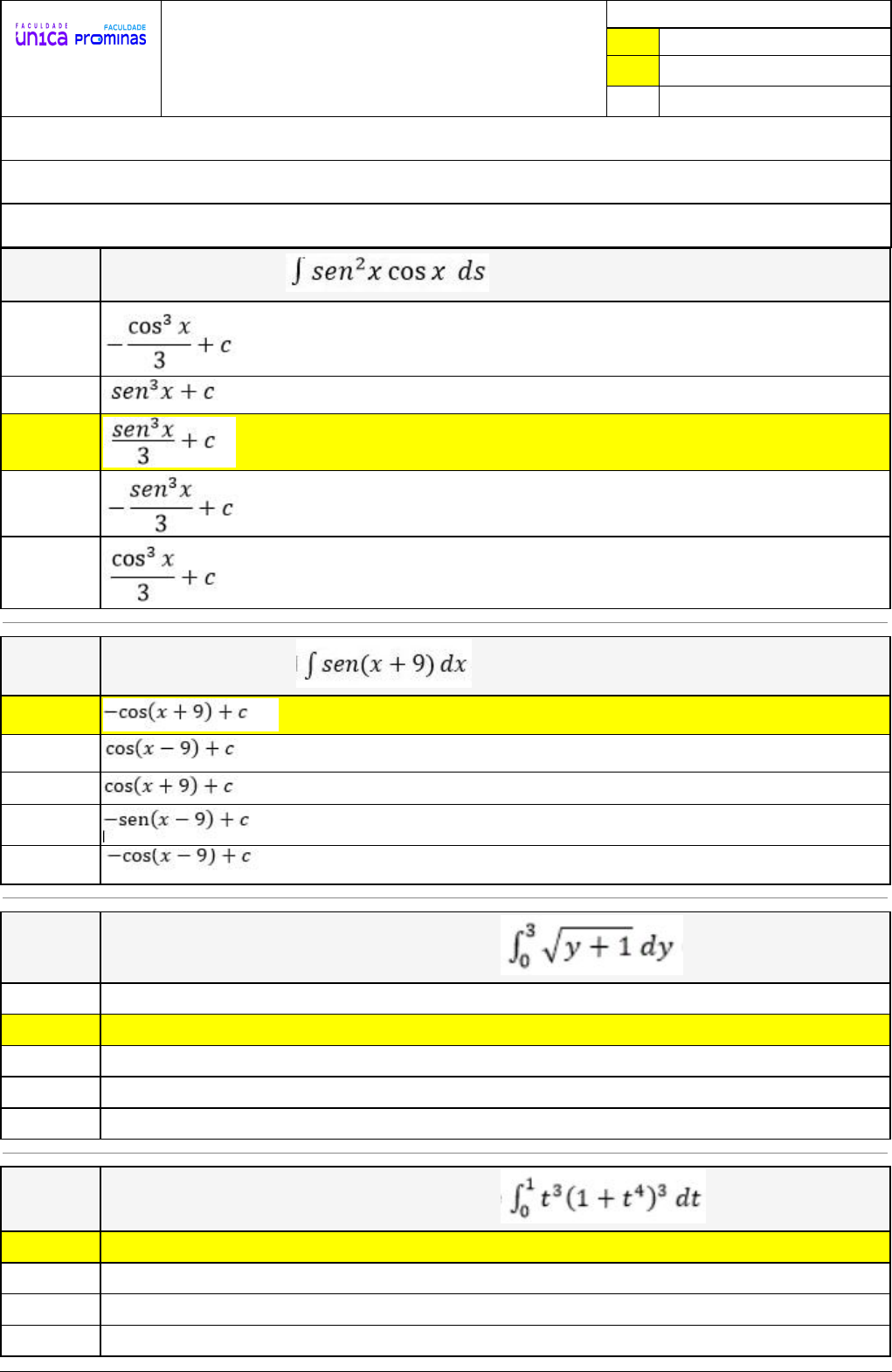 <p>Pincel Atômico - 25/08/2024 16:40:01 1/3</p><p>ALESSANDRA CAPLER</p><p>NOGUEIRA DE</p><p>OLIVEIRA</p><p>Exercício Caminho do Conhecimento - Etapa 18 (17297)</p><p>Atividade finalizada em 18/08/2024 16:37:13 (2167517 / 1)</p><p>LEGENDA</p><p>Resposta correta na questão</p><p># Resposta correta - Questão Anulada</p><p>X Resposta selecionada pelo Aluno</p><p>Disciplina:</p><p>TEORIA DOS NÚMEROS [940875] - Avaliação com 8 questões, com o peso total de 1,67 pontos [capítulos - 3]</p><p>Turma:</p><p>Segunda Graduação: Segunda Graduação 6 meses - Licenciatura em Matemática - Grupo: FPD-OUTUBRO/2023 - SGegu0A091023 [102166]</p><p>Aluno(a):</p><p>91519005 - ALESSANDRA CAPLER NOGUEIRA DE OLIVEIRA - Respondeu 6 questões corretas, obtendo um total de 1,25 pontos como nota</p><p>[356432_70196]</p><p>Questão</p><p>001 Ao calular a integral encontraremos a primitiva:</p><p>X</p><p>[356433_70202]</p><p>Questão</p><p>002 Ao calcular a integral encontraremos a primitiva :</p><p>X</p><p>[356432_71019]</p><p>Questão</p><p>003 Utilizando a fórmula de subtituição, calcule encontraremos :</p><p>23/3</p><p>14/3</p><p>17/3</p><p>25/3</p><p>X 19/3</p><p>[356432_71026]</p><p>Questão</p><p>004 Utilizando a fórmula de subtituição, calcule encontremos :</p><p>15/16</p><p>X 19/16</p><p>13/16</p><p>17/16</p><p>Pincel Atômico - 25/08/2024 16:40:01 2/3</p><p>14/16</p><p>[356432_71014]</p><p>Questão</p><p>005</p><p>Ao calcular a integral ∫ sec(2t)tg(2t) dt encontraremos a primitiva</p><p>X</p><p>[356434_70348]</p><p>Questão</p><p>006 Calculando a integral encontraremos :</p><p>1</p><p>X</p><p>[356432_70185]</p><p>Questão</p><p>007</p><p>Ao calcular a integral encontraremos a primitiva.</p><p>Dessa forma, o valor encontrado é:</p><p>X</p><p>[356434_70216]</p><p>Questão</p><p>008 Calculando a antiderivada de em encontraremos :</p><p>3</p><p>X -2</p><p>Pincel Atômico - 25/08/2024 16:40:01 3/3</p><p>1</p><p>2</p><p>0</p>