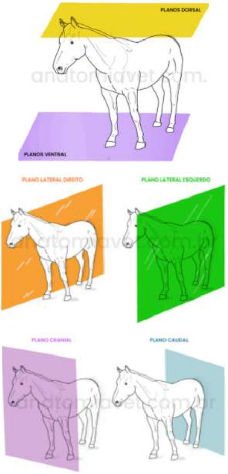 <p>ANATOMIA VETERINÁRIA</p><p>Variações Anatômicas</p><p>Variação anatômica: variação do que é</p><p>considerado padrão → não causa prejuízo à vida</p><p>Anomalia: variações que causam alterações, mas</p><p>é compatível com a vida → causa prejuízo à vida.</p><p>Ex: hermafrodita, falta de um rim, órgão</p><p>Monstruosidade: geralmente incompatível com a</p><p>vida.</p><p>Ex: anencefalia, ciclopia, fenda palatina</p><p>*Em alguns casos pode ser compatível com a</p><p>vida, mas muitas vezes o tratamento não vale a</p><p>pena</p><p>As variações podem ocorrer pelo:</p><p>Sexo: dimorfismo sexual</p><p>Raça:</p><p>Biotipo: dolicocefálico (focinho longo),</p><p>mesaticefálico (focinho médio), braquicefálico</p><p>(focinho curto).</p><p>Biotipo corporal: longilíneo (pernas</p><p>longas), brevilíneo (pernas curtas)</p><p>Divisão do corpo:</p><p>• Cabeça</p><p>Crânio: ossos em torno do encéfalo</p><p>Fase: cavidades nasais, oculares, orais</p><p>• Pescoço</p><p>• Tronco</p><p>Faz parte do tronco: Vértebras torácicas,</p><p>vértebras lombares, sacro, cauda, costelas e</p><p>esterno</p><p>Em mamíferos domésticos é dividido em:</p><p>Tórax (costelas, esterno e vértebras torácicas),</p><p>abdômen (vértebras lombares) e pelve</p><p>*Tórax e abdômen são separados pelo</p><p>diafragma</p><p>• Membros</p><p>Torácicos e pélvicos</p><p>• Cauda</p><p>Posição Anatômica</p><p>• Animal olhando para o horizonte</p><p>• Pescoço formando um ângulo de 145º com o</p><p>torso</p><p>• Animal em estado de alerta com os 4</p><p>membros apoiados no solo</p><p>• Orelhas em pé</p><p>Planos de Delimitação</p><p>Seis planos imaginários que envolvem o animal:</p><p>Eixos</p><p>Linhas imaginárias que atravessam o corpo do</p><p>animal</p><p>Do centro de um plano de delimitação até o centro</p><p>do plano oposto.</p><p>Utilizado em raio-x</p><p>Longitudinal ou crânio caudal:</p><p>Disposição horizontal</p><p>Liga o centro do plano cranial com o centro do</p><p>plano caudal</p><p>Sempre o maior comprimento da estrutura</p><p>estudada</p><p>Sagital ou dorso ventral:</p><p>Liga o centro do plano dorsal com o centro do</p><p>plano ventral</p><p>Latero lateral:</p><p>Liga o centro do plano lateral direito com o</p><p>centro do plano lateral esquerdo</p><p>Planos de Secção</p><p>“Planos de corte”</p><p>Descrever qual corte foi/vai ser realizado →</p><p>mostrar estruturas</p><p>Frontal/ horizontal/ longitudinal: Secção</p><p>horizontal paralelo ao plano dorsal e ventral</p><p>Divide o animal ao meio de maneira paralela</p><p>ao plano dorsal e ventral</p><p>Divide o animal em dorsal e ventral →</p><p>paquímeros dorsal e ventral</p><p>Desliza o eixo latero lateral sobre o crânio</p><p>caudal</p><p>Corte no maior eixo</p><p>Transversal / vertical: Secção vertical paralela ao</p><p>plano cranial e caudal</p><p>Divide o animal em parte cranial e caudal →</p><p>metâmeros cranial e caudal</p><p>Estrutura única: perpendicular ao eixo</p><p>longitudinal</p><p>Corte no menor eixo</p><p>Desloca o eixo latero lateral sobre o eixo dorso</p><p>ventral</p><p>Plano mediano: passa exatamente no meio do</p><p>animal → passa na linha média</p><p>Desloca o eixo dorso-ventral sobre o eixo</p><p>crânio caudal</p><p>Divide o animal em partes direita e esquerda</p><p>→ antímeros direito e esquerdo</p><p>Metades iguais</p><p>Planos sagital / paramedianos: Plano paralelo</p><p>ao plano mediano e aos planos laterais</p><p>Um pouco mais pro lado que o mediano</p><p>Termos de Posição e Direção</p><p>Dorsal: Estruturas mais próximas do plano dorsal</p><p>Ventral: Estruturas mais próximas do plano</p><p>ventral</p><p>Cranial: Estruturas mais próximas do plano cranial</p><p>Caudal: Estruturas mais próximas do plano caudal</p><p>Medial: Estruturas mais próximas do plano</p><p>mediano</p><p>Lateral: Estruturas mais próximas do plano lateral</p><p>Intermédio: entre o lateral e o medial</p><p>Médio: entre um dorso/ventral ou uma</p><p>proximal/distal</p><p>Rostral: para o rosto → Rostral e caudal</p><p>Superficial</p><p>Profundo</p><p>Interno</p><p>Externo</p><p>Proximal: usado para o membro → mais próximo</p><p>ao tronco; “mais dorsal”</p><p>Distal: usado para o membro → mais distante do</p><p>tronco do animal’; “mais ventral”</p><p>Superior</p><p>Inferior</p><p>Anterior</p><p>Posterior</p><p>Dorsal e palmar: usado em membros torácicos;</p><p>do carpo pra baixo → dorsal na frente (“dorso da</p><p>mão”), palmar atrás (“palma da mão”)</p><p>Dorsal e plantar: usado em membros pélvicos; do</p><p>tarso pra baixo → dorsal na frente (“dorso do pé”),</p><p>plantar atrás (“planta do pé”; sola)</p><p>Axial: Estruturas do dedo → mais próximo ao</p><p>centro do membro. Ex: parte interna do casco do</p><p>bovino</p><p>Abaxial: Estruturas do dedo → mais na periferia</p><p>do membro; afastar do eixo. Ex: parte de fora do</p><p>casco de bovino</p><p>*Escapula é a única exceção dos membros que</p><p>não usa proximal e distal → usa dorsal e ventral</p><p>Estrutura em camadas. Ex: músculos,</p><p>ligamentos</p><p>Vísceras ocas ou estruturas ocas.</p><p>Ex: estômago, intestino, cavidade</p><p>abdominal</p><p>Usado para olhos e lábios</p><p>Usado para estruturas do olho</p>