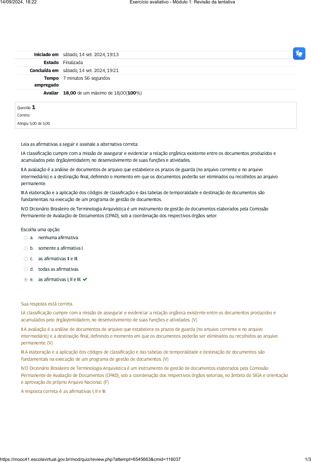 <p>Iniciado em sábado, 14 set. 2024, 19:13</p><p>Estado Finalizada</p><p>Concluída em sábado, 14 set. 2024, 19:21</p><p>Tempo</p><p>empregado</p><p>7 minutos 56 segundos</p><p>Avaliar 18,00 de um máximo de 18,00(100%)</p><p>Questão 1</p><p>Correto</p><p>Atingiu 5,00 de 5,00</p><p>Leia as a�rmativas a seguir e assinale a alternativa correta:</p><p>I.A classi�cação cumpre com a missão de assegurar e evidenciar a relação orgânica existente entre os documentos produzidos e</p><p>acumulados pelo órgão/entidadem, no desenvolvimento de suas funções e atividades.</p><p>II.A avaliação é a análise de documentos de arquivo que estabelece os prazos de guarda (no arquivo corrente e no arquivo</p><p>intermediário) e a destinação �nal, de�nindo o momento em que os documentos poderão ser eliminados ou recolhidos ao arquivo</p><p>permanente.</p><p>III.A elaboração e a aplicação dos códigos de classi�cação e das tabelas de temporalidade e destinação de documentos são</p><p>fundamentais na execução de um programa de gestão de documentos.</p><p>IV.O Dicionário Brasileiro de Terminologia Arquivística é um instrumento de gestão de documentos elaborados pela Comissão</p><p>Permanente de Avaliação de Documentos (CPAD), sob a coordenação dos respectivos órgãos setor.</p><p>Escolha uma opção:</p><p>a. nenhuma a�rmativa.</p><p>b. somente a a�rmativa I.</p><p>c. as a�rmativas II e III.</p><p>d. todas as a�rmativas.</p><p>e. as a�rmativas I, II e III. </p><p>Sua resposta está correta.</p><p>I.A classi�cação cumpre com a missão de assegurar e evidenciar a relação orgânica existente entre os documentos produzidos e</p><p>acumulados pelo órgão/entidadem, no desenvolvimento de suas funções e atividades. (V)</p><p>II.A avaliação é a análise de documentos de arquivo que estabelece os prazos de guarda (no arquivo corrente e no arquivo</p><p>intermediário) e a destinação �nal, de�nindo o momento em que os documentos poderão ser eliminados ou recolhidos ao arquivo</p><p>permanente. (V)</p><p>III.A elaboração e a aplicação dos códigos de classi�cação e das tabelas de temporalidade e destinação de documentos são</p><p>fundamentais na execução de um programa de gestão de documentos. (V)</p><p>IV.O Dicionário Brasileiro de Terminologia Arquivística é um instrumento de gestão de documentos elaborados pela Comissão</p><p>Permanente de Avaliação de Documentos (CPAD), sob a coordenação dos respectivos órgãos setoriais, no âmbito do SIGA e orientação</p><p>e aprovação do próprio Arquivo Nacional. (F)</p><p>A resposta correta é: as a�rmativas I, II e III.</p><p>14/09/2024, 18:22 Exercício avaliativo - Módulo 1: Revisão da tentativa</p><p>https://mooc41.escolavirtual.gov.br/mod/quiz/review.php?attempt=6545663&cmid=116037 1/3</p><p>Questão 2</p><p>Correto</p><p>Atingiu 4,00 de 4,00</p><p>Questão 3</p><p>Correto</p><p>Atingiu 4,00 de 4,00</p><p>Associe os principais métodos de classi�cação de documentos de arquivo:</p><p>Re�ete as funções exercidas pelo órgão/entidade (produtor) e garante a manutenção da relação orgânica dos</p><p>documentos arquivísticos.</p><p></p><p>Re�ete a estrutura organizacional do produtor e requer instituições com estrutura extremamente �xas e</p><p>estáveis.</p><p></p><p>Identi�ca os assuntos de que trata o documento que retratam as atividades de que resultam sua produção e</p><p>acumulação</p><p></p><p>Funcional</p><p>Estrutural</p><p>Por assunto</p><p>Sua resposta está correta.</p><p>a) Re�ete as funções exercidas pelo órgão/entidade (produtor) e garante a manutenção da relação orgânica dos documentos</p><p>arquivísticos. - FUNCIONAL</p><p>b) Re�ete a estrutura organizacional do produtor e requer instituições com estrutura extremamente �xas e estáveis. - ESTRUTURAL</p><p>c) Identi�ca os assuntos de que trata o documento que retratam as atividades de que resultam sua produção e acumulação - POR</p><p>ASSUNTO</p><p>A resposta correta é: Re�ete as funções exercidas pelo órgão/entidade (produtor) e garante a manutenção da relação orgânica dos</p><p>documentos arquivísticos. → Funcional, Re�ete a estrutura organizacional do produtor e requer instituições com estrutura</p><p>extremamente �xas e estáveis. → Estrutural, Identi�ca os assuntos de que trata o documento que retratam as atividades de que</p><p>resultam sua produção e acumulação → Por assunto.</p><p>Assinale a a�rmativa correta para realizar a classi�cação de documentos:</p><p>Escolha uma opção:</p><p>a. Realizar o estudo das funções e atividades do organismo produtor; fazer o levantamento da produção documental; e</p><p>estabelecer a hierarquia das funções visando à aplicação dos instrumentos de gestão de documentos.</p><p></p><p>b. Fazer o levantamento da produção documental; analisar os documentos e estabelecer os prazos de guarda e destinação �nal</p><p>de documentos.</p><p>c. Analisar a estrutura organizacional; solicitar orientação técnica junto ao Arquivo Nacional e aplicar os instrumentos de gestão</p><p>de documentos.</p><p>d. Fazer o levantamento da produção documental; identi�car os assuntos e estruturar os instrumentos com base nos tipo</p><p>documentais. classi�cação por tipologia.</p><p>Sua resposta está correta.</p><p>A opção a) é a correta, porque a classi�cação terá como base o resultado das atividades elencadas. A opção b) está errada, pois</p><p>estabelecer prazos de guarda e destinação �nal de documentos refere-se à elaboração da Tabela de Temporalidade e Destinação de</p><p>Documentos; a opção c), possui uma atividade aplicada no método de classi�cação estrutural e na opção d), uma atividade aplicada no</p><p>método de classi�cação por tipologia.</p><p>A resposta correta é: Realizar o estudo das funções e atividades do organismo produtor; fazer 