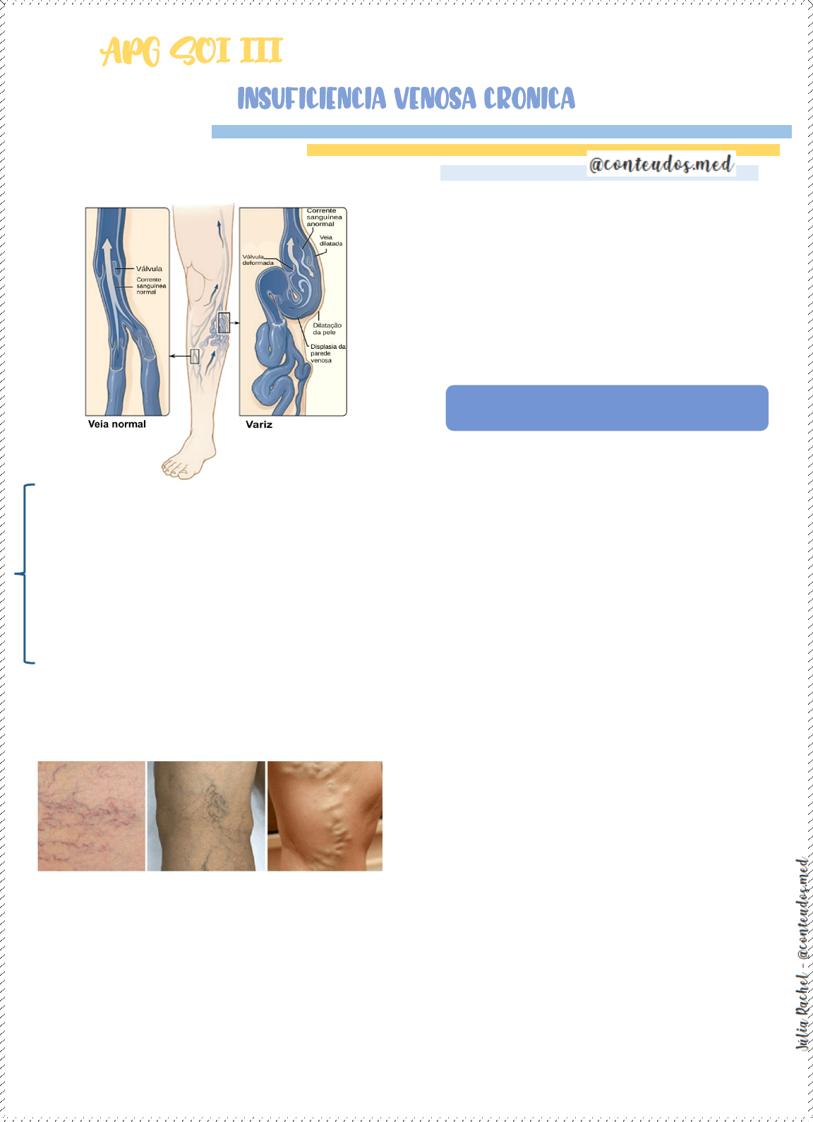<p>Insuficiência venosa crônica (IVC) é um conjunto</p><p>de manifestações clínicas causadas pela</p><p>anormalidade do sistema venoso (superficial,</p><p>profundo ou ambos) por uma incompetência</p><p>valvular, associada ou não à obstrução do fluxo</p><p>venoso, podendo afetar o sistema venoso</p><p>superficial, o sistema venoso profundo ou ambos.</p><p>Existem três apresentações comuns da doença:</p><p>. Telangiectasia: vênulas dilatadas (1 mm) na</p><p>porção intradermal da pele que aparecem em</p><p>tons avermelhados ou azulados;</p><p>. Microvarizes (veias reticulares): veias do</p><p>subcutâneos dilatadas (1-3 mm) que</p><p>aparecem em tons de vermelho, verde ou</p><p>roxo;</p><p>. Varizes (veias tronculares): veias superficiais</p><p>dilatadas e tortuosas (> 3 mm).</p><p>Ocorre insuficiência venosa crônica quando</p><p>obstrução venosa (p. ex., na trombose venosa</p><p>profunda ), insuficiência valvar venosa ou</p><p>diminuição da contração dos músculos que</p><p>circundam as veias (p. ex., decorrente de</p><p>imobilização) diminuem o fluxo sanguíneo</p><p>anterógrado e aumentam a pressão venosa</p><p>(hipertensão venosa). O acúmulo de líquido nos</p><p>membros inferiores também pode contribuir,</p><p>causando hipertensão venosa.</p><p>A etiologia da insuficiência venosa crônica</p><p>também pode ser classificada como primária ou</p><p>secundária à trombose venosa profunda (TVP).</p><p>A insuficiência venosa crônica primária refere-</p><p>se à apresentação sintomática sem um evento</p><p>precipitante e é decorrente de defeitos</p><p>congênitos ou alterações na bioquímica da</p><p>parede venosa. Estudos identificaram conteúdo</p><p>reduzido de elastina, aumento da remodelação</p><p>da matriz extracelular e infiltrado inflamatório.</p><p>A insuficiência venosa crônica secundária ocorre</p><p>em resposta a uma TVP que desencadeia uma</p><p>ETIOLOGIA</p><p>https://www.msdmanuals.com/pt/profissional/doen%C3%A7as-cardiovasculares/doen%C3%A7as-venosas-perif%C3%A9ricas/trombose-venosa-profunda-tvp</p><p>https://www.msdmanuals.com/pt/profissional/doen%C3%A7as-cardiovasculares/doen%C3%A7as-venosas-perif%C3%A9ricas/trombose-venosa-profunda-tvp</p><p>Os fatores de risco mais frequentes são:</p><p>. Trombose venosa profunda;</p><p>. Avanço da idade;</p><p>. Sexo feminino;</p><p>. Trauma;</p><p>. Obesidade;</p><p>. Gestação;</p><p>. Sentado ou em pé por longos</p><p>períodos;</p><p>. Histórico familiar.</p><p>resposta inflamatória subsequentemente</p><p>lesando a parede da veia.</p><p> TROMBOSE VENOSA PROFUNDA</p><p>A trombose de grandes veias nos membros</p><p>inferiores dificulta o retorno de sangue de forma</p><p>temporária ou permanente.</p><p>Além disso, tais veias podem sofrer um processo</p><p>de degeneração das válvulas contidas em seu</p><p>interior.</p><p>A alteração destas válvulas sobrecarrega as</p><p>veias mais abaixo, o que aumenta a chance de</p><p>desenvolver varizes no curto prazo e IVC no</p><p>longo prazo.</p><p>A fisiopatologia da insuficiência venosa crônica</p><p>é devida ao refluxo (fluxo reverso) ou à</p><p>obstrução do fluxo sanguíneo venoso.</p><p>A insuficiência venosa crônica pode se</p><p>desenvolver a partir da incompetência valvar</p><p>prolongada das veias superficiais, profundas ou</p><p>perfurantes que as conectam. Em todos os casos,</p><p>o resultado é hipertensão venosa das</p><p>extremidades inferiores.</p><p>A incompetência superficial é geralmente</p><p>causada por válvulas enfraquecidas ou de</p><p>formato anormal ou diâmetro venoso alargado</p><p>que impede a congruência valvar normal.</p><p>A disfunção das veias profundas é geralmente</p><p>devida à TVP anterior, que resulta em</p><p>inflamação, cicatrização e adesão da válvula e</p><p>estreitamento luminal.</p><p>A inversão do fluxo e dos shunts veno-venosos,</p><p>não só alteram a estrutura dessas veias, mas</p><p>também alteram a função de drenagem.</p><p>As toxinas que geralmente são eliminadas pelo</p><p>sistema venoso estagnam e causam inflamação,</p><p>causando dor e prurido. À medida que o tempo</p><p>passa, o ambiente tecidual nas regiões mais</p><p>acometidas começa a se tornar deletério às</p><p>próprias células e paralelamente a isso o</p><p>progressivo aumento da pressão no interstício</p><p>passa a causar a diminuição de fluxo na</p><p>microcirculação com consequente diminuição de</p><p>oxigenação e trocas metabólicas, produzindo</p><p>dores nas pernas, cãibras noturnas, inchaço dos</p><p>tornozelos, edema e úlceras da pele e outros</p><p>problemas.</p><p>Os indivíduos podem desenvolver, também,</p><p>hiperpigmentação permanente da pele devido à</p><p>deposição de hemossiderina à medida que os</p><p>glóbulos vermelhos extravasam para o tecido</p><p>circundante. Muitos desses pacientes também</p><p>terão lipodermatosclerose, que é o espessamento</p><p>da pele por fibrose da gordura subcutânea.</p><p>FATORES DE RISCO</p><p>FISIOPATOLOGIA</p><p>À medida que a doença progride, a</p><p>microcirculação perturbada e o</p><p>enfraquecimento dérmico podem resultar na</p><p>formação de úlceras.</p><p>A insuficiência venosa crônica clinicamente</p><p>evidente pode não provocar nenhum sintoma,</p><p>mas sempre desencadeia sinais.</p><p>Os sintomas incluem sensação de plenitude, peso,</p><p>dor, cólicas, fadiga e parestesias nas pernas;</p><p>esses sintomas pioram com a posição ortostática</p><p>ou com a deambulação e são aliviados por</p><p>repouso e elevação das pernas. O prurido pode</p><p>acompanhar as alterações cutâneas.</p><p>A dermatite de estase venosa consiste em</p><p>hiperpigmentação, induração, ectasia venosa,</p><p>lipodermatosclerose (paniculite subcutânea</p><p>fibrosante) e úlceras de estase venosa.</p><p>Úlceras por estase venosa podem se desenvolver</p><p>espontaneamente ou depois de escoriação ou</p><