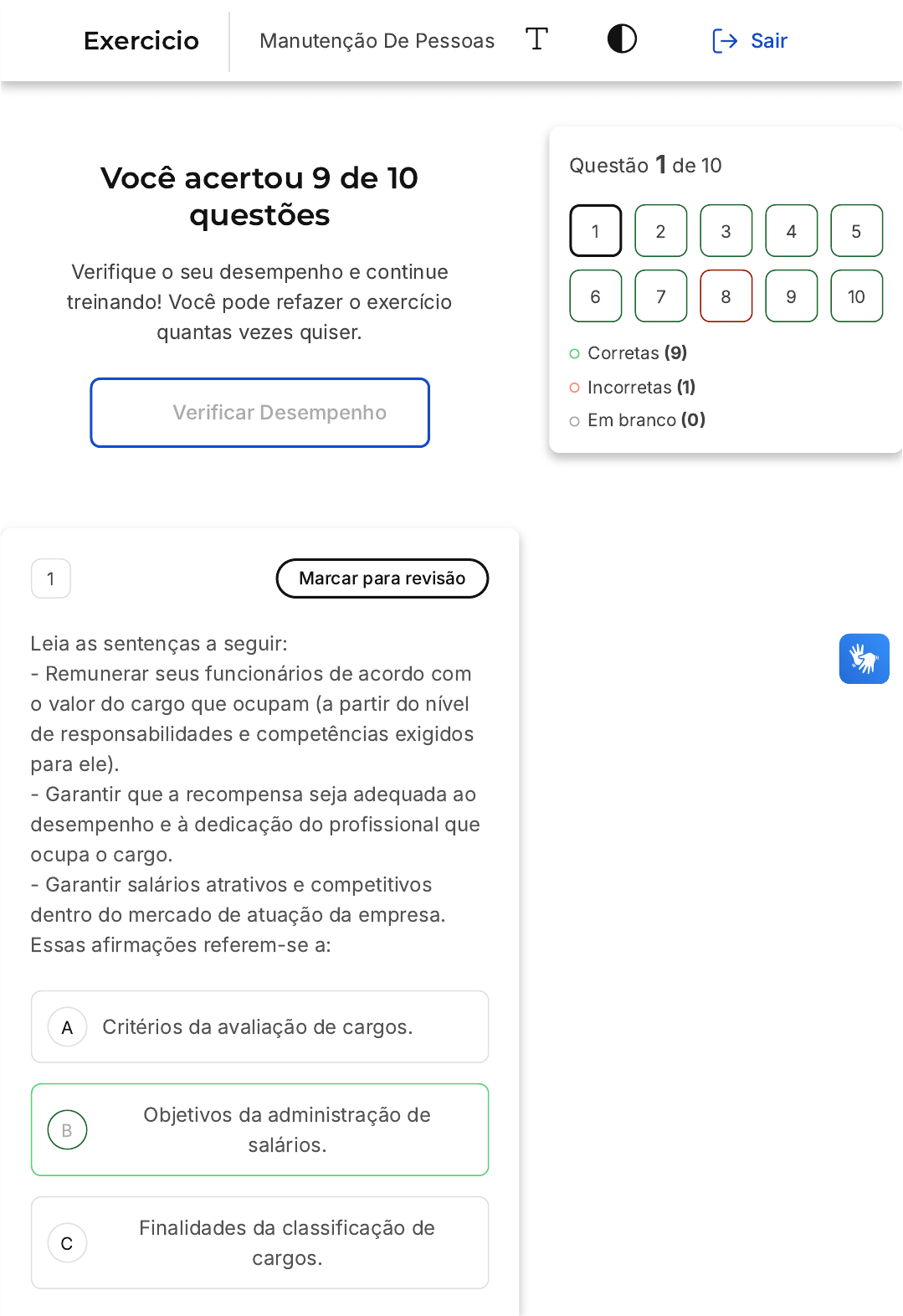 <p>Você acertou 9 de 10</p><p>questões</p><p>Verifique o seu desempenho e continue</p><p>treinando! Você pode refazer o exercício</p><p>quantas vezes quiser.</p><p>Verificar Desempenho</p><p>A</p><p>B</p><p>C</p><p>1 Marcar para revisão</p><p>Leia as sentenças a seguir:</p><p>- Remunerar seus funcionários de acordo com</p><p>o valor do cargo que ocupam (a partir do nível</p><p>de responsabilidades e competências exigidos</p><p>para ele).</p><p>- Garantir que a recompensa seja adequada ao</p><p>desempenho e à dedicação do profissional que</p><p>ocupa o cargo.</p><p>- Garantir salários atrativos e competitivos</p><p>dentro do mercado de atuação da empresa.</p><p>Essas afirmações referem-se a:</p><p>Critérios da avaliação de cargos.</p><p>Objetivos da administração de</p><p>salários.</p><p>Finalidades da classificação de</p><p>cargos.</p><p>Questão 1 de 10</p><p>Corretas �9�</p><p>Incorretas �1�</p><p>Em branco �0�</p><p>1 2 3 4 5</p><p>6 7 8 9 10</p><p>Exercicio Manutenção De Pessoas Sair</p><p>D</p><p>E</p><p>Estratégias de remuneração.</p><p>Perspectivas do conceito de salários.</p><p>Resposta correta</p><p>Parabéns, você selecionou a</p><p>alternativa correta. Confira o</p><p>gabarito comentado!</p><p>Gabarito Comentado</p><p>A resposta certa é: Objetivos da</p><p>administração de salários.</p><p>Os objetivos da administração de salários</p><p>são: remunerar seus funcionários de</p><p>acordo com o valor do cargo que ocupam</p><p>(a partir do nível de responsabilidades e</p><p>competências exigidos para ele), garantir</p><p>que a recompensa seja adequada ao</p><p>desempenho e à dedicação do profissional</p><p>que ocupa o cargo e garantir salários</p><p>atrativos e competitivos dentro do mercado</p><p>de atuação da empresa.</p><p>-----</p><p>2 Marcar para revisão</p><p>A origem dos sindicatos remonta à Revolução</p><p>Industrial ocorrida na Inglaterra (século XVIII�.</p><p>Qual das opções abaixo não caracteriza os</p><p>sindicatos?</p><p>A</p><p>B</p><p>C</p><p>D</p><p>E</p><p>O sindicalismo não pode ser visto</p><p>como movimento de revolução.</p><p>Os sindicatos são formas organizadas</p><p>de os trabalhadores buscarem seus</p><p>direitos.</p><p>O movimento sindical é parte de uma</p><p>sociedade socialista.</p><p>Uma das funções do sindicato é</p><p>oferecer à classe trabalhadora ajuda</p><p>especializada nos conhecimentos</p><p>sobre o trabalho.</p><p>Os sindicatos possuem atuação</p><p>política distinta nos países</p><p>desenvolvidos e subdesenvolvidos.</p><p>Resposta correta</p><p>Parabéns, você selecionou a</p><p>alternativa correta. Confira o</p><p>gabarito comentado!</p><p>Gabarito Comentado</p><p>O movimento sindical não é</p><p>necessariamente parte de uma sociedade</p><p>socialista. Existem sindicatos em países</p><p>capitalistas, por exemplo.</p><p>3 Marcar para revisão</p><p>A professora Ana Cristina Limogini-França</p><p>�2004) apresenta as escolas do pensamento da</p><p>A</p><p>B</p><p>C</p><p>D</p><p>E</p><p>qualidade de vida no trabalho �QVT�. Sobre</p><p>esse tema, aponte a opção correta.</p><p>Escola socioeconômica: a QVT deve</p><p>ser considerada a partir da</p><p>globalização, enquanto a tecnologia é</p><p>uma realidade no que diz respeito à</p><p>segurança e saúde ocupacional �SSO�.</p><p>Escola da condição humana:</p><p>considera a força da área de gestão</p><p>de pessoas. Trata-se de uma grande</p><p>vantagem competitiva para a</p><p>organização, que investe mais em</p><p>suas imagens e ações de marketing.</p><p>Escola funcionalista: Considera o</p><p>impacto da tecnologia em vertentes,</p><p>como os equipamentos de proteção</p><p>individual �EPI, avanços nos</p><p>tratamentos médicos e a chegada do</p><p>trabalho remoto).</p><p>Escola organizacional: esta escola</p><p>segue a ideia da administração que</p><p>focava os métodos de se realizar o</p><p>trabalho. Desse modo, a QVT passa a</p><p>ser vista como mera forma de cumprir</p><p>a lei.</p><p>Escola dos riscos psicossociais:</p><p>considera o ser humano um complexo</p><p>biopsicossocial em seus aspectos</p><p>biológicos (atributos físicos, reações</p><p>do corpo, forças e fraquezas),</p><p>psicológicos (atributos da mente,</p><p>forma de pensar e emoções) e sociais</p><p>(social, relacionamentos e lazer).</p><p>A</p><p>B</p><p>Resposta correta</p><p>Parabéns, você selecionou a</p><p>alternativa correta. Confira o</p><p>gabarito comentado!</p><p>Gabarito Comentado</p><p>A escola socioeconômica é a que</p><p>considera a QVT a partir da globalização,</p><p>enquanto a tecnologia é uma realidade no</p><p>que diz respeito à segurança e saúde</p><p>ocupacional �SSO�.</p><p>4 Marcar para revisão</p><p>Sobre a política ou programa de qualidade de</p><p>vida no trabalho �QVT) de uma empresa,</p><p>marque a opção verdadeira.</p><p>Como ciclos de gestão diferentes têm</p><p>ideias diferentes, o documento deve</p><p>adaptar-se de acordo com as</p><p>mudanças no comando da empresa.</p><p>Uma vez pronto, o documento precisa</p><p>ser divulgado a um público específico</p><p>definido pela empresa, geralmente</p><p>uma equipe multifuncional que ajudou</p><p>no projeto.</p><p>C</p><p>D</p><p>E</p><p>Palestras, grupos de discussão e</p><p>propagandas que mostrem os</p><p>benefícios dos conceitos têm de ser</p><p>direcionados aos líderes, uma vez que</p><p>eles implementarão o programa no dia</p><p>a dia com seus seguidores.</p><p>Tal documento servirá de guia para a</p><p>empresa fazer o passo a passo de</p><p>implementação do programa de QVT,</p><p>já que ele contém conceitos,</p><p>princípios e diretrizes.</p><p>O documento deve apresentar os</p><p>conceitos, princípios, diretrizes e</p><p>valores que guiam as práticas da</p><p>gestão da empresa por meio do tripé</p><p>indivíduo, trabalho e organização.</p><p>Resposta correta</p><p>Parabéns, você s
