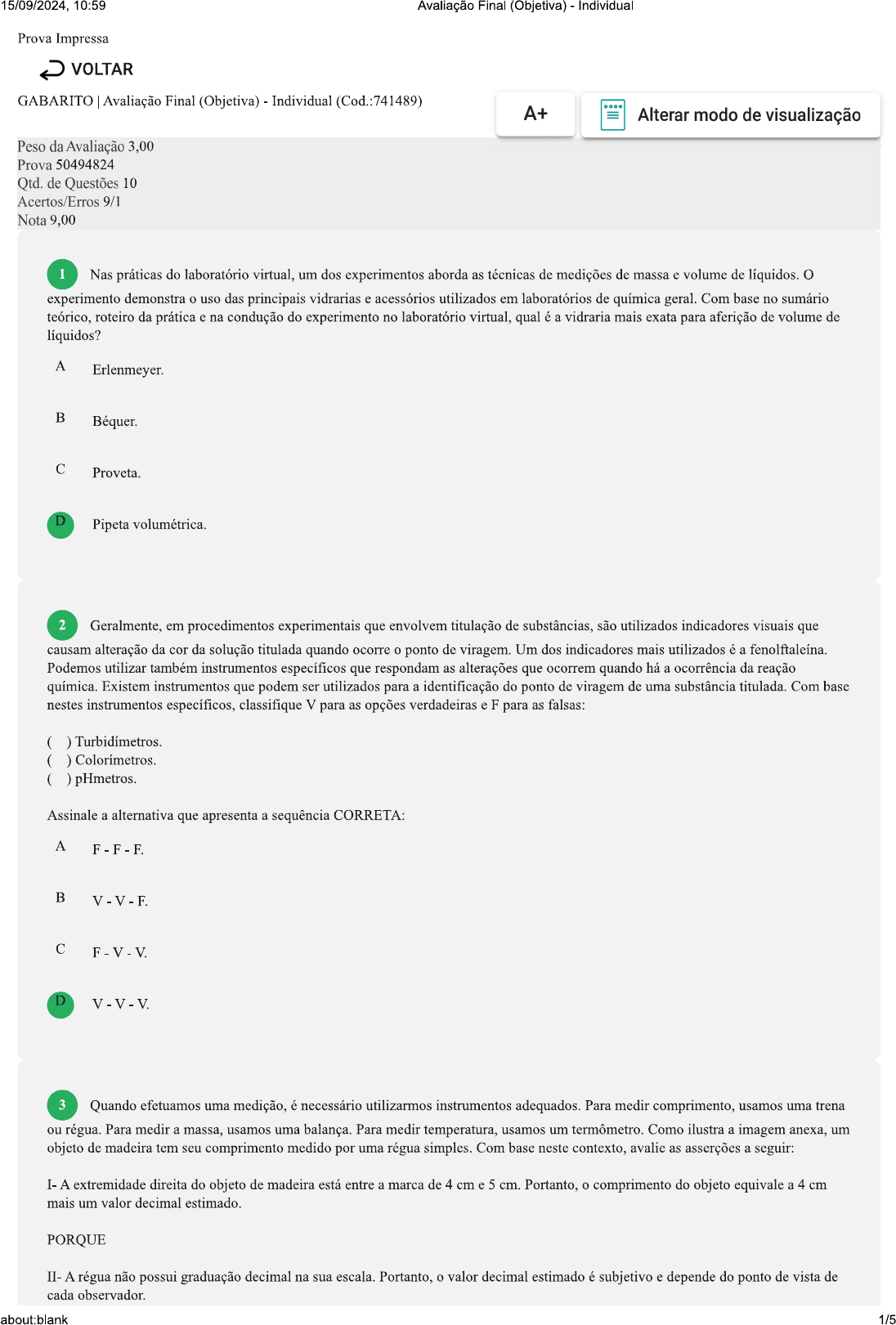 <p>15/09/2024, 10:59 Avaliação Final (Objetiva) Individual Prova Impressa VOLTAR GABARITO Avaliação Final (Objetiva) Individual (Cod.:741489) A+ Alterar modo de visualização Peso da Avaliação 3,00 Prova 50494824 Qtd. de Questões 10 Acertos/Erros 9/1 Nota 9,00 1 Nas práticas do laboratório virtual, um dos experimentos aborda as técnicas de medições de massa e volume de líquidos. experimento demonstra o uso das principais vidrarias e acessórios utilizados em laboratórios de química geral. Com base no sumário teórico, roteiro da prática e na condução do experimento no laboratório virtual, qual é a vidraria mais exata para aferição de volume de líquidos? A Erlenmeyer. B Béquer. C Proveta. D Pipeta volumétrica. 2 Geralmente, em procedimentos experimentais que envolvem titulação de substâncias, são utilizados indicadores visuais que causam alteração da cor da solução titulada quando ocorre o ponto de viragem. Um dos indicadores mais utilizados é a fenolftaleína. Podemos utilizar também instrumentos específicos que respondam as alterações que ocorrem quando há a ocorrência da reação química. Existem instrumentos que podem ser utilizados para a identificação do ponto de viragem de uma substância titulada. Com base nestes instrumentos específicos, classifique V para as opções verdadeiras e F para as falsas: ( ) Turbidímetros. ( ) Colorímetros. ( Assinale a alternativa que apresenta a sequência CORRETA: A B C D 3 Quando efetuamos uma medição, é necessário utilizarmos instrumentos adequados. Para medir comprimento, usamos uma trena ou régua. Para medir a massa, usamos uma balança. Para medir temperatura, usamos um termômetro. Como ilustra a imagem anexa, um objeto de madeira tem seu comprimento medido por uma régua simples. Com base neste contexto, avalie as asserções a seguir: I- A extremidade direita do objeto de madeira está entre a marca de 4 cm e 5 cm. Portanto, o comprimento do objeto equivale a 4 cm mais um valor decimal estimado. PORQUE II- A régua não possui graduação decimal na sua escala. Portanto, o valor decimal estimado é subjetivo e depende do ponto de vista de cada observador. about:blank 1/5</p><p>15/09/2024, 10:59 Avaliação Final (Objetiva) - Individual 0 2 3 4 5 Assinale a alternativa CORRETA: A A asserção II é uma proposição falsa e a asserção I é uma proposição verdadeira. B A asserção I é uma proposição falsa e a asserção II é uma proposição verdadeira. As asserções I e II são proposições verdadeiras e a asserção II é uma justificativa correta da asserção I. D As asserções I e II são proposições verdadeiras, mas a asserção II não é uma justificativa correta da asserção I. 4 Nas práticas do laboratório virtual, um dos experimentos aborda o processo de separação por filtração simples que permite separar os componentes que compõem duas ou mais fases de uma mistura heterogênea. A filtração simples é uma operação trivial de separação de uma mistura heterogênea no laboratório. Nesta técnica, vidrarias específicas e outros acessórios de laboratório são utilizados para montar o aparato experimental, por exemplo, o funil simples de vidro, suporte universal e o suporte anel ou argola. Com base no sumário teórico deste experimento, classifique V para as sentenças verdadeiras e F para as falsas: ( ) suporte universal, juntamente ao suporte anel ou argola, promove a estrutura para suportar o sistema de filtração. ( ) funil de vidro possui formato específico para abrigar a mistura heterogênea inserida, direcionar o fluxo do líquido filtrado, promover decantação do sólido retido e suportar o elemento filtrante. ( ) Com relação ao papel filtro inserido no funil de vidro, quanto maior for a sua abertura de malha, maior será sua capacidade de reter partículas sólidas. Assinale a alternativa que apresenta a sequência CORRETA: A F F V. B C D 5 Nas práticas do laboratório virtual, um dos experimentos aborda o processo de separação por filtração simples que permite separar os componentes que compõem duas ou mais fases de uma mistura heterogênea. A filtração simples é uma operação trivial de separação de uma mistura heterogênea no laboratório. Nesta técnica, vidrarias específicas e outros acessórios de laboratório são utilizados para montar o aparato experimental, por exemplo, o funil simples de vidro, suporte universal e o suporte anel ou argola. Com base nos conceitos explanados no sumário teórico, roteiro e testes deste experimento, analise as sentenças a seguir e identifique as misturas formadas por componentes separáveis pelo processo de filtração simples: I- Mistura de água e gasolina. II- Mistura de água e particulados sólidos. III- Mistura de ar atmosférico e poeira. Assinale a alternativa CORRETA: A Nenhuma das misturas é formada por componentes separáveis pelo processo de filtração simples. B As misturas das sentenças I e II são formadas por componentes separáveis pelo processo de filtração simples. As misturas das sentenças II e III são formadas por componentes separáveis pelo processo de filtração simples. about:blank 2/5</p><p>15/09/2024, 10:59 Avaliação Final (Objetiva) - Individual D Todas as misturas são formadas por componentes separáveis pelo processo de filtração simples. 6 Os métodos titulométricos ou titulometria são procedimentos quantitativos que se baseiam na medição de quantidade de um reagente que possui concentração conhecida e é consumido pelo analito (substância sendo analisada) até ocorrer a completa reação que é indicada, por exemplo, através de mudança de cor da solução ou mudança no pH. A figura anexa ilustra três etapas procedimentais para a correta execução da técnica de titulação de uma determinada substância. Sobre as etapas para a execução da técnica de titulação ordene os itens a seguir e assinale a alternativa que apresenta a 