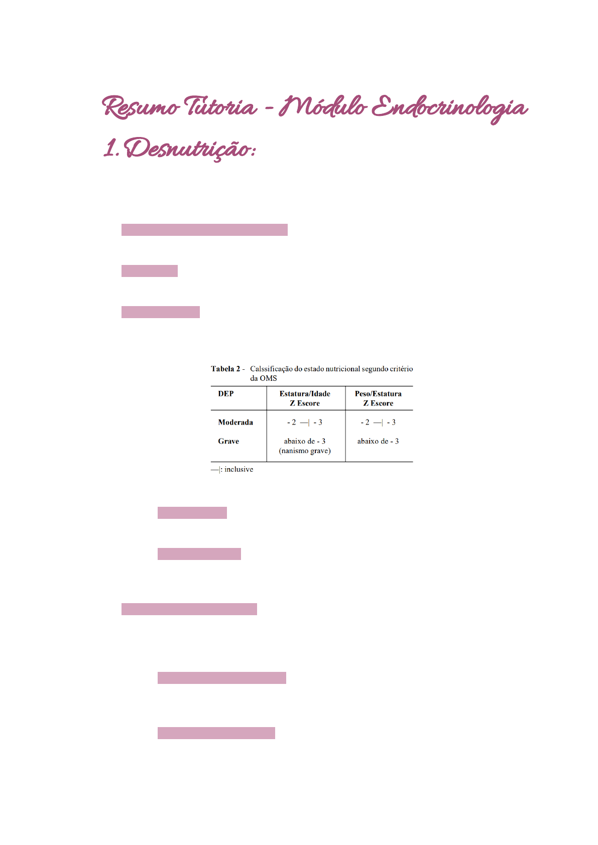 <p>Resumo Tutoria -Módulo Endocrinologia</p><p>1.Desnutrição:</p><p>● Diminuição da produção e aumento da resistência à insulina;</p><p>● Disfunção do sistema imune;</p><p>● Enteropatia por conta da inflamação do TGI → Atrofia das vilosidades →</p><p>Aumento da permeabilidade intestinal→ Intolerância à lactose;</p><p>● Distúrbios hidroeletrolíticos: Aumento do sódio dentro da célula;</p><p>hiponatremia; hipopotassemia; hipercalemia; edema intracelular;</p><p>● Disfunção na bomba de sódio e potássio;</p><p>● Marasmo: mais frequente em <6 meses; diminuição da massa muscular e do</p><p>tecido subcutâneo;perda da bola gordurosa de bichat; diminuição do peso</p><p>para a altura;</p><p>● Kwashiorkor: Mais comum entre 1-3 anos; maior letalidade; Edema bilateral</p><p>ascendente depressível simétrico até 3+; dermatoses; sinal da bandeira no</p><p>cabelo; esteatose e hepatomegalia; Rosto de lua;</p><p>● Classificação da OMS:</p><p>● Diagnóstico:</p><p>○ Até 6 meses: Curvas de P/I e P/E;</p><p>■ Moderada: escore Z entre -2 e -3;</p><p>■ Grave: escore Z menor que -3;</p><p>○ De 6-59 meses: Curvas de P/E, circunferência braquial e edema;</p><p>■ Moderada: P/E entre -2 e -3; CB 11,5-12,5;</p><p>■ Grave: P/E <-3; CB <11,5 e/ou edema;</p><p>● Critérios de internação: menor que 6 meses; Edema 3+; falha no teste do</p><p>apetite; falha no tratamento ambulatorial; complicações clínicas (sepse,</p><p>hipoglicemia persistente, pneumonia, diarreia com desidratação grave,</p><p>letargia, xeroftalmia, lesões epiteliais graves e etc);</p><p>● Tratamento:</p><p>○ Fase 1 (estabilização): taxa calórica de 100kcal/kg/dia; 1-1,5g/kg/dia</p><p>de proteína por 1-7 dias;</p><p>■ A preparado alimentar artesanal tem 75kcal e 0,9g de</p><p>proteína/100mL;</p><p>○ Fase 2 (reabilitação): taxa calórica de 150kcal/kg/dia; 3-4g/kg/dia de</p><p>proteína; oferta hídrica de 150-200ml/kg/dia; (Um ganho de peso</p><p>considerado bom é de 10g/kg/dia);</p><p>■ A preparado alimentar artesanal tem 100kcal e 2,9g de</p><p>proteína/100mL;</p><p>● Critérios de alta: ganho de peso consecutivo por 3 dias, sem edema, aceitar</p><p>bem a alimentação, completado o esquema de antibióticos, ter feito a</p><p>suplementação de micronutrientes, condições de cuidar da criança em casa;</p><p>● Antibioticoterapia empírica:</p><p>○ Sem complicações: Amoxicilina VO;</p><p>○ Cm complicações: Ampicilina + Gentamicina EV;</p><p>● Desidratação:</p><p>○ Leve: 5ml/kg após cada evacuação diarreica;</p><p>○ Moderada/grave: 20ml/kg nas primeiras 2h; seguida por 10ml/kg após</p><p>as duas primeiras horas;</p><p>2. Obesidade:</p><p>● No BR 40% da população adulta têm sobrepeso e 10% têm obesidade;</p><p>● A etiologia é complexa e multifatorial; Pode ter causas secundárias;</p><p>● Há um consumo de quilocalorias superior ao gasto calórico diário;</p><p>● A taxa metabólica basal é proporcional à massa magra;</p><p>● Centros hipotalâmicos regulam o apetite e a saciedade;</p><p>○ Leptina: secretada pelos adipócitos em resposta a hiperalimentação;</p><p>Ela inibe o apetite e ativa a saciedade, bloqueando a liberação</p><p>hipotalâmica de neuropeptídeo Y (que é um estimulador central do</p><p>apetite);</p><p>○ Grelina: liberada pelo estômago e pelo duodeno com a função de</p><p>aumentar o apetite;</p><p>● Diagnóstico e classificações:</p><p>● Tratamento:</p><p>○ Objetivo de reduzir de 5-10% do peso anterior em um período de 6</p><p>meses e manter a perda de peso a longo prazo;</p><p>○ Terapia multidisciplinar;</p><p>○ Dieta hipocalórica: balanço negativo de 500-1000kcal/dia;</p><p>○ Exercícios físicos regulares;</p><p>○ Indicações para tratamento com terapia medicamentosa:</p><p>○ Terapia medicamentosa:</p><p>■ Orlistat: 120 mg, três vezes ao dia, com as refeições principais.</p><p>Inibe a lipase gastrointestinal, reduzindo a absorção de</p><p>gorduras no trato gastrointestinal.</p><p>■ Topiramato: Dose inicial: 3,75 mg de fentermina e 23 mg de</p><p>topiramato uma vez ao dia por 14 dias.Dose de manutenção:</p><p>Pode ser aumentada para 15 mg de fentermina e 92 mg de</p><p>topiramato por dia. Reduz o apetite e aumenta a saciedade pela</p><p>modulação dos neurotransmissores.</p><p>■ Bupropiona/Naltrexon: Dose inicial: 8 mg de naltrexona e 90</p><p>mg de bupropiona duas vezes ao dia. Dose de manutenção:</p><p>Pode ser aumentada até 32 mg de naltrexona e 360 mg de</p><p>bupropiona duas vezes ao dia.</p><p>■ Liraglutida (Saxenda): Dose inicial: 0,6 mg por dia. A dose</p><p>pode ser aumentada semanalmente até 3 mg por dia. Imita a</p><p>ação do hormônio GLP-1, que ajuda a regular o apetite e a</p><p>ingestão de alimentos.</p><p>■ Semaglutida: Dose inicial: 0,25 mg por semana. Dose de</p><p>manutenção: Pode ser aumentada até 2,4 mg. Mimetiza o GLP-1</p><p>para ajudar a controlar o apetite e promover a perda de peso.</p><p>■ De acordo com as comorbidades: indivíduos com enxaqueca</p><p>podem preferir fentermina-topiramato porque o topiramato é</p><p>eficaz para profilaxia de enxaqueca. Naltrexona-bupropiona é</p><p>uma opção razoável para indivíduos que fumam e têm</p><p>depressão.Também pode beneficiar pessoas com obesidade e</p><p>transtorno de uso de álcool comórbido;</p><p>■ Os análogos de GLP-1 são preferíveis em indivíduos com</p><p>comorbidades cardiovasculares;</p><p>● Indicações para cirúrgia bariátrica:</p><p>3. DM2:</p><p>● Comprometimento relativo ou absoluto na secreção de insulina, juntamente</p><p>com graus variados de resistência periférica à sua ação;</p><p>● A DM2 corresponde à 90-95% dos casos de DM;</p><p>● Hiperglicemia + hipoglucagonemia + aumento da produção hepática de</p><p>glicose + disfunção incretínica + aumento da lipólise e de ácidos graxos livres +</p><p>aumento da reabs