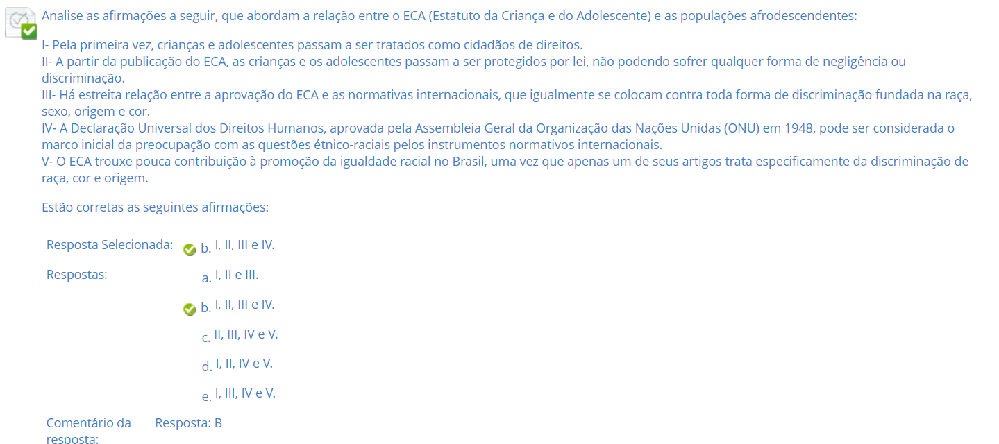 <p>Analise as afirmações a seguir, que abordam a relação entre o ECA (Estatuto da Criança e do Adolescente) e as populações afrodescendentes: Pela primeira vez, crianças e adolescentes passam a ser tratados como cidadãos de A partir da publicação do ECA, as crianças e os adolescentes passam a ser protegidos por lei, não podendo sofrer qualquer forma de negligência ou discriminação. III- Há estreita relação entre a aprovação do ECA e as normativas internacionais, que igualmente se colocam contra toda forma de discriminação fundada na raça, sexo, origem e cor. IV- A Declaração Universal dos Direitos Humanos, aprovada pela Assembleia Geral da Organização das Nações Unidas (ONU) em 1948, pode ser considerada o marco inicial da preocupação com as questões étnico-raciais pelos instrumentos normativos internacionais. V- ECA trouxe pouca contribuição à promoção da igualdade racial no Brasil, uma vez que apenas um de seus artigos trata especificamente da discriminação de raça, cor e origem. Estão corretas as seguintes afirmações: Resposta Selecionada: b. I, II, III e IV. Respostas: a. I, e III. b. I, II, III e IV. C. II, III, IV e V. d. II, IV e V. e. I, Comentário da Resposta: B resposta:</p>