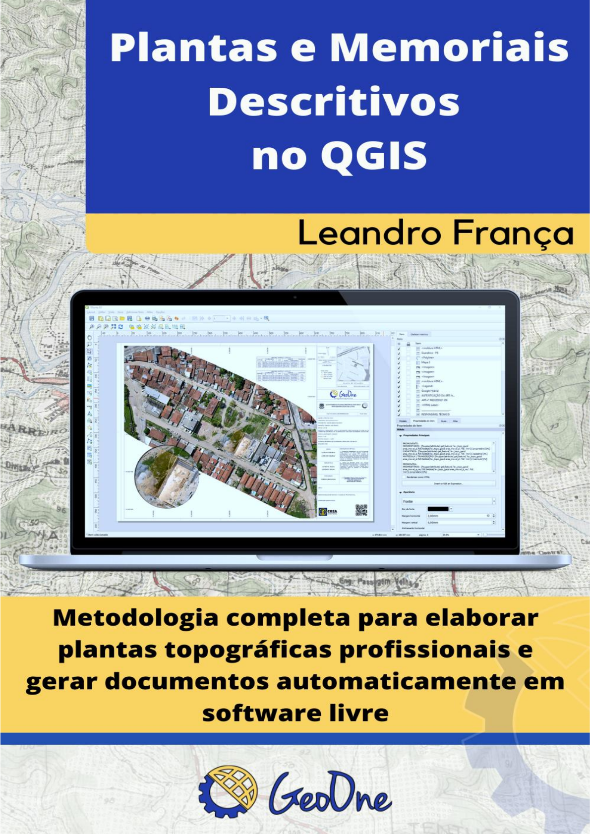 <p>1</p><p>Plantas e Memoriais Descritivos no</p><p>QGIS</p><p>Metodologia completa para elaborar plantas topográficas</p><p>profissionais e gerar documentos automaticamente em</p><p>software livre</p><p>Leandro França</p><p>2</p><p>© 2021 by Leandro Luiz Silva de França</p><p>Todos os direitos reservados. Nenhuma parte desta publicação poderá ser reproduzida ou</p><p>transmitida de qualquer modo ou por qualquer outro meio, eletrônico ou mecânico,</p><p>incluindo fotocópia, gravação ou qualquer outro tipo de sistema de armazenamento e</p><p>transmissão de informação, sem prévia autorização da GeoOne.</p><p>Capa: Gilveson Silva de Assunção</p><p>Colaboração: Alexandre Claudino Santana</p><p>Edição: GeoOne</p><p>França, Leandro Luiz Silva de</p><p>Plantas e memoriais descritivos no QGIS [livro eletrônico] : metodologia completa</p><p>para elaborar plantas topográficas profissionais e gerar documentos automaticamente</p><p>em software livre / Leandro França. -- 1. ed. -- João Pessoa, PB : GeoOne, 2021.</p><p>Bibliografia</p><p>ISBN 978-65-00-23920-1</p><p>1. Cartografia 2. Geografia 3. Plantas I. Título.</p><p>CDD-526</p><p>GeoOne</p><p>Contato: contato@geoone.com.br</p><p>3</p><p>Agradeço a Deus por esta obra</p><p>e dedico à minha esposa Mairla</p><p>e ao meu filho Lael</p><p>4</p><p>APRESENTAÇÃO</p><p>A história de elaborar Plantas e Memoriais em minha vida teve início quando</p><p>passei a atuar como engenheiro cartógrafo na antiga 3ª Divisão de Levantamento (3ª DL)</p><p>em Olinda-PE, hoje denominada de 3º Centro de Geoinformação, uma organização</p><p>militar do Exército responsável pelo mapeamento sistemático do nordeste brasileiro.</p><p>No ano em que eu me apresentei para servir na 3ª DL, em 2016, vivenciei uma</p><p>verdadeira transição dos projetos de Cartografia do ArcGIS para o QGIS, isto é, de um</p><p>software proprietário (pago) para outro livre (gratuito).</p><p>Assim, tive logo que participar ativamente dessa transição e me adaptar a essas</p><p>mudanças, tendo em vista que a bagagem que trazia era de SIG com o ArcGIS, adquiridas</p><p>no Instituto Militar de Engenharia (IME) e na Texas Tech University (TTU), nos EUA.</p><p>Após um ano de uso e estudo do QGIS, identifiquei a enorme potencialidade que</p><p>esse software livre e de código aberto poderia trazer não só para a Cartografia, como</p><p>também para diversas outras áreas afins.</p><p>A partir desse momento, comecei a estudar profundamente Python aplicado ao</p><p>QGIS (PyQGIS), buscando me capacitar de todas as formas disponíveis a meu alcance</p><p>como: livros, fóruns, blogs e tutoriais na internet, de tal forma que em 2017 já comecei a</p><p>escrever os meus primeiros scripts.</p><p>No ano seguinte, em 2018, tive a oportunidade de chefiar uma equipe de trabalho</p><p>de campo que tinha como missão o levantamento topográfico de alguns imóveis da União.</p><p>Nessa ocasião, pude perceber que a equipe tinha uma forte necessidade de elaborar as</p><p>plantas e memoriais em softwares de CAD.</p><p>Além disso, durante esses trabalhos, pude constatar uma série de dificuldades,</p><p>podendo ser citadas:</p><p>● Apenas um computador para realizar a tarefa, havendo a necessidade de uma</p><p>chave (Hardlock);</p><p>● Perda de tempo, não havendo uma metodologia bem definida de execução da</p><p>planta;</p><p>● Poucos profissionais tinham o completo domínio do software, devido ou número</p><p>de licenças e à documentação escassa;</p><p>● O software de CAD não possuir código aberto, ficando difícil qualquer</p><p>automatização ou implementação;</p><p>● E o pior, a necessidade de atualizações, com um custo anual considerável para os</p><p>cofres públicos.</p><p>5</p><p>Diante de todos esses problemas, propus-me a ajudar a equipe técnica, buscando</p><p>desenvolver uma metodologia de trabalho no QGIS que chegasse ao mesmo resultado do</p><p>software pago.</p><p>Partindo dessa iniciativa, foi pensado em um modelo de dados que otimizasse a</p><p>aquisição das informações dos limites de um imóvel, bem como ferramentas em Python</p><p>que pudessem gerar automaticamente todas as peças técnicas e itens da planta topográfica.</p><p>O sucesso do método e, principalmente, da qualidade dos resultados alcançados</p><p>foi tão grande que vários alunos e pessoas que presto consultoria me pediram para que eu</p><p>produzisse um material didático que aprofundasse sobre a metodologia de elaboração de</p><p>plantas e documentos do levantamento topográfico no QGIS.</p><p>Deste modo, este livro busca explicar detalhadamente a base de criação do</p><p>método, ou seja, o modelo de dados TopoGeo e sua implementação no formato</p><p>Geopackage, bem como todo o procedimento de execução para se chegar ao resultado de</p><p>uma planta topográfica e a geração automática das documentações do imóvel (memorial</p><p>descritivo, monografia de marco, entre outras).</p><p>6</p><p>SOBRE O AUTOR</p><p>Leandro Luiz Silva de França é engenheiro cartógrafo pelo</p><p>Instituto Militar de Engenharia (IME) com período cursado</p><p>na Texas Tech University (TTU), nos Estados Unidos da</p><p>América. Também possui graduação em Ciências Militares</p><p>pela Academia Militar das Agulhas Negras (AMAN) e</p><p>mestrado em Ciências Geodésicas e Tecnologias da</p><p>Geoinformação pela Universidade Federal de Pernambuco (UFPE).</p><p>Desenvolvedor Python de ferramentas para o QGIS voltadas ao mapeamento</p><p>topográfico, banco de dados PostgreSQL/PostGIS e controle de qualidade de</p><p>dados geoespaciais. Pesquisador das seguintes áreas: Cartografia, Geodésia,</p><p>Sistema de Informações Geográficas (SIG), Sensoriamento Remoto e Análise de</p><p>Dados Espaciais. Atua também como Professor de pós-graduação, Perito Judicial</p><p>e Consultor de empresas de Geotecnologias. Como autor do plugin do QGIS “LF</p><p>Tool