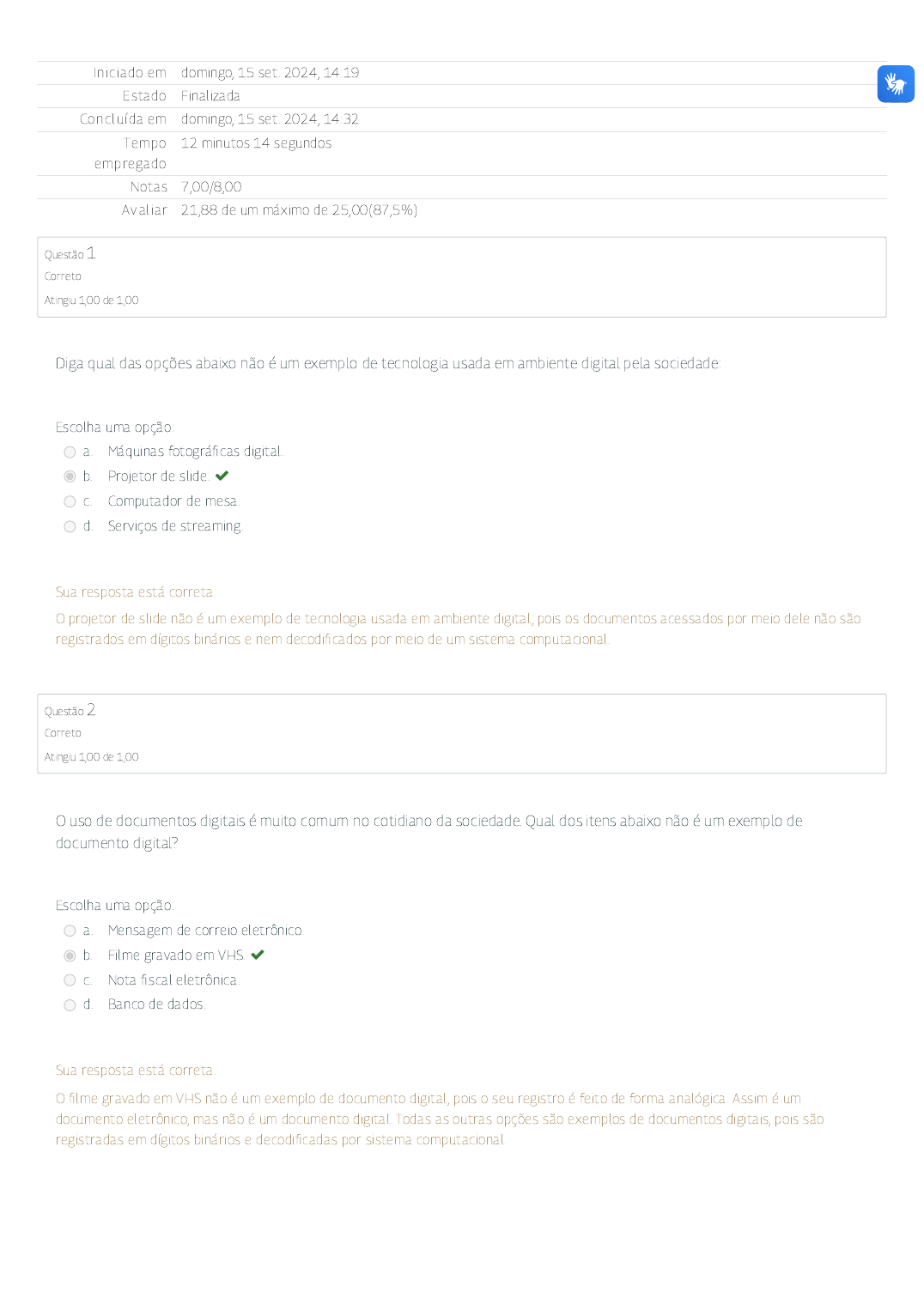 <p>15/09/2024 14:32 Exercício Avaliativo - Módulo 3: Revisão da tentativa</p><p>https://mooc41.escolavirtual.gov.br/mod/quiz/review.php?attempt=6552270&cmid=118459 1/4</p><p>In ic iado em domingo, 15 set. 2024, 14:19</p><p>Estado Finalizada</p><p>Conclu ída em domingo, 15 set. 2024, 14:32</p><p>Tempo</p><p>empregado</p><p>12 minutos 14 segundos</p><p>Notas 7,00/8,00</p><p>Av al iar 21,88 de um máximo de 25,00(87,5%)</p><p>Questão 1</p><p>Correto</p><p>Atingiu 1,00 de 1,00</p><p>Questão 2</p><p>Correto</p><p>Atingiu 1,00 de 1,00</p><p>Diga qual das opções abaixo não é um exemplo de tecnologia usada em ambiente digital pela sociedade:</p><p>Escolha uma opção:</p><p>a . Máquinas fotográ�cas digital .</p><p>b. Projetor de slide. </p><p>c. Computador de mesa.</p><p>d. Serviços de streaming.</p><p>Sua resposta está correta .</p><p>O projetor de slide não é um exemplo de tecnologia usada em ambiente digital , pois os documentos acessados por meio dele não são</p><p>registrados em dígitos binários e nem decodi�cados por meio de um sistema computacional.</p><p>O uso de documentos digitais é muito comum no cotidiano da sociedade. Qual dos itens abaixo não é um exemplo de</p><p>documento digital?</p><p>Escolha uma opção:</p><p>a . Mensagem de correio eletrônico.</p><p>b. Filme gravado em VHS. </p><p>c. Nota �scal eletrônica .</p><p>d. Banco de dados.</p><p>Sua resposta está correta .</p><p>O �lme gravado em VHS não é um exemplo de documento digital , pois o seu registro é feito de forma analógica . Assim é um</p><p>documento eletrônico, mas não é um documento digital . Todas as outras opções são exemplos de documentos digitais, pois são</p><p>registradas em dígitos binários e decodi�cadas por sistema computacional.</p><p>15/09/2024 14:32 Exercício Avaliativo - Módulo 3: Revisão da tentativa</p><p>https://mooc41.escolavirtual.gov.br/mod/quiz/review.php?attempt=6552270&cmid=118459 2/4</p><p>Questão 3</p><p>Correto</p><p>Atingiu 1,00 de 1,00</p><p>Questão 4</p><p>Correto</p><p>Atingiu 1,00 de 1,00</p><p>Quais são as vantagens do uso dos documentos digitais para as instituições públicas e privadas?</p><p>Escolha uma opção:</p><p>a . Necessidade de equipamento especí�co como hardware e so�ware para acesso e interpretação.</p><p>b. Facilidade na reprodução de cópias.</p><p>c. Ampliação na produtividade, otimização do �uxo de trabalho, facilidade de gerenciamento e rapidez na recuperação. </p><p>d. Facilidade de intervenção humana nos documentos.</p><p>Sua resposta está correta .</p><p>A ampliação na produtividade, otimização do �uxo de trabalho, facilidade de gerenciamento e rapidez na recuperação são vantagens,</p><p>pois as redes de computadores permitem que os documentos sejam distribuídos globalmente, de maneira ágil , para diferentes</p><p>propósitos. Possibilitando que decisões sejam tomadas rapidamente e as atividades sejam realizadas sem as di�culdades impostas</p><p>pela distância e burocracias desnecessárias.</p><p>Qual dos itens abaixo não é uma mídia de armazenamento?</p><p>Escolha uma opção:</p><p>a . Impressora . </p><p>b. Pen drive.</p><p>c. Hard Disk – HD Externo.</p><p>d. Compact Disc – CD.</p><p>Sua resposta está correta .</p><p>A impressora não é uma mídia de armazenamento, ela é um dispositivo de saída que possibilita a produção de um documento</p><p>impresso a partir de um documento digital . A impressão pode ser caracterizada como reformatação de um documento digital para um</p><p>não digital . Todas as outras opções são suportes f ísicos que possibilitam o armazenamento de documentos digitais.</p><p>15/09/2024 14:32 Exercício Avaliativo - Módulo 3: Revisão da tentativa</p><p>https://mooc41.escolavirtual.gov.br/mod/quiz/review.php?attempt=6552270&cmid=118459 3/4</p><p>Questão 5</p><p>Incorreto</p><p>Atingiu 0,00 de 1,00</p><p>Questão 6</p><p>Correto</p><p>Atingiu 1,00 de 1,00</p><p>Qual item abaixo não é um documento eletrônico?</p><p>Escolha uma opção:</p><p>a . Filme em �ta VHS. </p><p>b. Nota �scal eletrônica .</p><p>c. Música em �ta cassete.</p><p>d. Negativo fotográ�co.</p><p>Sua resposta está incorreta .</p><p>O negativo fotográ�co não é um documento eletrônico, pois é compreensível diretamente pela visão humana, sem a necessidade de</p><p>um equipamento eletrônico para sua visualização.</p><p>Qual característica abaixo não pertence ao documento arquivístico digital?</p><p>Escolha uma opção:</p><p>a . Produzido ou recebido por pessoa f ísica ou jurídica .</p><p>b. Não depende de recursos computacionais. </p><p>c. Codi�cado em dígitos binários.</p><p>d. Não possui conteúdo e forma intimamente ligados ao suporte.</p><p>Sua resposta está correta .</p><p>O documento arquivístico digital é aquele produzido ou recebido por pessoa f ísica ou jurídica , no decorrer de suas atividades, qualquer</p><p>que seja o suporte, dotado de organicidade, codi�cado em dígitos binários, acessível e interpretável por meio de recursos</p><p>computacionais. Seu conteúdo e forma são separados do suporte.</p><p>15/09/2024 14:32 Exercício Avaliativo - Módulo 3: Revisão da tentativa</p><p>https://mooc41.escolavirtual.gov.br/mod/quiz/review.php?attempt=6552270&cmid=118459 4/4</p><p>Questão 7</p><p>Correto</p><p>Atingiu 1,00 de 1,00</p><p>Questão 8</p><p>Correto</p><p>Atingiu 1,00 de 1,00</p><p>Como são denominadas as dimensões em que se apresentam os documentos digitais?</p><p>Escolha uma opção:</p><p>a . Forma documental �xa e conteúdo estável.</p><p>b. Objeto f ísico, objeto lógico e objeto conceitual . </p><p>c. Obsolescência tecnológica .</p><p>d. Linguagem binária .</p><p>Sua resposta está correta .</p><p>Objeto f ísico, objeto lógico e objeto conceitual são as dimensões em que se apresentam os documentos digitais. O objeto conceitual é</p><p>o que se manifesta para o usuário, o objeto lóg