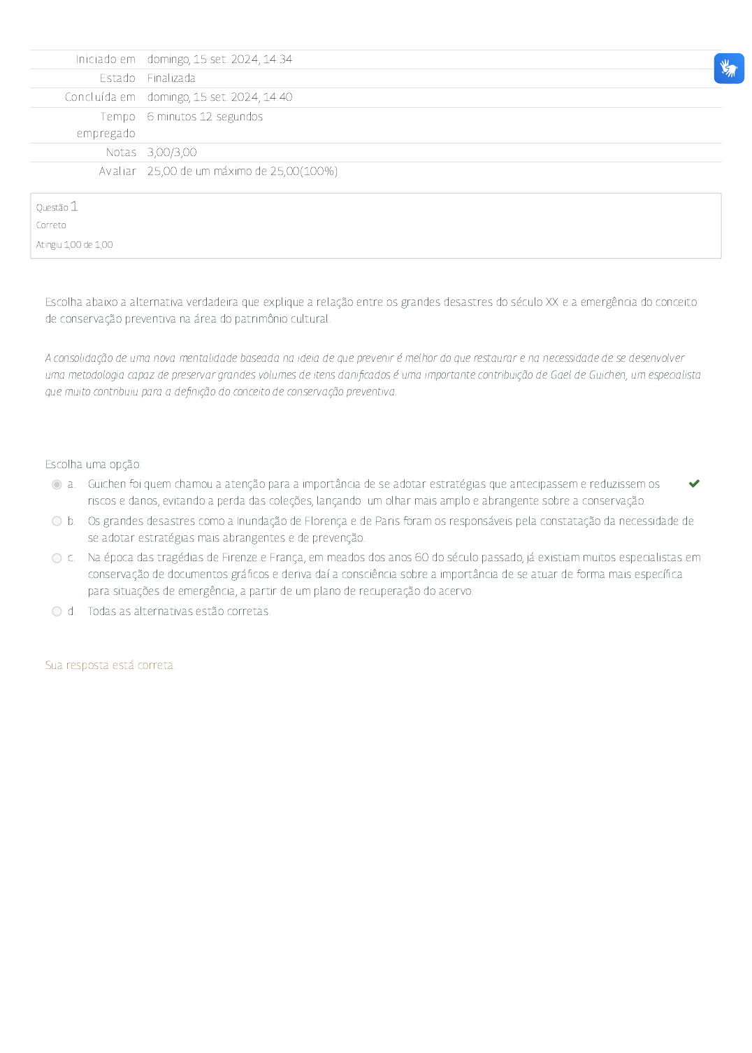 <p>15/09/2024 14:41 Atividade avaliativa - Módulo 4: Revisão da tentativa</p><p>https://mooc41.escolavirtual.gov.br/mod/quiz/review.php?attempt=6552455&cmid=118461 1/2</p><p>In ic iado em domingo, 15 set. 2024, 14:34</p><p>Estado Finalizada</p><p>Conclu ída em domingo, 15 set. 2024, 14:40</p><p>Tempo</p><p>empregado</p><p>6 minutos 12 segundos</p><p>Notas 3,00/3,00</p><p>Av al iar 25,00 de um máximo de 25,00(100%)</p><p>Questão 1</p><p>Correto</p><p>Atingiu 1,00 de 1,00</p><p>Escolha abaixo a alternativa verdadeira que explique a relação entre os grandes desastres do século XX e a emergência do conceito</p><p>de conservação preventiva na área do patrimônio cultural .</p><p>A consolidação de uma nova mentalidade baseada na ideia de que prevenir é melhor do que restaurar e na necessidade de se desenvolver</p><p>uma metodologia capaz de preservar grandes volumes de itens dani�cados é uma importante contribuição de Gael de Guichen, um especialista</p><p>que muito contribuiu para a de�nição do conceito de conservação preventiva .</p><p>Escolha uma opção:</p><p>a . Güichen foi quem chamou a atenção para a importância de se adotar estratégias que antecipassem e reduzissem os</p><p>riscos e danos, evitando a perda das coleções, lançando um olhar mais amplo e abrangente sobre a conservação.</p><p></p><p>b. Os grandes desastres como a Inundação de Florença e de Paris foram os responsáveis pela constatação da necessidade de</p><p>se adotar estratégias mais abrangentes e de prevenção.</p><p>c. Na época das tragédias de Firenze e França, em meados dos anos 60 do século passado, já existiam muitos especialistas em</p><p>conservação de documentos grá�cos e deriva daí a consciência sobre a importância de se atuar de forma mais especí�ca</p><p>para situações de emergência , a partir de um plano de recuperação do acervo.</p><p>d. Todas as alternativas estão corretas.</p><p>Sua resposta está correta .</p><p>15/09/2024 14:41 Atividade avaliativa - Módulo 4: Revisão da tentativa</p><p>https://mooc41.escolavirtual.gov.br/mod/quiz/review.php?attempt=6552455&cmid=118461 2/2</p><p>Questão 2</p><p>Correto</p><p>Atingiu 1,00 de 1,00</p><p>Questão 3</p><p>Correto</p><p>Atingiu 1,00 de 1,00</p><p>Preencha as lacunas abaixo:</p><p>Onde se viam objetos , hoje devem ser vistas coleções . Onde se viam</p><p>depósitos devem ser vistos edif ícios . Onde se pensava em dias ,</p><p>agora se deve pensar em anos . Onde se via uma uma pessoa , devem ser vistas</p><p>equipes . Onde se via uma despesa de curto prazo , se deve ver um investimento de</p><p>longo prazo . Onde se mostram ações cotidianas , devem ser vistos programas e prioridades</p><p> . A conservação preventiva signi�ca e assegura a sobrevida das coleções.</p><p>Sua resposta está correta .</p><p>Associe os termos e conceitos relacionados à Preservação de documentos com os seus respectivos signi�cados:</p><p>Medidas e ações diretas e indiretas que buscam prevenir e/ou retardar riscos de danos ou perdas e</p><p>que tem impacto sobre o contexto ou a coleção como um todo, independente de sua idade ou</p><p>estado de conservação. </p><p>São intervenções f ísicas no objeto, com ênfase na estabilização ou reversão dos processos de</p><p>degradação. Estas ações são muito especializadas e devem ser realizadas somente quando o bem</p><p>perdeu sua função. </p><p>Atividade que adota medidas interventivas, para que um determinado bem experimente o mínimo de</p><p>alterações possíveis durante o maior tempo possível .</p><p></p><p>Atividade multidisciplinar, responsável pela gestão e administração de recursos �nanceiros, humanos</p><p>e materiais, dedicados a garantir a integridade f ísica dos documentos e o acesso às gerações</p><p>presentes e futuras. </p><p>Conservação preventiva</p><p>Restauração</p><p>Conservação</p><p>Preservação</p><p>Sua resposta está correta .</p>