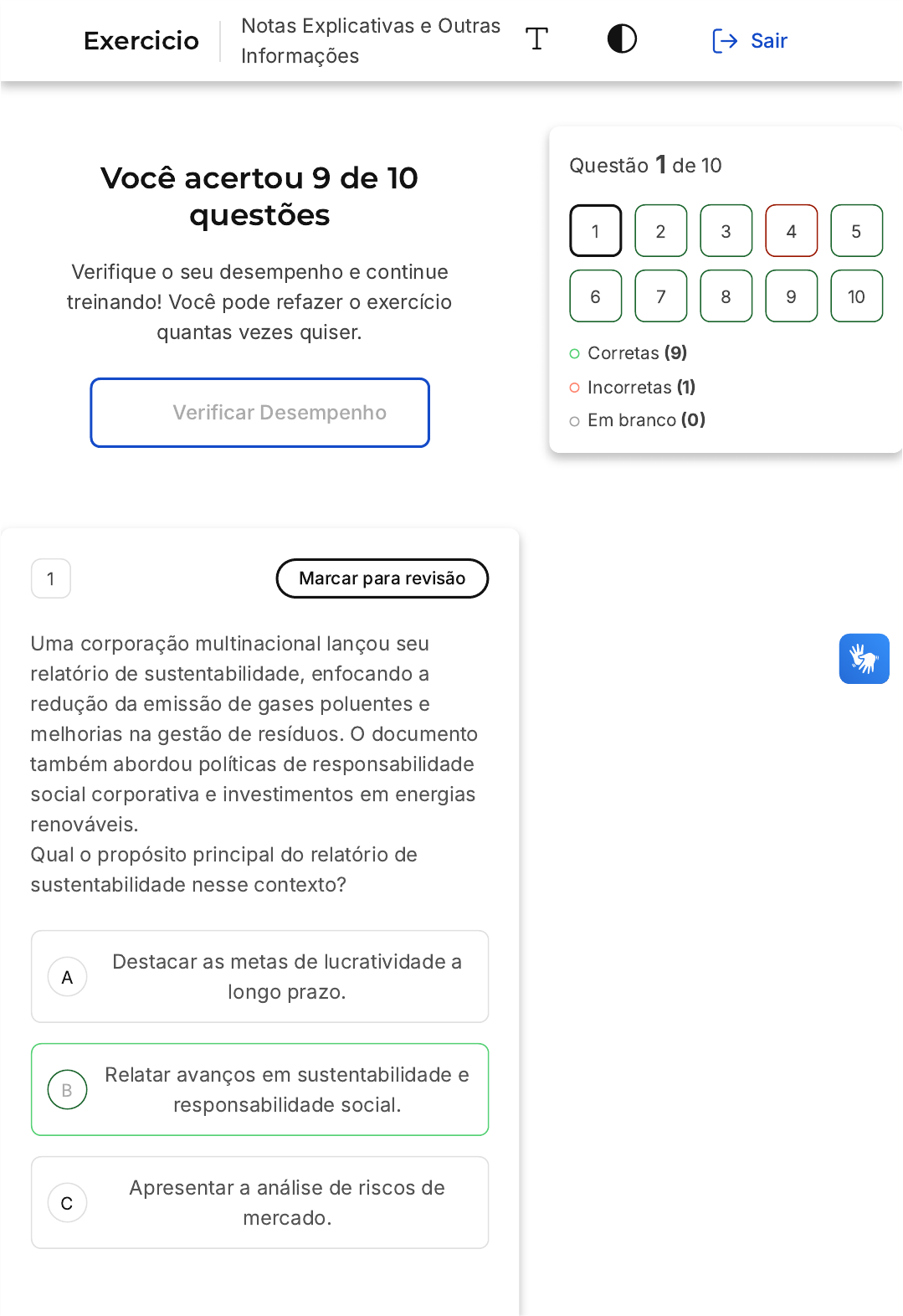 <p>Você acertou 9 de 10</p><p>questões</p><p>Verifique o seu desempenho e continue</p><p>treinando! Você pode refazer o exercício</p><p>quantas vezes quiser.</p><p>Verificar Desempenho</p><p>A</p><p>B</p><p>C</p><p>1 Marcar para revisão</p><p>Uma corporação multinacional lançou seu</p><p>relatório de sustentabilidade, enfocando a</p><p>redução da emissão de gases poluentes e</p><p>melhorias na gestão de resíduos. O documento</p><p>também abordou políticas de responsabilidade</p><p>social corporativa e investimentos em energias</p><p>renováveis.</p><p>Qual o propósito principal do relatório de</p><p>sustentabilidade nesse contexto?</p><p>Destacar as metas de lucratividade a</p><p>longo prazo.</p><p>Relatar avanços em sustentabilidade e</p><p>responsabilidade social.</p><p>Apresentar a análise de riscos de</p><p>mercado.</p><p>Questão 1 de 10</p><p>Corretas �9�</p><p>Incorretas �1�</p><p>Em branco �0�</p><p>1 2 3 4 5</p><p>6 7 8 9 10</p><p>Exercicio</p><p>Notas Explicativas e Outras</p><p>Informações</p><p>Sair</p><p>D</p><p>E</p><p>Detalhar novas parcerias comerciais.</p><p>Comparar a performance financeira</p><p>anual.</p><p>Resposta correta</p><p>Parabéns, você selecionou a</p><p>alternativa correta. Confira o</p><p>gabarito comentado!</p><p>Gabarito Comentado</p><p>O relatório de sustentabilidade de uma</p><p>empresa, como descrito, foca em</p><p>demonstrar os esforços e progressos feitos</p><p>em áreas como sustentabilidade ambiental</p><p>e responsabilidade social, incluindo a</p><p>redução de impactos ambientais e a</p><p>implementação de práticas socialmente</p><p>responsáveis.</p><p>2 Marcar para revisão</p><p>As notas explicativas devem ser apresentadas,</p><p>tanto quanto seja praticável, de forma</p><p>sistemática. Na determinação de forma</p><p>sistemática, a entidade deve considerar os</p><p>efeitos sobre a compreensibilidade e a</p><p>comparabilidade das suas demonstrações</p><p>contábeis. Cada item das demonstrações</p><p>contábeis deve ter ______________ com a</p><p>respectiva informação apresentada nas notas</p><p>explicativas.</p><p>A</p><p>B</p><p>C</p><p>D</p><p>E</p><p>Desempenho financeiro.</p><p>Posição financeira.</p><p>Divulgação não financeira.</p><p>Referência cruzada.</p><p>Pronunciamento técnico.</p><p>Resposta correta</p><p>Parabéns, você selecionou a</p><p>alternativa correta. Confira o</p><p>gabarito comentado!</p><p>Gabarito Comentado</p><p>A referência cruzada é um mecanismo que</p><p>permite ao usuário das demonstrações</p><p>contábeis identificar a informação</p><p>relevante para a compreensão de um</p><p>determinado item das demonstrações</p><p>contábeis. A referência cruzada pode ser</p><p>feita por meio de números, letras ou</p><p>símbolos.</p><p>3 Marcar para revisão</p><p>A divulgação de determinadas políticas</p><p>contábeis é especialmente útil para os usuários</p><p>quando estas são selecionadas entre</p><p>alternativas permitidas em pronunciamento</p><p>técnico, interpretação e orientações técnicas</p><p>A</p><p>B</p><p>C</p><p>D</p><p>E</p><p>emitidos pelo CPC. Quando uma política</p><p>contábil pode ser significativa na elaboração</p><p>das notas explicativas?</p><p>Quando a retificação de erro for</p><p>irrelevante.</p><p>Quando o valor dos julgamentos</p><p>ultrapassar 75% do capital social.</p><p>Devido à natureza das operações da</p><p>entidade.</p><p>Em decorrência da avaliação das</p><p>ações pelos acionistas</p><p>Devido à estimativa do valor justo.</p><p>Resposta correta</p><p>Parabéns, você selecionou a</p><p>alternativa correta. Confira o</p><p>gabarito comentado!</p><p>Gabarito Comentado</p><p>A divulgação de determinadas políticas</p><p>contábeis é especialmente útil para os</p><p>usuários quando estas são selecionadas</p><p>entre alternativas permitidas em</p><p>pronunciamento técnico, interpretação e</p><p>orientações técnicas emitidos pelo CPC.</p><p>Quando uma política contábil pode ser</p><p>significativa na elaboração das notas</p><p>explicativas? A resposta correta é: Devido à</p><p>natureza das operações da entidade.</p><p>A</p><p>B</p><p>C</p><p>D</p><p>E</p><p>4 Marcar para revisão</p><p>De acordo com o que estabelece a Lei n º</p><p>6.404/76, Art. 176 �Lei das S/A�, a estrutura das</p><p>notas explicativas deve apresentar a seguinte</p><p>forma:</p><p>Fornecer informações adicionais</p><p>indicadas nas próprias demonstrações</p><p>financeiras e consideradas</p><p>necessárias para uma apresentação</p><p>adequada.</p><p>Apresentar informações sobre a base</p><p>de preparação das demonstrações</p><p>financeiras e, somente na ausência</p><p>desta informação, divulgar as práticas</p><p>contábeis específicas selecionadas e</p><p>aplicadas para negócios e eventos</p><p>significativos.</p><p>Divulgar os principais critérios de</p><p>avaliação dos elementos patrimoniais,</p><p>especialmente estoque, cálculos de</p><p>depreciação, amortização e exaustão</p><p>de constituição de provisões para</p><p>encargos e riscos.</p><p>Divulgar os investimentos em outras</p><p>sociedades, mesmo quando for</p><p>irrelevante.</p><p>A estrutura das notas explicativas não</p><p>contempla informações sobre as taxas</p><p>de juros, as datas de vencimento e as</p><p>garantias das obrigações a longo</p><p>prazo.</p><p>A</p><p>B</p><p>Resposta incorreta</p><p>Opa! A alternativa correta é a letra</p><p>C. Confira o gabarito comentado!</p><p>Gabarito Comentado</p><p>A Lei n º 6.404/76, Art. 176 �Lei das S/A�,</p><p>determina que as notas explicativas devem</p><p>divulgar os principais critérios de avaliação</p><p>dos elementos patrimoniais, especialmente</p><p>estoque, cálculos de depreciação,</p><p>amortização e exaustão de constituição de</p><p>provisões para encargos e riscos.</p><p>5 Marcar para revisão</p><p>A empresa Eventos S.A. atua no segmento da