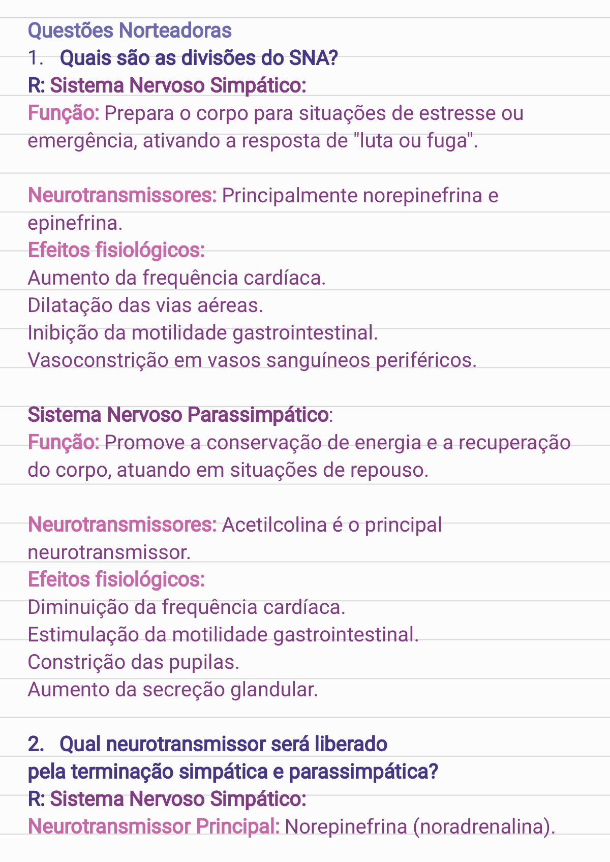 <p>Questões Norteadoras 1. Quais são as divisões do SNA? R: Sistema Nervoso Simpático: Função: Prepara o corpo para situações de estresse ou emergência, ativando a resposta de "luta ou fuga". Neurotransmissores: Principalmente norepinefrina e epinefrina. Efeitos fisiológicos: Aumento da frequência cardíaca. Dilatação das vias aéreas. Inibição da motilidade gastrointestinal. Vasoconstrição em vasos sanguíneos periféricos. Sistema Nervoso Parassimpático: Função: Promove a conservação de energia e a recuperação do corpo, atuando em situações de repouso. Neurotransmissores: Acetilcolina é principal neurotransmissor. Efeitos fisiológicos: Diminuição da frequência cardíaca. Estimulação da motilidade gastrointestinal. Constrição das pupilas. Aumento da secreção glandular. 2. Qual neurotransmissor será liberado pela terminação simpática e parassimpática? R: Sistema Nervoso Simpático: Neurotransmissor Principal: Norepinefrina (noradrenalina).</p><p>Função: A norepinefrina é liberada nas terminações nervosas pós-ganglionares e atua em receptores adrenérgicos, promovendo respostas de "luta ou fuga". Exceção: As fibras simpáticas que inervam as glândulas sudoríparas liberam acetilcolina. Receptor: Os receptores são colinérgicos (muscarínicos). Sistema Nervoso Parassimpático Neurotransmissor Principal: Acetilcolina. Função: A acetilcolina é liberada tanto nas terminações pré- ganglionares quanto nas pós-ganglionares, atuando em receptores colinérgicos (muscarínicos e nicotínicos). Simpático: Pós-ganglionar: Norepinefrina (exceto glândulas sudoríparas - acetilcolina). Parassimpático: Pré e Pós-ganglionar: Acetilcolina. 3. Quais são os tipos de receptores adrenérgicos e colinérgicos situados nos órgãos efetores? R: Receptores Adrenérgicos Os receptores adrenérgicos são ativados por catecolaminas, como norepinefrina e epinefrina. Eles são classificados em duas principais subclasses: alfa (a) e beta (B). Receptores Alfa (a): Localização: Vasos sanguíneos, músculos lisos (como uretra e próstata). Função: Causam vasoconstrição e aumento da pressão arterial. a2: Localização: Terminações nervosas pré-sinápticas,</p><p>pâncreas, sistema nervoso central. Função: Inibem a liberação de norepinefrina, atuando como um mecanismo de feedback negativo. Receptores Beta (B): Localização: Coração. Função: Aumentam a frequência cardíaca e a contratilidade miocárdica. Localização: Músculos lisos dos brônquios, vasos sanguíneos esqueléticos. Função: Causam broncodilatação e vasodilatação. 33: Localização: Tecido adiposo. Função: Estimulam a lipólise. Receptores Colinérgicos Os receptores colinérgicos são ativados pela acetilcolina e são divididos em dois tipos principais: muscarínicos e nicotínicos. Receptores Muscarínicos: M1: Localização: Sistema nervoso central e glândulas gástricas. Função: Estimulam a secreção gástrica e têm efeitos neuromoduladores no SNC. M2: Localização: Coração. Função: Reduzem a frequência cardíaca e a condução atrioventricular. M3: Localização: Músculos lisos (brônquios, bexiga), glândulas exócrinas.</p><p>Função: Causam contração do músculo liso e aumento da secreção glandular. M4 e M5: Localização: Sistema nervoso central. Função: Efeitos moduladores variados, ainda em investigação. Receptores Nicotínicos:Nn (neurais): Localização: Ganglios autonômicos e sistema nervoso central. Função: Mediadores da transmissão sináptica entre neurônios. Nm (musculares): Localização: Placas motoras dos músculos esqueléticos. Função: Induzem a contração muscular ao serem ativados pela acetilcolina. Funções do Sistema Nervoso Autônomo Homeostase Regulação Cardiovascular sistema nervoso autônomo mantém a Controla a frequência estabilidade e equilíbrio cardíaca, a pressão interno do organismo. sanguínea e fluxo de sangue nos órgãos. Função Atividade Endócrina Gastrointestinal Modula a atividade das Regula a motilidade, a glândulas endócrinas, como secreção e a absorção do a adrenal e a tireóide. trato gastrointestinal.</p><p>Resposta Response Repouso e digestão: Luta ou fuga: predomina a atividade predomina a atividade SISTEMA NERVOSO AUTÔNOMO Em menos de um segundo, o seu corpo passou de um es- tado tranquilo de repouso e digestão para um estado de pânico e agitação. Como isso foi possível? A resposta está na reação reflexa de luta ou fuga, integrada e coordenada pelo sistema nervoso central (SNC) e realizada pela porção eferente do sistema nervoso periférico (SNP). Os neurônios eferentes levam comandos rápidos do SNC para os músculos e glândulas do nosso corpo. Essa informação é levada pelos nervos, que são feixes de axônios. Alguns nervos, chamados de nervos mistos, também transportam informações sensoriais através das fibras aferentes o sistema nervoso autônomo também é denominado</p><p>sistema nervoso visceral, devido ao controle que exerce sobre os órgãos internos ou vísceras. sistema nervoso autônomo é subdividido em divisões simpática e (comumente chamadas de sistema nervoso simpático e sistema nervoso parassimpático). A melhor forma de distinguir as duas divisões é de acordo com O tipo de situação na qual elas estão mais ativas. Se você está descansando tranquilamente após uma refeição, parassimpático está no comando, assumindo controle de atividades rotineiras, como a digestão. Consequente-mente, os neurônios parassimpáticos são, às vezes, considerados como controladores das funções de "repouso e digestão". Em contrapartida, simpático está no comando duran-te situações estressantes, como aparecimento da cobra, que é uma ameaça em potencial. exemplo mais marcante da ativação simpática é a resposta generalizada de luta ou fuga, na qual encéfalo dispara uma descarga simpática macica e simultânea em todo corpo. Quando