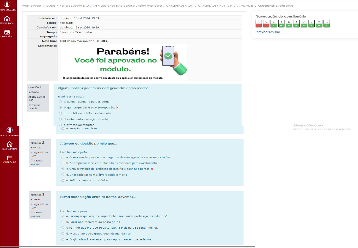 <p>Página inicial / Cursos / Pós-graduação EAD / MBA Liderança Estratégica e Gestão Financeira / / CARLEFEADBRA001-1334 / ATIVIDADES / Questionário Avaliativo RTAL DO ALUNO Iniciado em domingo, 15 set 2024, 19:33 Navegação do questionário Estado Finalizada 1 2 INICIAL 3 4 5 6 7 8 9 10 Concluída em domingo, 15 set 2024, 19:39 Tempo 5 minutos 25 segundos Terminar revisão CALENDÁRIO empregado Nota final 8,00 de um máximo de 10,00(80%) Comentários Parabéns! Você foi aprovado no módulo. o lançamento das notas ocorre em até 20 dias após o encerramento do módulo. Questão 1 Alguns conflitos podem ser categorizados como sendo: Incorreto Atingiu 0,00 de Escolha uma opção: a. ganhar-ganhar e perder-perder. P Marcar questão b. ganhar-perder e atração-repulsão. x C. repulsão-repulsão e evitamento. d. evitamento e atração-atração. e. atração ou repulsão. Ativar Windows e. atração ou repulsão. Acesse Configurações para ativar o Windows PORTAL DO ALUNO Questão 2 A árvore de decisão permite que... Incorreto PÁGINA INICIAL Atingiu de Escolha uma opção: a. Compreender possíveis vantagens e desvantagens de certas negociações P Marcar CALENDÁRIO questão b. As empresas mais corruptas são as melhores para investimento Uma estratégia de avaliação de possíveis ganhos e perdas x d. Criar cadeiras com a árvore caída e morta e. Reflorestamento amazônico Questão 3 Numa negociação entre as partes, devemos... Correto Atingiu 1,00 de 1.00 Escolha uma opção: Marcar questão a. Encorajar que o que é importante para a outra parte seja respeitado b. Focar nos interesses do nosso grupo Permitir que grupo opositor ganhe mais para se sentir melhor. d. Mostrar ao outro grupo que nós mandamos e. Exigir coisas irrelevantes, para depois parecer que cedemos</p><p>Questão 4 Sempre que houver um mediador, ele deve... PORTAL DO ALUNO Correto Atingiu 1.00 de 1,00 PÁGINA INICIAL P Marcar Escolha uma opção: questão a. ...receber da mesma forma a opinião de todos, sejam os mais eruditos ou os mais inexperientes b. a participação dos envolvidos sem causar medo ou alienação CALENDÁRIO veraz e polido em simultâneo d. ...ajudar todos a compreenderem que o foco da mediação está nas ideias e não nas pessoas e. Todas as anteriores Questão 5 De fato, conflitos fazem parte nossa Mas segundo Bush e Folger podemos mudar o cenário, com o Correto que chamam de Mediação Transformadora. Seus pressupostos são: Atingiu 1,00 de 1.00 Escolha uma opção: P Marcar Mediação Transformadora funciona sobre os pilares de "empoderamento" e "reconhecimento" questão b. Mediação Transformadora é Comunicação Não Violenta Com Comunicação Não Violenta é possível transformar o mundo d. Todas as anteriores e. Nenhuma das anteriores PORTAL DO ALUNO Questão 6 Segundo há dois estilos de negociação em cado um de nós. Quais? PÁGINA INICIAL Correto Atingiu 1,00 de Escolha uma opção: 1.00 a romântico e o erudito CALENDÁRIO P Marcar questão b. Nossas preferências cognitivas e administradoras Nossos estilos aprendidos e nossas preferências cognitivas d. Guerreiros e administradores por um lado e erudito e românticos por outro e. Nossas preferências e estilos aprendidos Questão 7 Para que o último passo da Comunicação Não-Violenta seja efetivo é necessário antes: Correto Atingiu 1,00 de Escolha uma opção: 1.00 a. Observação da realidade do identificações dos sentimentos conjuntos, e ação transformadora Marcar questão b. Observação da realidade, conhecimento de sentimentos e expressão de necessidades Percepção da realidade, partilha de sentimentos entre as partes e expressão de desejos d. Observação da realidade, conhecimento de sentimentos conjuntos e capacidade de expressão necessidades e. Nenhuma das anteriores ORTAL DO ALUNO Questão 8 que é a MANA? PÁGINA INICIAL Correto Atingiu 1,00 de Escolha uma opção: 1.00 CALENDÁRIO a. A irmã que todos queremos ter P Marcar questão b. A sala ideal para negociação</p><p>C. Uma estratégia de contingência se algo der errado d. A melhor alternativa negada de acordo e. A zona de acordo potencial Questão 9 Há situações que nos instigam a quebrar preceitos éticos. Quais podem ser ferramentas mentais que ajudam Correto a impedir isso? Atingiu 1,00 de 1,00 P Marcar questão Escolha uma opção: a. Pensar e reler código de conduta da organização b. Refletir sobre o que a pessoa que admiramos ou amamos faria ou entenderia dos nossos comportamentos Imaginar como seria a matéria publicada em alguma mídia após a negociação d. Fazer apenas aquilo de positivo que outras pessoas também fariam e. Todas as anteriores Questão 10 Precisamos: Correto Atingiu 1,00 de Escolha uma opção: 1,00 Ser duros com as pessoas e brandos com os problemas P Marcar questão b. Ser brandos com os problemas e as pessoas Ser brandos com as pessoas e duros com os problemas d. Ser brandos e duros com o problema e. Ser sempre brandos para mais pessoas Terminar revisão CLIQUE AQUI para participar do Seguir para... Ficha de avaliação do módulo Workshop de Práticas!</p>