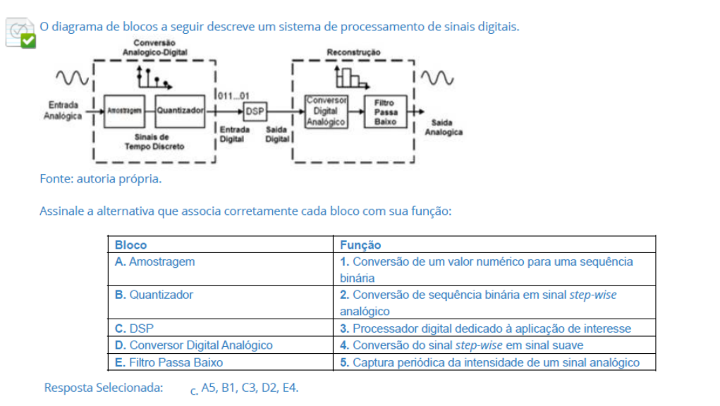 <p>o diagrama de blocos a seguir descreve um sistema de processamento de sinais digitais. Conversão Analogico-Digital Reconstrução 011...01 Conversor Entrada Filtro Quantizador DSP Digital Passa Analogica Analógico Baixo Saida Entrada Saida Analogica Sinais de Digital Digital Tempo Discreto Fonte: autoria própria. Assinale a alternativa que associa corretamente cada bloco com sua função: Bloco Função A. Amostragem 1. Conversão de um valor numérico para uma sequência binária B. Quantizador 2. Conversão de sequência binária em sinal step-wise analógico C. DSP 3. Processador digital dedicado à aplicação de interesse D. Conversor Digital Analógico 4. Conversão do sinal step-wise em sinal suave E. Filtro Passa Baixo 5. Captura periódica da intensidade de um sinal analógico Resposta Selecionada: C. A5, B1, C3, D2, E4.</p>