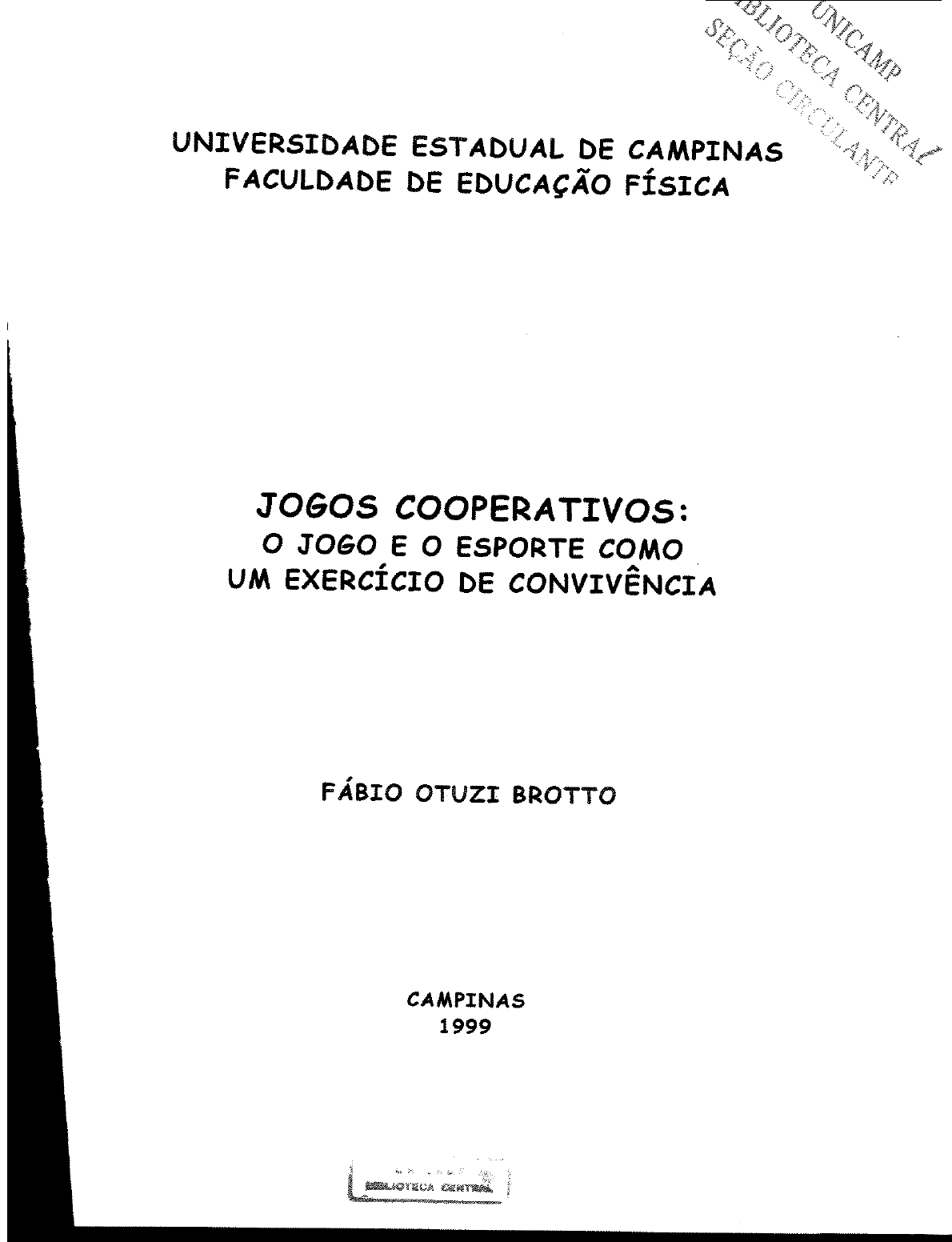 <p>UNIVERSIDADE ESTADUAL DE CAMPINAS - , FACULDADE DE EDUCAÇAO FISICA</p><p>JOGOS COOPERATIVOS:</p><p>O JOGO E O ESPORTE COMO</p><p>, A</p><p>UM EXERCICIO DE CONVIVENCIA</p><p>,</p><p>FABIO OTUZI BROTTO</p><p>CAMPINAS</p><p>1999</p><p>UNIVERSIDADE ESTADUAL DE CAMPINAS - ,</p><p>FACULDADE DE EDUCAÇAO FISICA</p><p>JOGOS COOPERATIVOS:</p><p>O JOGO E O ESPORTE COMO</p><p>, A</p><p>UM EXERCICIO DE CONVIVENCIA</p><p>/</p><p>Este exemplar corresponde à redação</p><p>final da Dissertação de Mestrado</p><p>apresentada por Fábio Otuzi Brotto e</p><p>aprovada pela comissão examinadora</p><p>composta pelos Professores Ídico Luiz</p><p>Pellegrinotti, Luiz Alberto Lorenzetto</p><p>e Roberto Rodrigues Paes, em 17 de</p><p>setembro de 1999.</p><p>I /)</p><p>Prof. · Dr. Roberto 4odrigues Paes</p><p>Orientador e presidente da,;Comissão Examinadora</p><p>Campinas, 17 de setembro de 1999</p><p>CM-001389é6-1</p><p>FICHA CATALOGRÁFICA ELABORADA PELA BIBLIOTECA-FEF</p><p>UNICAMP</p><p>B795j</p><p>Brotto, Fábio Otuzi</p><p>Jogos cooperativos: o jogo e o esporte como um exercício de</p><p>convivência I Fábio Otuzi Brotto. --Campinas, SP: [s.n.], 1999.</p><p>Orientador: Roberto Rodrigues Paes</p><p>Dissertação (mestrado) - Universidade Estadual de Campinas,</p><p>Faculdade de Educação Física.</p><p>1. Jogos em grupo. 2. Esporte-Estudo e ensino. 3. Interação</p><p>social. L Paes, Roberto Rodrigues. II. Universidade Estadual de</p><p>Campinas, Faculdade de Educação Física. II. Título.</p><p>EU OFEREÇO</p><p>Dedico este • Exercício de Convivência", a Eneide Otuzi Brotto,</p><p>minha mãe e principal orientadora no caminho da vida; e para Osmar</p><p>Brotto, meu pai. .. sempre presente.</p><p>Ofereço à Gisela minha e-terna parceira, que algumas vezes não me</p><p>acompanha, mas sempre me compõe.</p><p>E à Tiê e Ilê, e para os filhos dos filhos de seus (e de todos os</p><p>outros) filhos ... frutos e sementes do Jogo Essencial.</p><p>EU AGRADEÇO</p><p>Eu agradeço ao Prof. "Roberto" Rodrigues Paes, meu grande parceiro</p><p>e guia seguro que, quando me vi mergulhado no turbilhão de idéias</p><p>confusas e ideais difusos, transbordou os limites de sua</p><p>generosidade e sabedoria, me ajudando a enxergar com clareza o</p><p>rumo a seguir e a descobrir o compasso possível.</p><p>Também, sou muito grato ao Prof. Ídico Luiz Pellegrinotti, o "Deco",</p><p>que com seu jeito apaixonado de Ser, participou deste Jogo desde o</p><p>início, irradiando a con-fiança necessária para nutrir a Vida pulsante</p><p>no coração de cada um de todos nós.</p><p>Desde muito antes desta aventura pela ciência, venho sendo tocado</p><p>na consciência pela presença sensível e amorosa do "mestre" Luiz</p><p>Alberto Lorenzetto, a quem sou profundamente agradecido e</p><p>suavemente ligado.</p><p>Ao meu amigo Cesar Barbieri, agradeço pela leitura dedicada, crítica</p><p>e re-creativa e mais ainda, pela Trans-Piração compartilhada.</p><p>Agradeço aos servidores da FEF-UNICAMP pelo suporte e</p><p>disponibilidade em colaborar com a realização deste e de tantos</p><p>outros "projetos de estudo e de vida".</p><p>Agora, re-lembro o tempo em que voltava correndo da escola,</p><p>almoçava as pressas e saia voando ... para a aula de Educação Física.</p><p>Ah! Como eu adorava jogar basquete na quadra que construímos,</p><p>bater uma bolinha no campinho de terra cuidado pela garotada, fazer</p><p>exercício com halteres de lata de leite em pó, pendurar na barra só</p><p>pelo prazer de auto-sustentar-me... Pois é, eu era capaz de largar</p><p>tudo, tudo mesmo, só para ir àquele lugar mágico: a aula do "Seu Zé</p><p>Maria". Neste momento, ainda sou capaz de ouvir o jeitão dele</p><p>chamar a turma: "Tsitsitsi, turminha!"</p><p>Graças ao senhor, Prof. José Maria Abdalla, eu continuo por aqui.</p><p>Valeu, professor!</p><p>O MEU OLHAR é nítido como um girassol.</p><p>Tenho o costume de andar pelas estradas</p><p>Olhando para a direita e para a esquerda,</p><p>E de vez em quando olhando para trás ...</p><p>E o que vejo a cada momento</p><p>É aquilo que nunca antes eu tinha visto,</p><p>E eu sei dar por isso muito bem ...</p><p>Sei ter o pasmo essencial</p><p>Que tem uma criança se, ao nascer,</p><p>Reparasse que nascera deveras ...</p><p>Sinto-me nascido a cada momento</p><p>Para a eterna novidade do Mundo ...</p><p>Creio no mundo como um malmequer,</p><p>Porque o vejo. Mas não penso nele</p><p>Porque pensar é não compreender ...</p><p>O Mundo não se fez para pensarmos nele</p><p>(Pensar é estar doente dos olhos)</p><p>Mas para olharmos para ele</p><p>e estarmos de acordo ...</p><p>Eu não tenho filosofia: tenho sentidos ...</p><p>Se falo na Natureza</p><p>não é porque saiba o que ela é,</p><p>Mas porque a amo, e amo-a por isso,</p><p>Porque quem ama nunca sabe o que ama</p><p>Nem sabe por que ama, nem o que é amar ...</p><p>Amar é a eterna inocência,</p><p>E a única inocência não pensar ...</p><p>Fernando Pessoa'</p><p>1 Em 'O Guardador de Rebanhos- II", In: Ficções do Interlúdio/1, 1980, p. 35.</p><p>,</p><p>SUMARIO</p><p>Índice de Figuras ________________ _</p><p>INTRODUÇÃO. _______________________________ Ol</p><p>CAPÍTULO I.</p><p>O JOGO NUMA SOCIEDADE EM TRANSFORMAÇÃO. 12</p><p>1 Conceitos e abordagens. _____________ 13</p><p>2 O Jogo na Educação. ______________ 19</p><p>3 A postura do Educador. ______________ 23</p><p>4 Jogando numa Sociedade em Transformação. _____ 27</p><p>CAPÍTULO II.</p><p>A -A CONSCIENCIA DA COOPERAÇAO. 31</p><p>1 Cooperação e Competição. 32</p><p>2 Mitos e Ritos. 42</p><p>3 A Consciência da Cooperação. 51</p><p>,</p><p>4 A Etica Cooperativa. 57</p><p>CAPÍTULO III.</p><p>JOGOS COOPERATIVOS. ____________ 62</p><p>1 Origem e Evolução. ________________ 63</p><p>2 Os Primeiros Movimentos. 66</p><p>2.1 No Mundo Ocidental. 67</p><p>2.2 No Brasil. 70</p><p>3 Conceito e Características. 76</p><p>4 A Visão dos Jogos Coo