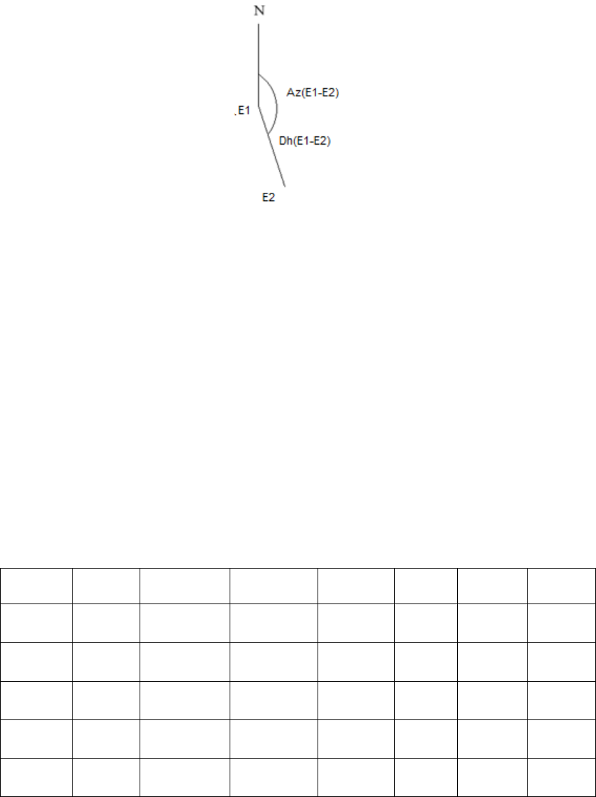 <p>Levantamento Topográfico Planimétrico</p><p>1. Método das Irradiações: Poligonal Aberta</p><p>No levantamento topográfico de um terreno, utilizando o método das irradiações foi</p><p>utilizado uma base georreferenciada com 2 estações de coordenadas conhecidas conforme</p><p>a Figura 1.</p><p>Figura 1. Base georreferenciada.</p><p>Dados:</p><p>𝐸1 = 596587,003 m 𝐸2 =596587,889 m</p><p>𝑁1 = 8275935,625 m 𝑁2 = 8275930,486 m</p><p>Az (𝐸1-𝐸2) = 170º13’05” Dh(𝐸1-𝐸2) = 5,21 m</p><p>A partir dos dados desta base foi levantado quatro pontos referente uma área</p><p>retangular com quatro vértices em que a partir da estação 𝐸2 foram irradiados os</p><p>vértices A, B, C e D, coletando ângulos horizontais, verticais, fi (fio inferior), fs (fio</p><p>superior) e fm (fio médio) com o teodolito. Os dados são apresentados na tabela 1.</p><p>Tabela 1 – Caderneta de Campo</p><p>Estações PV Ah AV FI FM FS Dh(m)</p><p>𝐸2 𝐸1 Oº00’00” - - - - -</p><p>𝐸2 A 351°05'14" 92°22'29" 0,900 0,939 0,978 7,79</p><p>𝐸2 B 287°52'25" 95°16'00" 0,900 0,929 0,957 5,65</p><p>𝐸2 C 131°19'28" 92°01'33" 0,700 0,793 0,886 18,58</p><p>𝐸2 D 109°25'08" 91°52'20" 0,800 0,895 0,990 18,98</p><p>PV=Pontos visados, Ah = Ângulo Horizontais, FS = Fio Superior, M = Fio médio e</p><p>Dh = Distâncias Horizontais.</p><p>As distâncias horizontais da estação do equipamento até os pontos irradiados são</p><p>calculadas por meio da fórmula:</p><p>1.1. Cálculo das Distâncias Horizontais</p><p>- Dh = (FS – FI) X 100 X sen²(Av)</p><p>- Dh (𝐸2-A) = (0,978 – 0,900) x 100 x sen²(92°22'29")</p><p>Dh (𝐸2-A) = 7,79 m</p><p>- Dh (𝐸2-B)= (0,957– 0,900) x 100 x sen²(95°16'00")</p><p>Dh (𝐸2-B) = 5,65 m</p><p>- Dh (𝐸2-C)= (0,886– 0,700) x 100 x sen²(92°01'33")</p><p>Dh (𝐸2-C) = 18,58 m</p><p>- Dh (𝐸2-D) = (0,990 – 0,800) X 100 X sen²(91º57’53”)</p><p>Dh (𝐸2-D) = 18,98 m</p><p>1.2. Cálculo dos Azimutes das Direções</p><p>Az(𝐸2-A) = Az (𝐸1-𝐸2) + Ah(𝐸2-A) = 170º13’05” + 351°05'14" = 341º18”19”</p><p>Az(𝐸2-B) = Az (𝐸1-𝐸2) + Ah(𝐸2-B) = 170º13’05” + 287°52'25" = 278º05”30”</p><p>Az(𝐸2-C) = Az (𝐸1-𝐸2) + Ah(𝐸2-C) = 170º13’05” + 131°19'28" = 121º32”33”</p><p>Az(𝐸2-D) = Az (𝐸1-𝐸2) + Ah(𝐸2-D) = 170º13’05” + 109°25'08" = 99º38”13”</p><p>1.3. Cálculo dos Coordenadas dos pontos Irradiados</p><p>𝐸𝐴 = 𝐸2 + 𝐷𝐻(𝐸2 − 𝐴)sen(𝐴𝑍(𝐸2-A))</p><p>𝐸𝐴= 596587,889 + 7,79 sen(341º18”19”) = 596585,392 m</p><p>𝑁𝐴 = 𝑁2 + 𝐷𝐻(𝐸2 − 𝐴)cos(𝐴𝑍(𝐸2-A))</p><p>𝑁𝐴 = 8275930,486 + 7,79cos( 341º18”19”) = 8275937,865 m</p><p>𝐸𝐵=𝐸2+𝐷𝐻(𝐸2 − 𝐵)sen(𝐴𝑍(𝐸2-B))</p><p>𝐸𝐵=596587,889 + 5,65sen(278º05”30”)= 596582,295 m</p><p>𝑁𝐵=𝑁2+𝐷𝐻(𝐸2 − 𝐵)cos(𝐴𝑍(𝐸2-B))</p><p>𝑁𝐵=8275930,486 + 5,65cos(278º05”30”)= 8275931,281 m</p><p>𝐸𝐶 = 𝐸2 + 𝐷𝐻(𝐸2 − 𝐶)sen(𝐴𝑍(𝐸2-C))</p><p>𝐸𝐶= 596587,889 + 18,58sen(121º32”33”) = 596603,724 m</p><p>𝑁𝐶=𝑁2 + 𝐷𝐻(𝐸2 − 𝐶)cos(𝐴𝑍(𝐸2-C) )</p><p>𝑁𝐶= 8275930,486 + 18,58cos(121º32”33”) = 8275920,766 m</p><p>𝐸𝐷 = 𝐸2 + 𝐷𝐻(𝐸2 − 𝐷)sen(𝐴𝑍(𝐸2-D))</p><p>𝐸𝐷 = 596587,889 + 18,98sen( 99º38”13”) = 596606,601 m</p><p>𝑁𝐷=𝑁2+𝐷𝐻(𝐸2 − 𝐴)cos(𝐴𝑍(𝐸2-D)</p><p>𝑁𝐷=8275930,486 + 18,98cos( 99º38”13”) = 8275927,309 m</p><p>Na Tabela 2 e na Figura 20 constam as coordenadas planimétricas dos pontos A, B, C</p><p>e D e a planta, respectivamente.</p><p>Tabela 2 – Coordenadas do Levantamento Topográfico Planimétrico</p><p>Figura 2. Base georreferenciada e pontos irradiados</p><p>2. Método das Irradiações por Caminhamento: Poligonal fechada</p><p>Neste caso será implantada, além das coordenadas da base 𝐸1 e 𝐸2 um outro ponto que</p><p>definirá um polígono de três lados formado pelos pontos 𝐸1, 𝐸2 e 𝐸3, resultando numa</p><p>poligonal fechada conforme a Figura 2.</p><p>Pontos Coord. Este (m) Coord. Norte (m)</p><p>A 596585,392 8275937,865</p><p>B 596582,295 8275931,281</p><p>C 596603,724 8275920,766</p><p>D 596606,601 8275927,309</p><p>Figura 3. Poligonal fechada</p><p>2.1. Cálculo da Poligonal</p><p>As distâncias horizontais de 𝐸2 𝑝𝑎𝑟𝑎 𝐸3 e de 𝐸3 para 𝐸1 são:</p><p>- Dh (𝐸1-𝐸2) = 5,70 m</p><p>- Dh (𝐸2-𝐸3) = 5,70 m</p><p>- Dh (𝐸3- 𝐸1) = 8,40 m</p><p>Os ângulos horizontais de 𝐸2 𝑝𝑎𝑟𝑎 𝐸3, de 𝐸3 para 𝐸1 e de 𝐸1 para 𝐸2 são:</p><p>Ah(𝐸2-𝐸3) = 100º25’15”</p><p>Ah (𝐸3- 𝐸1) = 37º41’10”</p><p>Ah (𝐸1- 𝐸2) = 41º53’01”</p><p>2.1.1. Cálculo do erro de fechamento angular (𝒆𝒂)</p><p>Soma-se todos os ângulos internos medidos no campo do polígono:</p><p>∑𝐴𝑖 = 100º25’15” + 37º41’10” + 41º53’01” = 179º59’26”</p><p>Este valor deve ser comparado com o valor calculado para o polígono de três lados</p><p>(triângulo):</p><p>∑𝐴𝑖 = (n-2)x180º, em que n é o número de lados.</p><p>∑𝐴𝑖𝑝𝑜𝑙 = (3-2)x180º = 180º</p><p>Na verificação do erro de fechamento angular, tem-se:</p><p>𝑒𝑎=∑𝐴𝑖-∑𝐴𝑖𝑝𝑜𝑙 = 179º59’26” – 180º = - 0º00’34”</p><p>2.1.2. Cálculo de compensação do de fechamento angular (𝒄𝒂)</p><p>𝑐𝑎 =</p><p>𝑒𝑎</p><p>3</p><p>=</p><p>0º00′34"</p><p>3</p><p>= 0º00’11,33”</p><p>A compensação será para mais, pois o erro foi para menos, ou seja, somar</p><p>0º00’11,33” a cada valor angular.</p><p>Ah(𝐸2-𝐸3)comp = 100º25’15” + 0º00’11,33” =100º25’26,3”</p><p>Ah (𝐸3- 𝐸1)comp = 37º41’10” + 0º00’11,33” =37º41’21,33”</p><p>Ah (𝐸1- 𝐸2) comp= 41º53’01” + 0º00’11,33” =41º53’