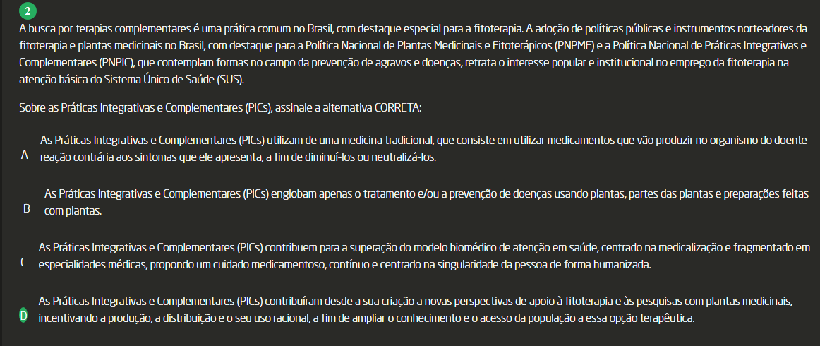 <p>2 A busca por terapias complementares é uma prática comum no Brasil, com destaque especial para a fitoterapia. A adoção de políticas públicas e instrumentos norteadores da fitoterapia e plantas medicinais no Brasil, com destaque para a Política Nacional de Plantas Medicinais e Fitoterápicos (PNPMF) e a Política Nacional de Práticas Integrativas e Complementares (PNPIC), que contemplam formas no campo da prevenção de agravos e doenças, retrata interesse popular e institucional no emprego da fitoterapia na atenção básica do Sistema Único de Saúde (SUS). Sobre as Práticas Integrativas e Complementares assinale a alternativa CORRETA: As Práticas Integrativas e Complementares (PICs) utilizam de uma medicina tradicional, que consiste em utilizar medicamentos que vão produzir no organismo do doente A reação contrária aos sintomas que ele apresenta, a fim de diminuí-los ou neutralizá-los. As Práticas Integrativas e Complementares (PICs) englobam apenas tratamento e/ou a prevenção de doenças usando plantas, partes das plantas e preparações feitas B com plantas. As Práticas Integrativas e Complementares (PICs) contribuem para a superação do modelo biomédico de atenção em centrado na medicalização e fragmentado em C especialidades médicas, propondo um cuidado medicamentoso, contínuo e centrado na singularidade da pessoa de forma humanizada. As Práticas Integrativas e Complementares contribuíram desde a sua criação a novas perspectivas de apoio à fitoterapia e às pesquisas com plantas medicinais, incentivando a produção, a distribuição e seu uso racional, a fim de ampliar conhecimento e acesso da população a essa opção terapêutica.</p>
