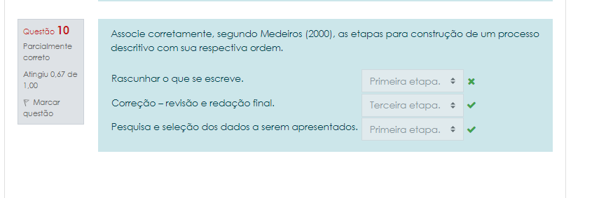 <p>Questão 10 Associe corretamente, segundo Medeiros (2000). as etapas para construção de um processo Parcialmente descritivo com sua respectiva ordem. correto Atingiu 0,67 de Rascunhar que se escreve. Primeira etapa. x 1.00 P Marcar Correção - revisão e redação final. Terceira etapa. questão Pesquisa e seleção dos dados a serem apresentados. Primeira etapa.</p>