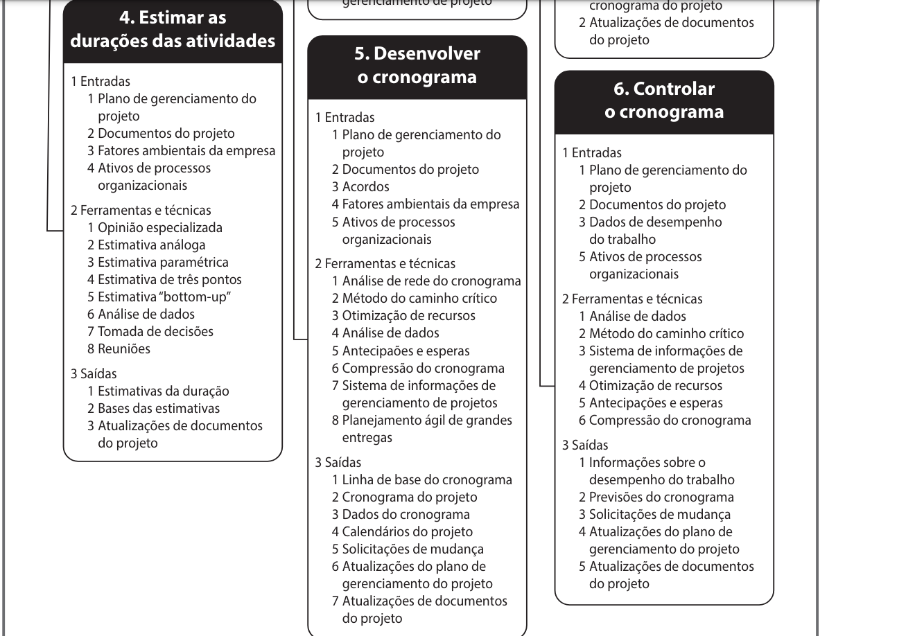 <p>cronograma do projeto 4. Estimar as 2 Atualizações de documentos durações das atividades do projeto 5. Desenvolver 1 Entradas cronograma 6. Controlar 1 Plano de gerenciamento do projeto 1 Entradas cronograma 2 Documentos do projeto 1 Plano de gerenciamento do 3 Fatores ambientais da empresa projeto 1 Entradas 4 Ativos de processos 2 Documentos do projeto 1 Plano de gerenciamento do organizacionais 3 Acordos projeto 2 Ferramentas e técnicas 4 Fatores ambientais da empresa 2 Documentos do projeto 1 Opinião especializada 5 Ativos de processos 3 Dados de desempenho 2 Estimativa análoga organizacionais do trabalho 3 Estimativa paramétrica 2 Ferramentas e técnicas 5 Ativos de processos 4 Estimativa de três pontos 1 Análise de rede do cronograma organizacionais 5 Estimativa "bottom-up" 2 Método do caminho crítico 2 Ferramentas e técnicas 6 Análise de dados 3 Otimização de recursos 1 Análise de dados 7 Tomada de decisões 4 Análise de dados 2 Método do caminho crítico 8 Reuniões 5 Antecipaões e esperas 3 Sistema de informações de 3 Saídas 6 Compressão do cronograma gerenciamento de projetos 1 Estimativas da duração 7 Sistema de informações de 4 Otimização de recursos 2 Bases das estimativas gerenciamento de projetos 5 Antecipações e esperas 3 Atualizações de documentos 8 Planejamento ágil de grandes 6 Compressão do cronograma do projeto entregas 3 Saídas 3 Saídas 1 Informações sobre o 1 Linha de base do cronograma desempenho do trabalho 2 Cronograma do projeto 2 Previsões do cronograma 3 Dados do cronograma 3 Solicitações de mudança 4 Calendários do projeto 4 Atualizações do plano de 5 Solicitações de mudança gerenciamento do projeto 6 Atualizações do plano de 5 Atualizações de documentos gerenciamento do projeto do projeto 7 Atualizações de documentos do projeto</p>