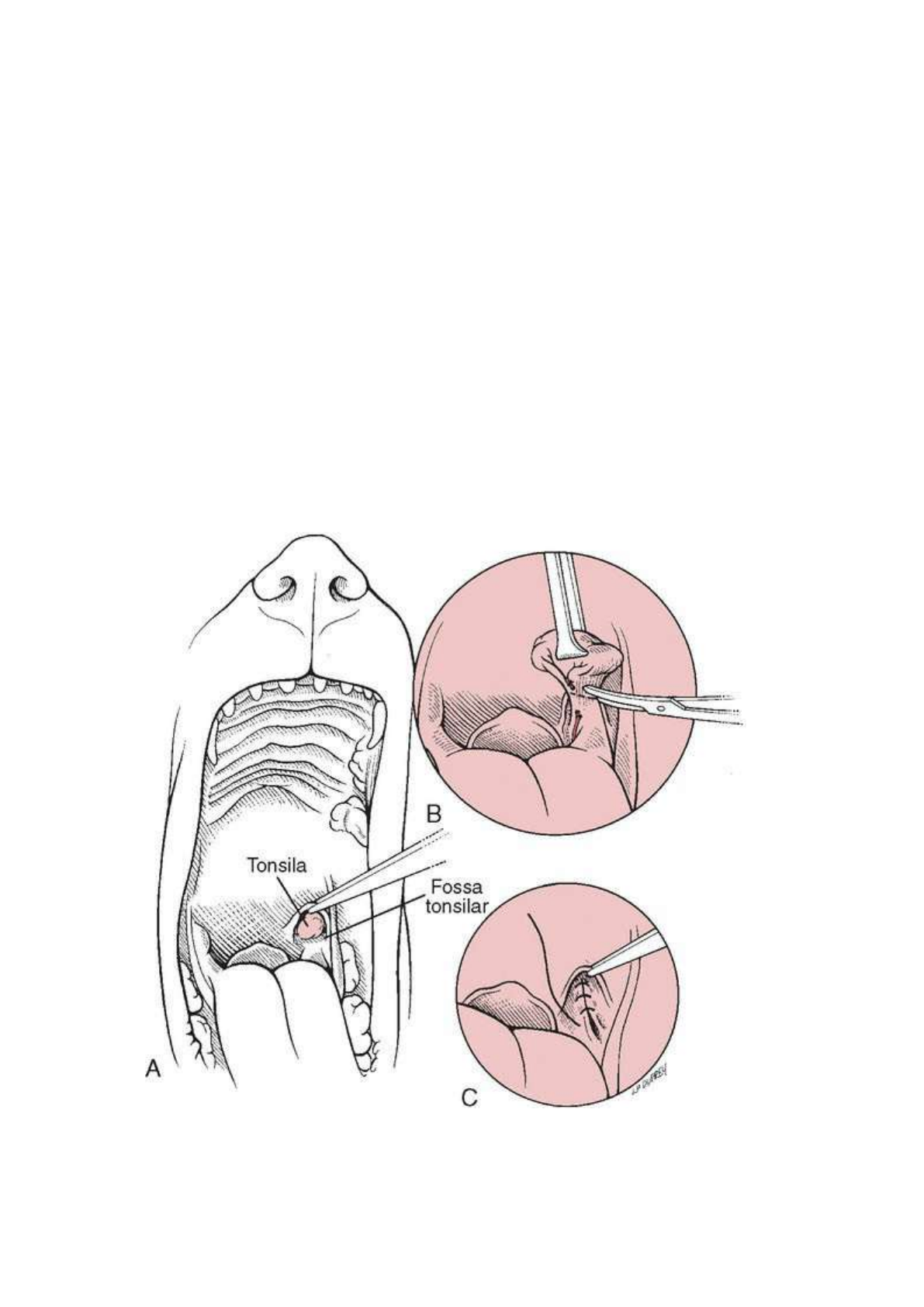 <p>TONSILECTOMIA</p><p>1. Administrar dexametasona (0,1 a 0,2 mg/kg IV) no momento da indução para</p><p>minimizar o inchaço e edema pós-operatório.</p><p>2. Posicionar o animal em decúbito ventral com a maxila suspensa por suporte IV para</p><p>soro ou dispositivo semelhante.</p><p>3. Abrir a boca ao máximo e mantê-la aberta com gaze ou esparadrapo.</p><p>4. Localizar a tonsila na fossa tonsilar ou cripta na parede dorsolateral da orofaringe</p><p>caudal ao arco glossopalatino</p><p>5. Rebater caudodorsalmente a margem da cripta tonsilar para expor a tonsila.</p><p>6. Segurar a tonsila em sua base com uma pinça de Allis ou hemostática e recolhê-la</p><p>da cripta.</p><p>7. Seccionar a mucosa hilar na base da tonsila com tesoura Metzenbaum ou um laço</p><p>tonsilectomia.</p><p>8. Ligar a artéria tonsilar que entra na parte caudal da tonsila. Alguns cirurgiões</p><p>excisam a tonsila utilizando eletrocirurgia ou cirurgia a laser.</p><p>9. Apor as bordas da cripta tonsilar com um padrão de sutura simples contínua de 3-0</p><p>ou 4-0 com fio monofilamento absorvível para minimizar a hemorragia.</p><p>A, As tonsilas palatinas estão localizados na faringe dorsolateral. B, Durante tonsilectomia</p><p>everter tonsila da cripta, ligar os vasos tonsilares e começar a transecção ao longo da base.</p><p>C, Fechar a cripta com um padrão contínuo simples para ajudar o controle de hemorragia.</p><p>GLOSSECTOMIA</p><p>1. Ressectar a porção doente da língua e um mínimo de 2 cm de tecido normal após a</p><p>colocação de uma pinça atraumática transversalmente na base da língua. Quando</p><p>glossectomia total é realizada não se utiliza braçadeira.</p><p>2. Cunhar a incisão para excisar mais músculo da língua do que mucosa dorsal ou</p><p>ventral. Controlar a hemorragia por ligadura, pressão ou eletrocirurgia.</p><p>3. Usar completamente suturas de colcheiro horizontais conforme necessário para</p><p>controlar a hemorragia.</p><p>4. Apor as bordas epiteliais com um padrão de sutura contínua simples, usando sutura</p><p>de monofilamento absorvíveis 3-0 ou 4-0.</p><p>5. Colocar um tubo de alimentação quando grandes glossectomias são realizadas</p><p>FECHAMENTO DE DEFEITOS DO PALATO DURO</p><p>Fissura Palatina</p><p>1. Incisar as margens do defeito e fazer incisões liberadoras bilaterais ao longo das</p><p>margens da arcada dentária</p><p>2. Elevar a camada mucoperióstica em ambos os lados do defeito com um elevador</p><p>periosteal Evitar danificar as artérias palatinas maiores.</p><p>3. Controlar hemorragia com pressão e sucção.</p><p>4. Fazer a aposição das margens da mucosa nasal ou do periósteo à margem do</p><p>defeito com sutura sepultada descontínua (nós dentro da cavidade nasal), se</p><p>possível.</p><p>5. Deslizar as abas mucoperiósticas elevadas em todo o defeito e apor com suturas</p><p>interrompidas simples</p><p>6. Deixar o palato duro desnudado perto das arcadas dentárias para cicatrizar por</p><p>segunda intenção.</p><p>Técnica alternativa para reparo de defeitos do palato duro é a técnica do “sanduíche”</p><p>sobreposto</p><p>1. Incisar uma margem do defeito, separando a mucosa oral e nasal</p><p>2. Elevar o mucoperiósteo nesta margem aproximadamente 5 mm.</p><p>3. No lado oposto do defeito criar uma aba rotativa mucoperiostal suficientemente</p><p>grande para cobrir o defeito com a sua base charneirada na margem do defeito</p><p>palatino</p><p>4. Iniciar a incisão próxima e paralela à arcada dentária, criando um retalho de 2 a 4</p><p>mm maior que o defeito.</p><p>5. Fazer incisões perpendiculares nas extremidades rostral e caudal da incisão que se</p><p>estende para a fissura.</p><p>6. Elevar este retalho mucoperiostal, tomando cuidado para não perturbar a margem</p><p>do defeito</p><p>7. Dissecar cuidadosamente ao redor da artéria palatina para liberá-la do tecido</p><p>fibroso. Girar a aba através do defeito</p><p>8. Colocar a ponta da aba mucoperiostal sob a aba no lado oposto.</p><p>9. Substituir e, em seguida, amarrar uma série de suturas de colchão horizontais para</p><p>fixar as abas na posição</p><p>FECHAMENTO DE DEFEITOS DO PALATO MOLE</p><p>1. Incisar as margens do defeito para separar as mucosas oral e nasal.</p><p>2. Continuar as incisões feitas nas margens de fissuras do palato duro caudal no palato</p><p>mole Isolar a mucosa nasal, os músculos palatinos e a mucosa oral.</p><p>3. Realizar a aposição das margens palatinas em três camadas, começando</p><p>caudalmente e trabalhando rostralmente para um ponto adjacente ao ponto caudal</p><p>ou do meio da tonsila. Realizar inicialmente a aposição da mucosa nasal usando</p><p>uma série de pontos simples descontínuos com os nós orientados nasalmente ou</p><p>usar um padrão simples contínuo. Fazer então a aposição do músculo palatino e do</p><p>tecido conjuntivo com uma sutura simples contínua.</p><p>4. Apor a mucosa oral com um padrão de sutura simples contínuo ou interrompido.</p><p>5. Fazer incisões liberadoras de tensão na mucosa oral da face lingual do último molar</p><p>próximo à ponta do palato mole</p><p>FECHAMENTO DE FISSURAS PRIMÁRIAS</p><p>1. Criar uma aba da mucosa para separar a cavidade nasal da cavidade oral</p><p>2. Se a fissura se estende para o pré-maxila, avaliar a mucosa gengival dos incisivos</p><p>decíduos e trazê-los se necessário.</p><p>3. Suturar o retalho de mucosa bucal ou gengival à mucosa nasal.</p><p>4. Usar a Z-plastia modificada à mão livre para a reconstrução do defeito lábio</p><p>5. Fechar o defeito do lábio para que a distância da narina ventral à margem livre</p><p>ventral do lábio seja a mesma, em ambos os lados.</p><p>6. Fazer múltiplos pequenos retalhos, se necessário, para um fechamento cosmético.</p><p>7. Colocar uma camada de suturas na camada fibromuscular (músculo orbicular do</p><p>olho e tecido conjuntivo) antes de fechar a pele.</p><p>TUMORES ORAIS</p><p>Os 