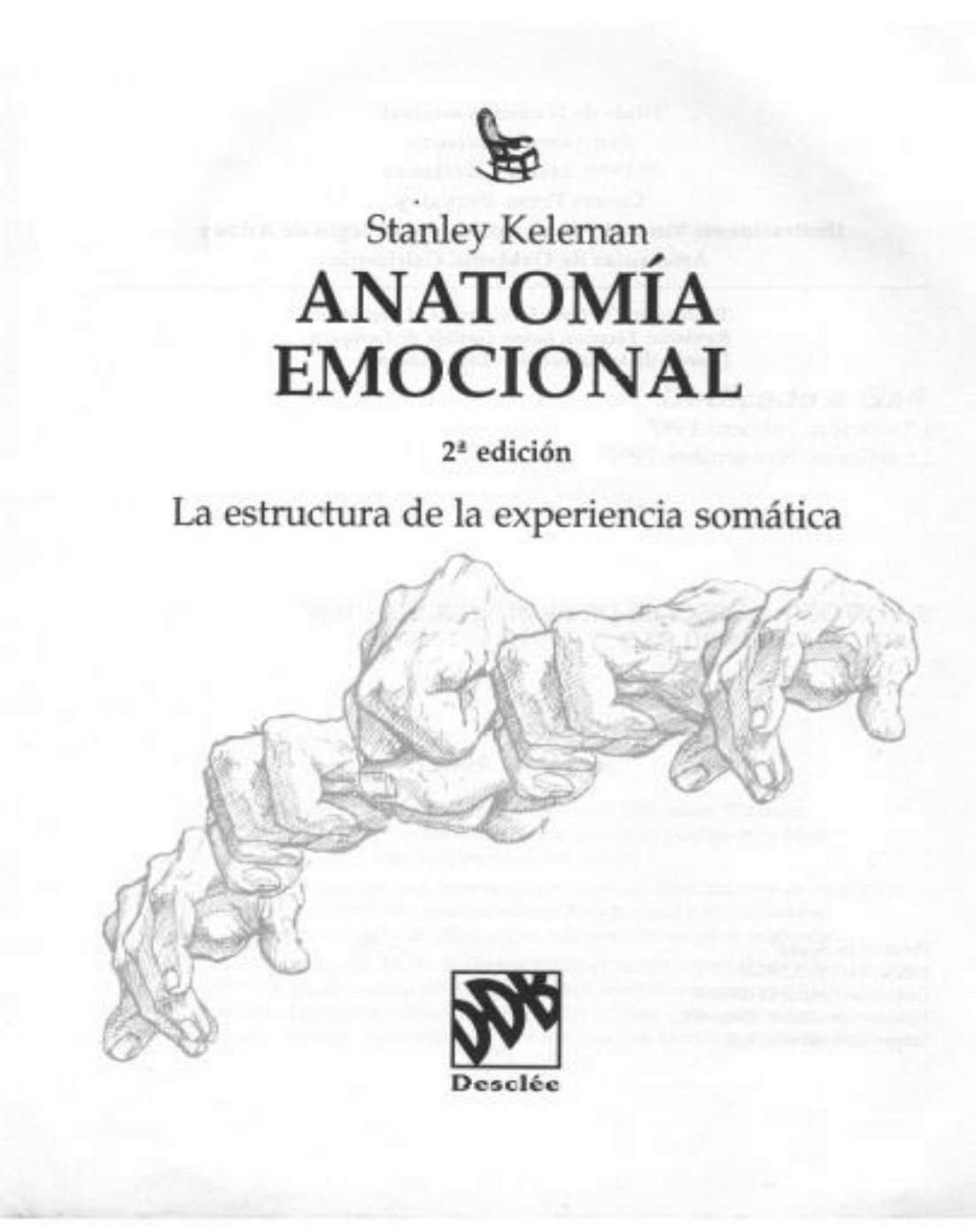 <p>Stanley Keleman ANATOMÍA EMOCIONAL edición La estructura de la experiencia somática Desclée</p><p>Título de la original: Emotional Anatomy 1985, Stanley Keleman Center Press, Berkeley Ilustraciones: Vincent Pérez, Artista del Colegio de Artes y de Oakland, California Traducido: Dr. Juan M. González Llagostera Revisión Técnica: Jaime Guillén de Diseño de la Colección: Alonso edición: Febrero 1997 edición: Noviembre 1997 EDITORIAL DE BROUWER, S.A., 1997 Henao, 6 48009 BILBAO Printed in Spain ISBN: 84-330-1207-X Depósito Legal: BI-248-97 Fotocomposición: Zeta, S.L. Grafo, S.A.</p><p>Índice Prólogo a la edición por Stanley Keleman 13 Presentación, por Jaime Guillén 15 Introducción 17 1. Creación 21 De células a tubos 24 La bomba pulsante 32 De la motilidad al movimiento 40 2. El Mapa Corporal 51 Músculos 59 Huesos 65 El árbol vascular 68 La 69 El cerebro y el sistema nervioso 78 La capa invisible: fluidez, sensaciones, hormonas y emoción 85 La como propia identidad 87 3. Agresiones a la Forma 93 Verticalidad y 93 Agresiones, alarma, estrés 98 e la de la experiencia del estrés 110 Estrés y emocional 124 4. Patrones de Alteración Somática 139 Estructuras extralimitadas e infralimitadas 139 La estructura rigida 140 La estructura densa 153 MAIOR</p><p>La estructura hinchada 162 La estructura colapsada 172 Comparaciones estructurales 181 5. Realidad somática 185 6. Interacciones 195 Acoplamiento 197 Emocional 197 Glosario de Términos 201 Apéndice: Traducciones y directorio 203 MAIOR</p><p>Presentación, por Jaime Guillén Sin duda estamos ante una obra maestra, a satisfacer esa imperiosa y actual necesi- llena de fuerza y originalidad, que hunde dad de muchos hacia el propio conoci- sus raíces en los campos de la biopsicolo- miento y la gestión integral de su salud gía, la psicología formativa y el más clási- física, emocional, psíquica y espiritual. CO humanismo aristotélico. Ello sin olvidar Así, podemos saber, por ejemplo, cómo la otros antecedentes en las que el respiración es la expresión de nuestra pul- autor bebió durante años-, como son las sación básica, que refleja el estado mental; teorías psicosomáticas de Wilhelm Reich, la excitabilidad, el elemento principal del la persona y la obra de Graf Karlfried Von sistema nervioso; los nervios, células alar- Dürckheim o la Bioenergética de Ale- gadas que se conectan en puntos distantes xander Lowen y John Pierrakos. Como y transportan fluídos protoplasmáticos. otros grandes maestros de la psicología Aprendemos que el sistema nervioso es actual -y más específicamente de la Psico- una bomba que pulsa, se encoge y se dila- Somatoterapia-, Stanley Keleman ha sabi- ta, generando y transportando fluídos do elevarse sobre los hombros de sus ante- energetizados e impulsos hormonales y cesores, creando su propio trabajo. neurales; que el cerebro y los músculos Desde el punto de vista médico, la gran tienen una estructura similar; que el orga- originalidad del enfoque de Keleman es la nismo en su conjunto tiene un funciona- de introducirnos en una lección de miento semejante al de un acordeón que Anatomía viva. No estamos ante un cadá- las hormonas son anatomía líquida, efu- ver en una Facultad de Medicina o un siones que transforman a las niñas en libro especializado plagado de tecnicis- mujeres y a éstas en madres lactantes. mos sino ante una sinfonía de formas, Keleman, que en su vida privada cultiva procesos y estructuras compuestas por las la escultura y la es pionero en el bolsas y las cavidades, los espacios, tubos, abordaje de una realidad somática que bombas, conductos y pasadizos de nues- une al rigor científico el descubrimiento tra maravillosa anatomía. Keleman biológico, la sabiduría y la contemplación entiende, intuye, visualiza y presenta existencial. tanto que proceso somáti- anatomía de una manera inédi- CO -dice el la Anatomía es destino. ta y genial, contribuyendo decisivamente Es un proceso dinámico vital, un misterio, MAIOR 15</p><p>una incitación, la forma de experiencia brazos y el cuello o subiendo el pecho y que da origen a nuestros sentimientos, Introducción conteniendo la respiración. pensamientos y En definitiva, la motilidad interna contri- El cuerpo es materia y energía en movi- buye a determinar la forma y la organiza- miento continuo, generando pulsacio- ción interior y exterior del sujeto, propor- nes, vibraciones y corrientes de flujo cionándole un sentimiento básico de iden- energético que toman la forma de sensa- tidad. El patrón característico de expan- ciones, emociones y sentimientos. La organiza la percepción pulsación es un proceso rítmico de con- básica y el entendimiento: vacío-lleno, tracción y expansión que caracteriza fun- damentalmente a los seres vivos. lento-rápido, expandido-retraído. Hay un Las emociones están hechas de sensacio- patrón diferente cuando estamos bajo nes con la intensidad suficiente para estrés y otro diferente en situaciones de normalidad ¿Qué sucede en nuestro La vida construye las formas. Estas for- organizarse en patrones de conducta, que siguen así mismo el continuum de con- interior cuando estamos emocional y psi- mas son parte de un proceso organizati- tracción y expansión. El disgusto se con- cológicamente estresados? ¿Cómo nos VO que incluye las emociones, los pensa- vierte en irritación, después en ira y final- organizamos para protegernos? ¿Qué les mientos y las experiencias dentro de una estructura. Esta estructura, a su vez, mente en furia. La emoción es una res- sucede a nuestros espacios y conductos ordena los acontecimientos de la existen- puesta automática y una condición física anatómicos? ¿Cómo nos organizamos con unas pautas orgánicas precisas. para protegernos? ¿Cómo afectan estos cia. Las formas revelan el proceso que Keleman establece una clasificación estados a nuestra conexión con los demás? transcurre desde la fase protoplasmát