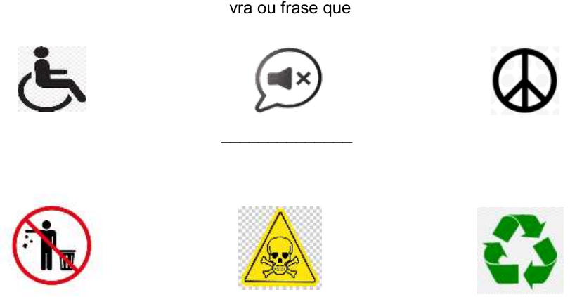 <p>1. Escreva, no caderno, uma palavra ou frase que explique o significado de cada</p><p>um dos símbolos abaixo.</p><p>_________________ ____________________ ________________</p><p>_________________ ____________________ ________________</p><p>_________________ ___________________ _________________</p><p>_________________ ___________________ _________________</p><p>2. Em grupo, criem um símbolo para representar uma solução para um problema</p><p>da escola, do bairro ou da cidade onde vocês moram. Para isso:</p><p>a) busquem exemplos de símbolos na internet, em livros, em jogos, etc.;</p><p>_______________________________________________________________</p><p>_______________________________________________________________</p><p>b) discutam os exemplos que podem servir de inspiração para vocês;</p><p>_______________________________________________________________</p><p>_______________________________________________________________</p><p>c) conversem sobre como transmitir de modo claro a ideia que pretendem;</p><p>_______________________________________________________________</p><p>_______________________________________________________________</p><p>d) ao final, apresentem o símbolo aos colegas e verifiquem se todos</p><p>compreendem o significado do símbolo criado. Expliquem como vocês</p><p>elaboraram o símbolo.</p><p>_______________________________________________________________</p><p>_______________________________________________________________</p><p>_______________________________________________________________</p><p>a) c)</p><p>b) d) f)</p><p>e)</p>