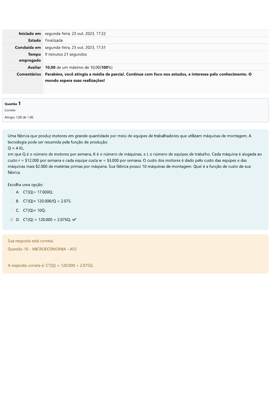 <p>Iniciado em segunda-feira, 23 out. 2023, 17:22 Estado Finalizada Concluída em segunda- feira, 23 out. 2023, 17:31 Tempo 9 minutos 21 segundos empregado Avaliar 10,00 de um máximo de 10,00(100%) Comentários Parabéns, você atingiu a média da parcial. Continue com foco nos estudos, e interesse pelo conhecimento. o mundo espera suas realizações! Questão 1 Correto Atingiu 1,00 de 1,00 Uma fábrica que produz motores em grande quantidade por meio de equipes de trabalhadores que utilizam máquinas de montagem. A tecnologia pode ser resumida pela função de produção: Q = 4 KL, em que Q é o número de motores por semana, K é o número de máquinas, e L o número de equipes de trabalho. Cada máquina é alugada ao custo r = $12.000 por semana e cada equipe custa W = $3.000 por semana. O custo dos motores é dado pelo custo das equipes e das máquinas mais $2.000 de matérias primas por máquina. Sua fábrica possui 10 máquinas de montagem. Qual é a função de custo de sua fábrica Escolha uma opção: A. CT(Q)= 17.000Q. B. CT(Q)= 120.000/Q + 2.075. C. CT(Q)= 10Q. D. CT(Q) = 120.000 + Sua resposta está correta. Questão 16 MICROECONOMIA - AP2 A resposta correta é: CT(Q) = 120.000 + 2.075Q.</p><p>Questão 2 Correto Atingiu 1,00 de 1,00 produto marginal do trabalho na produção de chips para computadores é de 50 chips por hora. A taxa marginal de substituição técnica de horas de trabalho por horas de maquinário é de 1/4. Qual é o produto marginal do capital Escolha uma opção: A. 50 chips de computador por hora. B. 40 chips de computador por minuto. C. 200 chips de computador por hora. D. 4 chips de computador por segundo Sua resposta está correta. Questão 7 - MICROECONOMIA - AP2 A resposta correta é: 200 chips de computador por hora. Questão 3 Correto Atingiu 1,00 de 1,00 Quando o custo variável médio está declinando: Escolha uma opção: A. O custo marginal deve estar abaixo do custo médio. B. O custo marginal deve estar crescendo. C. O custo marginal deve estar acima do custo variável médio. D. O custo marginal deve estar declinando. Sua resposta está correta. Questão 18 - MICROECONOMIA - AP2 A resposta correta é: O custo marginal deve estar abaixo do custo médio.</p><p>Questão 4 Correto Atingiu 1,00 de 1,00 Sobre a isoquanta é incorreto afirmar: Escolha uma opção: A. A isoquanta apresenta todas as combinações dos dois insumos que podem produzir o mesmo nível de produção. B. As isoquantas Cobb-Douglas têm a mesma forma bem-comportada das curvas de indiferença Cobb-Douglas. C. As isoquantas possuem sempre inclinação descendente porque o produto marginal de todos os insumos é negativo. D. A curvatura da isoquanta é medida por sua inclinação em cada ponto, que representa a taxa à qual os dois insumos podem ser substituídos mantendo-se a produção constante. Sua resposta está correta. Questão 6 - MICROECONOMIA AP2 A resposta correta é: As isoquantas possuem sempre inclinação descendente porque o produto marginal de todos os insumos é negativo. Questão 5 Correto Atingiu 1,00 de 1,00 Analise as afirmativas seguir e assinale a opção incorreta: Escolha uma opção: A. Os custos de oportunidade são aqueles associados às oportunidades que serão deixadas de lado, caso a empresa não empregue os recursos da melhor maneira B. O custo econômico e o custo de oportunidade referem-se a diferentes coisas. C. Custos contábeis são as despesas correntes mais as despesas atribuídas à depreciação dos equipamentos de capital. D. Custos econômicos representam os custos para uma empresa de utilizar recursos econômicos na produção. escrituração, planejamento, coordenação e controle. Sua resposta está correta. Questão 11 - MICROECONOMIA AP2 A resposta correta é: custo econômico e o custo de oportunidade referem-se a diferentes coisas.</p><p>Questão 6 Correto Atingiu 1,00 de 1,00 Sobre o gráfico abaixo é correto afirmar: Produção mensal D 112 1 1 B 60 A 0 1 2 3 4 5 6 7 8 9 10 Trabalho mensal (a) Produção mensal por trabalhador 30 20 2 2 10 3 0 1 2 3 4 5 6 7 8 3 (b) Trabalho mensal Escolha uma opção: A. A curva 2 apresentada no gráfico (b) representa o produto marginal. B. Quando o produto marginal é menor do que o produto total, o produto médio é decrescente. C. produto total ponto D, é alcançado quando o PMg=0. D. Quando o produto marginal é maior do que o produto total, o produto médio é crescente. Sua resposta está correta. Questão 5 - MICROECONOMIA - AP2 A resposta correta é: produto total máximo, ponto D, é alcançado quando o PMg=0.</p><p>Questão 7 Correto Atingiu 1,00 de 1,00 Aponte a alternativa errada: Escolha uma opção: A. O custo fixo médio é constante a curto prazo. B. A longo prazo não existem custos fixos. C. Com o aumento da produção, o custo total médio tende a igualar custo variável médio. D. O custo marginal corta o custo médio no mínimo do custo médio. Sua resposta está correta. Questão 17 - MICROECONOMIA - AP2 A resposta correta é: custo fixo médio é constante a curto prazo. Questão 8 Correto Atingiu 1,00 de 1,00 Dividindo-se os custos totais de uma firma em fixos e variáveis, pode-se afirmar, então, que, quando opera a lei dos rendimentos decrescentes: Escolha uma opção: A. Os custos totais médios sempre crescem com o aumento da produção. B. Os custos fixos médios não se alteram com a expansão da produção, somente os custos variáveis médios diminuem. C. Os custos fixos médios e os custos variáveis médios sempre aumentam com a expansão da produção. D. Os custos fixos médios declinam com o aumento da produção e os custos variáveis médios primeiro declinam e depois aumentam com a expansão da produção. Sua resposta está correta. Questão 13 MICROECONOMIA AP2 A resposta correta é: Os custos fixos médios declinam com o aumento da produção e os custos variáveis médios primeiro declinam e depois aumentam com a expansão da produção.</p><p>Q