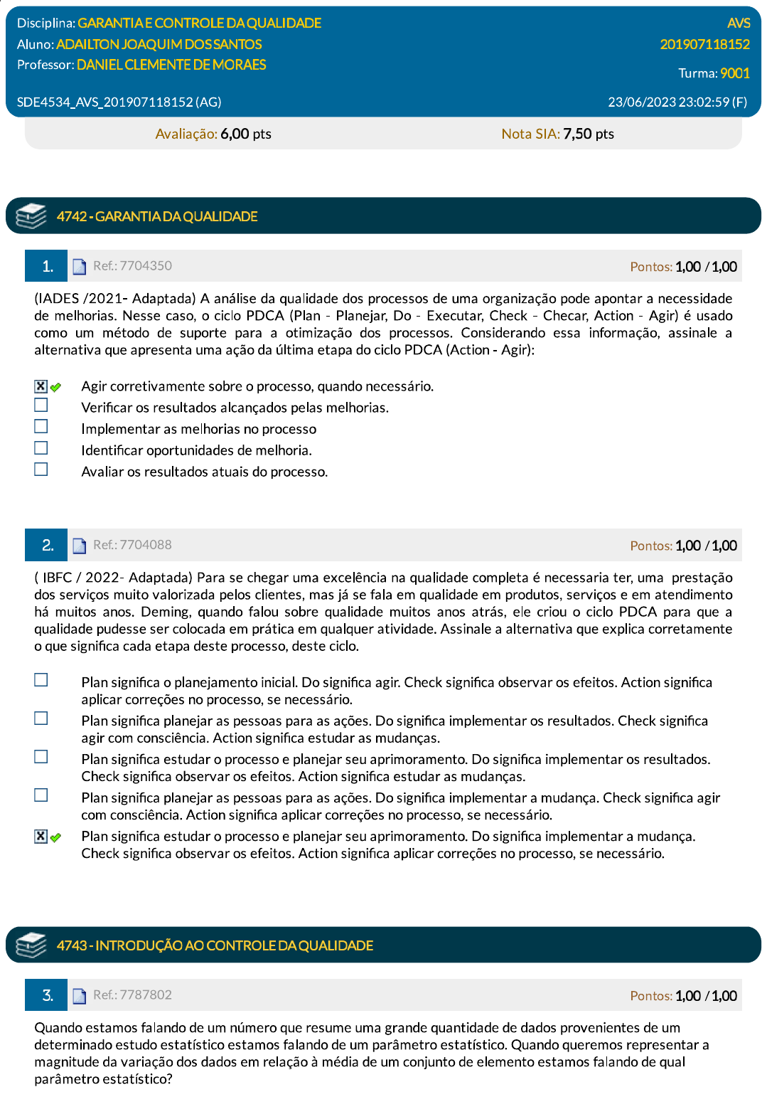 <p>Disciplina: E CONTROLE DA QUALIDADE AVS Aluno: ADAILTON JOAQUIM DOSSANTOS 201907118152 Professor: DANIEL CLEMENTE DE MORAES Turma: 9001 SDE4534_AVS_201907118152 (AG) 23/06/2023 23:02:59 (F) Avaliação: 6,00 pts Nota SIA: 7,50 pts 4742 GARANTIA DA 1. Ref.: 7704350 Pontos: (IADES /2021- Adaptada) A análise da qualidade dos processos de uma organização pode apontar a necessidade de melhorias. Nesse caso, o ciclo PDCA (Plan Planejar, Do Executar, Check Checar, Action Agir) é usado como um método de suporte para a otimização dos processos. Considerando essa informação, assinale a alternativa que apresenta uma ação da última etapa do ciclo PDCA (Action Agir) Agir corretivamente sobre o processo, quando necessário. Verificar os resultados alcançados pelas melhorias. Implementar as melhorias no processo Identificar oportunidades de melhoria. os resultados atuais do processo. 2. Ref.: 7704088 Pontos: 1,00 / 1,00 ( IBFC / 2022- Adaptada) Para se chegar uma excelência na qualidade completa é necessaria ter, uma prestação dos serviços muito valorizada pelos clientes, mas já se fala em qualidade em produtos, serviços e em atendimento há muitos anos. Deming, quando falou sobre qualidade muitos anos atrás, ele criou o ciclo PDCA para que a qualidade pudesse ser colocada em prática em qualquer atividade. Assinale a alternativa que explica corretamente o que significa cada etapa deste processo, deste ciclo. Plan significa o planejamento inicial. Do significa agir. Check significa observar os efeitos. Action significa aplicar correções no processo, se necessário. Plan significa planejar as pessoas para as ações Do significa implementar os resultados. Check significa agir com consciência. Action significa estudar as mudanças. Plan significa estudar o processo e planejar seu Do significa implementar os resultados. Check significa observar os efeitos. Action significa estudar as mudanças. Plan significa planejar as pessoas para as Do significa implementar a mudança. Check significa agir com consciência. Action significa aplicar correções no processo, se necessário. Plan significa estudar o processo e planejar seu aprimoramento. Do significa implementar a mudança. Check significa observar os efeitos. Action significa aplicar correções no processo, se necessário. 4743 INTRODUÇÃO AO CONTROLE DA QUALIDADE 3. Ref.: 7787802 Pontos: Quando estamos falando de um número que resume uma grande quantidade de dados provenientes de um determinado estudo estatístico estamos falando de um parâmetro estatístico. Quando queremos representar a magnitude da variação dos dados em relação à média de um conjunto de elemento estamos falando de qual parâmetro estatístico?</p><p>Coeficiente de correlação linear. Moda. Intervalo de Confiança. Mediana. Desvio Padrão. 4. Ref.: 7787982 Pontos: Quando falamos de população estamos considerando o conjunto de indivíduos, objetos ou produtos que contém a característica que temos interesse. Caso durante a investigação, alguns indivíduos da população sejam excluídos desta, podemos classificar esse conjunto como: População alvo. População grelha. População lote. Amostra da população. População teórica. 4744 CONTROLE DA QUALIDADE DE PRODUTOSSÓLIDOS, SEMISSÓLIDOSE LÍQUIDOS 5. Ref.: 7790133 Pontos: (Adaptado de CETRO 2013 ANVISA Especialista em Regulação Vigilância Sanitária Área 2) A comparação de perfis de dissolução é útil quando se deseja conhecer o comportamento de dois medicamentos antes de submetê-los a estudo de biodisponibilidade relativa/ bioequivalência, para isenção de menores dosagens desses estudos e para alterações pós-registro. Sobre esse assunto analise as afirmativas a seguir. I. Para execução do perfil de dissolução, devem-se empregar 20 unidades do medicamento-teste e 20 do medicamento de referência/ comparador. II. número de coletas deve ser representativo até ser atendido o platô de dissolução ou 85% do total de princípio ativo dissolvido. III. Para formas farmacêuticas de liberação prolongada, a dissolução contempla uma etapa ácida e a dissolução em tampão e a coleta de amostras deve ser realizada de forma seriada até que o platô de dissolução ou 80% sejam alcançados. É correto o que se afirma: I, apenas. II, apenas. e III. III, apenas. II. 6. Ref.: 7790134 Pontos: A estabilidade é definida como o tempo durante o qual a especialidade farmacêutica ou mesmo a matéria prima considerada isoladamente mantém, dentro dos limites especificados e durante todo o período de estocagem, transporte e uso, as mesmas características que possuía no momento da sua produção (SOUZA, J.N. Estudo de</p><p>estabilidade: fatores que influenciam na estabilidade do 2014. 40 f. Trabalho de Conclusão de Curso (Especialização) Instituto de Tecnologia em Fármacos/Farmanguinhos, Fundação Oswaldo Cruz, Rio de Janeiro, Sobre o estudo de estabilidade de longa duração analise a relação entre as assertivas a seguir: I. João, responsável pela garantia da qualidade de uma indústria farmacêutica, realizou o pedido de registro definitivo na ANVISA de um medicamento com um novo insumo farmacêutico apresentando os estudos de estabilidade acelerado concluídos, mas sem ter iniciado o estudo de instabilidade de longa duração em andamento. PORQUE II. Para registros definitivos de medicamentos no Brasil com novo insumo farmacêutico ativo poderão ser apresentados estudos de estabilidade acelerado concluídos, não sendo obrigatório os estudos de estabilidade forçada e de longa duração. A respeito dessas asserções, assinale a opção correta: As asserções e são proposições falsas. A asserção é uma proposição verdadeira enquanto a é falsa. As asserções I e são proposições verdadeiras, mas a não é uma justificativa da I. A asserção I é uma proposição falsa e a é uma proposição verdadeira. As asserções e são proposições verdadeiras 