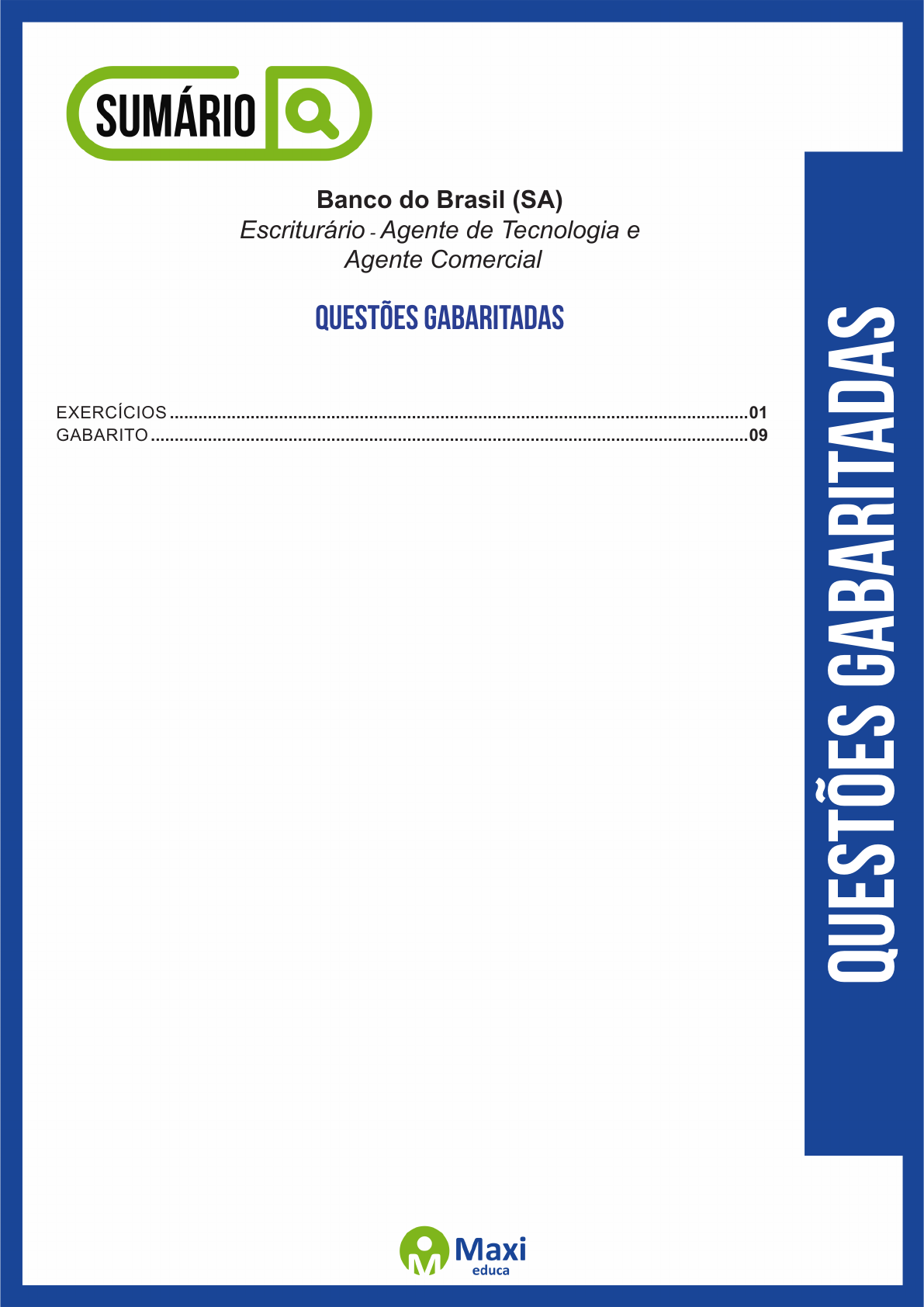 <p>QU</p><p>ES</p><p>TÕ</p><p>ES</p><p>G</p><p>AB</p><p>AR</p><p>ITA</p><p>DA</p><p>S</p><p>EXERCÍCIOS ..........................................................................................................................01</p><p>GABARITO ..............................................................................................................................09</p><p>Banco do Brasil (SA)</p><p>Escriturário - Agente de Tecnologia e</p><p>Agente Comercial</p><p>QUESTÕES GABARITADAS</p><p>Apostila gerada especialmente para: Sergio Carlos Moreal 559.582.499-91</p><p>1</p><p>PROBABILIDADE E ESTATÍSTICA</p><p>1. CESGRANRIO - ESC BB/BB/AGENTE COMERCIAL/2021</p><p>Assunto: Ramos da estatística; Censo e amostra</p><p>Responsável por entender o comportamento dos produtos oferecidos por determinado banco onde trabalhava,</p><p>e preocupado com a quantidade enorme de dados disponíveis para a análise, um funcionário decidiu extrair</p><p>um subconjunto desses dados.</p><p>Esse subconjunto é conhecido como</p><p>(A) amostra</p><p>(B) censo</p><p>(C) parâmetro</p><p>(D) população</p><p>(E) variável</p><p>2. CESGRANRIO - ESC BB/BB/AGENTE COMERCIAL/2021</p><p>Assunto: Escalas de medida</p><p>Um funcionário de um banco foi incumbido de acompanhar o perfil dos clientes de um determinado produto por</p><p>meio da Análise de Dados, de forma a aprimorar as atividades de marketing relativas a esse produto. Para isso,</p><p>ele utilizou a variável classe social desses clientes, coletada pelo banco, que tem os valores A, B, C, D e E, sem</p><p>referência a valores contínuos.</p><p>Sabendo-se que essa é uma escala ordinal, qual é a medida de tendência central adequada para analisar essa</p><p>variável?</p><p>(A) média aritmética</p><p>(B) média geométrica</p><p>(C) mediana</p><p>(D) quartis</p><p>(E) variância</p><p>3. CESGRANRIO - ESC BB/BB/AGENTE COMERCIAL/2021</p><p>Assunto: Escalas de medida</p><p>Foi solicitado a um funcionário de um determinado banco que realizasse uma pesquisa, exclusivamente com</p><p>variáveis do tipo qualitativa, sobre a satisfação dos clientes com os serviços oferecidos pela instituição.</p><p>Para atender a essa demanda utilizando os meios adequados, sua escolha de escalas de mensuração deve</p><p>estar limitada às escalas</p><p>(A) intervalares e razão</p><p>(B) nominais e intervalares</p><p>(C) nominais e ordinais</p><p>(D) ordinais e intervalares</p><p>(E) ordinais e razão</p><p>4. CESGRANRIO - ESC BB/BB/AGENTE COMERCIAL/2021</p><p>Assunto: Formas gráficas de apresentação de dados agrupados em classes</p><p>Após a coleta de dados em um determinado contexto (variáveis A, B, C, … X), uma das formas mais simples e</p><p>iniciais de análise é a geração e a avaliação de um histograma para uma variável selecionada (ex: X), como</p><p>por exemplo, em um estudo climático, em que os dados coletados poderiam incluir a temperatura máxima ob-</p><p>servada em toda a Terra ao longo de dez anos.</p><p>Nesse caso, o histograma adequado é um gráfico em que são apresentadas as</p><p>(A) últimas dez médias móveis da variável X</p><p>(B) somas das médias dos quadrados de cada valor de uma variável X</p><p>(C) variações de uma variável X ao longo do tempo</p><p>Apostila gerada especialmente para: Sergio Carlos Moreal 559.582.499-91</p><p>2</p><p>(D) médias históricas da variável X nos últimos sete dias</p><p>(E) frequências de uma variável X em intervalos de valores</p><p>5. CESGRANRIO - TBN (CEF)/CEF/”SEM ÁREA”/2021</p><p>Assunto: Média para dados não agrupados</p><p>Recentemente, a Organização Mundial da Saúde (OMS) mudou suas diretrizes sobre atividades físicas, pas-</p><p>sando a recomendar que adultos façam atividade física moderada de 150 a 300 minutos por semana. Seguindo</p><p>as recomendações da OMS, um motorista decidiu exercitar-se mais e, durante os sete dias da última semana,</p><p>exercitou- se, ao todo, 285 minutos. Quantos minutos diários, em média, o motorista dedicou a atividades físi-</p><p>cas na última semana?</p><p>(A) Mais de 46 min</p><p>(B) Entre 44 e 46 min</p><p>(C) Entre 42 e 44 min</p><p>(D) Entre 40 e 42 min</p><p>(E) Menos de 40 min</p><p>6. CESGRANRIO - TEC BAN (BASA)/BASA/2022</p><p>Assunto: Média para dados em classe</p><p>A Tabela abaixo representa as frequências referentes aos resultados de alcatrão (mg) encontrados em cigarros</p><p>sem filtro, a partir de uma amostra de 30 cigarros selecionados de várias marcas.</p><p>Se a média de alcatrão na amostra foi de 20,4 mg, qual o valor de x-y ?</p><p>(A) 6</p><p>(B) 8</p><p>(C) 10</p><p>(D) 12</p><p>(E) 14</p><p>Apostila gerada especialmente para: Sergio Carlos Moreal 559.582.499-91</p><p>3</p><p>7. CESGRANRIO - PNMO (ELETRONUCLEAR)/ELETRONUCLEAR/ESPECIALISTA EM SEGURANÇA</p><p>DE ÁREA PROTEGIDA DE NUCLEAR/2022</p><p>Assunto: Média ponderada</p><p>Em um determinado concurso, a nota final de cada candidato é calculada por meio da média aritmética ponde-</p><p>rada das notas de quatro provas: Matemática, Português, Informática e Inglês. A Tabela a seguir mostra os pe-</p><p>sos de cada prova e as notas de um candidato em três delas, pois ele desconhece sua nota na prova de Inglês.</p><p>Supondo que esse candidato tenha recebido nota x na prova de Inglês, a sua nota final será dada por</p><p>(A) 44+2X</p><p>4</p><p>(B) 21+X</p><p>8</p><p>(C) 22+2X</p><p>4</p><p>(D) 44+X</p><p>8</p><p>(E) 22+X</p><p>4</p><p>8. CESGRANRIO - PNS (ELETRONUCLEAR)/ELETRONUCLEAR/ENGENHEIRO DE ANALISE PROBA-</p><p>BILÍSTICA DE SEGURANÇA/2022</p><p>Assunto: Quantis (mediana, quartil, decil, percentil) e Interpolação linear da Ogiva</p><p>A Tabela a seguir indica a frequência de acidentes de trabalhadores de uma empresa do setor sucroalcooleiro,</p><p>em faixas etárias, durante um período de 7 anos.</p><p>Idade</p><p>Observando-se os dados presentes na Tabela e usando-se o método de interpolação linear, qual a idade me