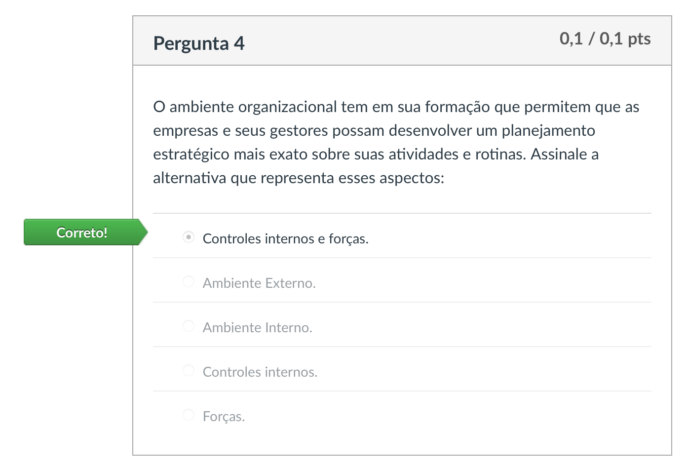 <p>Pergunta 4 0,1 / 0,1 pts O ambiente organizacional tem em sua formação que permitem que as empresas e seus gestores possam desenvolver um planejamento estratégico mais exato sobre suas atividades e rotinas. Assinale a alternativa que representa esses aspectos: Correto! Controles internos e forças. Ambiente Externo. Ambiente Interno. Controles internos. Forças.</p>