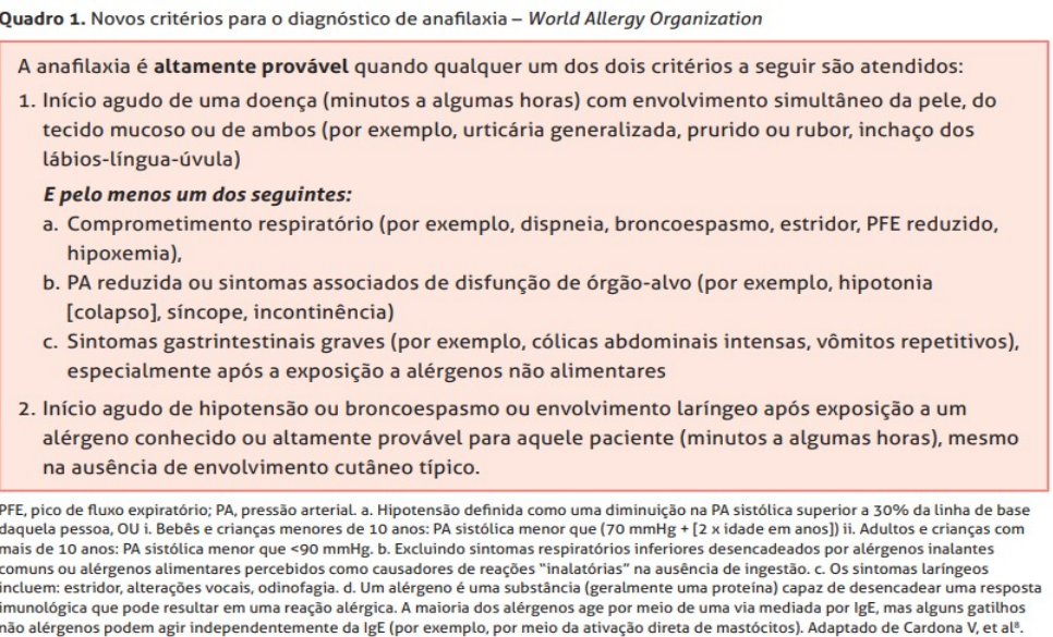 <p>Choque anafiatico</p><p>Definição e Sinais:</p><p>· Reação multissistêmica grave de início agudo e potencialmente fatal.</p><p>· Sintomas: urticária, angioedema, comprometimento respiratório, gastrintestinal e/ou hipotensão arterial.</p><p>· Diagnóstico alertado por dois ou mais sintomas imediatamente após exposição ao alérgeno.</p><p>· A ausência de critérios mais abrangentes leva à sua subnotificação, subdiagnóstico e possíveis erros ou retardo na instituição da terapêutica adequada.</p><p>· O termo ANAFILAXIA deve ser utilizado na descrição tanto de casos mais graves acompanhados de choque (colapso cardiovascular), quanto dos casos mais leves.</p><p>Incidência e Fatores Desencadeantes:</p><p>· Incidência verdadeira desconhecida, mas relatos de aumento em países como Austrália, Reino Unido e EUA.</p><p>· Principais desencadeantes: medicamentos (antibióticos, AINH), alimentos, látex.</p><p>· Fatores culturais e socioeconômicos influenciam exposição a alimentos.</p><p>· Látex: aumento da anafilaxia, atenção especial a grupos de risco e reações cruzadas com frutas.</p><p>· Medicamentos perioperatórios: relaxantes musculares, antibióticos, AINH, coloides, opiáceos.</p><p>· Radiocontrastes iônicos: cerca de 2% de reações adversas, menos frequentes com contrastes não-iônicos.</p><p>· Exercício físico isolado ou associado a alimentos pode desencadear anafilaxia.</p><p>· No Brasil, principais agentes causais: medicamentos (AINH, antibióticos), alimentos (leite, clara de ovo, crustáceos), picadas de insetos. Cerca de 10% idiopática.</p><p>Como fazer o diagnóstico?</p><p>Recentemente a World Allergy Organization (WAO) definiu novos critérios clínicos relacionados à alta probabilidade diagnóstica de anafilaxia em pacientes adultos e pediátricos conforme descrito no Quadro 1.</p><p>· O espectro das manifestações clínicas compreende desde reações leves até graves e fatais. O início geralmente é súbito, podendo atingir vários órgãos.</p><p>· Os sintomas iniciais ocorrem em segundos/minutos até horas após a exposição ao agente causal.</p><p>· É importante ressaltar que reações bifásicas podem ocorrer de 8 a 12 horas em até 10% dos casos.</p><p>Diagnóstico de Anafilaxia: Aspectos Importantes:</p><p>Eminência Clínica:</p><p>· Diagnóstico primariamente clínico.</p><p>· Anamnese detalhada: agente suspeito, via de administração, dose, sequência de sintomas, tempo de início, tratamentos prévios, fatores associados (exercício, medicamentos).</p><p>Exames Complementares:</p><p>· Dosagem de triptase plasmática (pode auxiliar na confirmação).</p><p>· Dosagem de IgE sérica específica para confirmação da etiologia (podendo ser negativa na emergência, realizada posteriormente).</p><p>Diagnóstico Diferencial:</p><p>· Reação vasovagal: sudorese, náusea, hipotensão, bradicardia (diferente da taquicardia na anafilaxia), ausência de sintomas cutâneos.</p><p>· Doenças menos frequentes: mastocitose sistêmica, angioedema hereditário, feocromocitoma, síndrome carcinoide, disfunção de cordas vocais, escromboidismo.</p><p>Por que ocorre a anafilaxia?</p><p>Anafilaxia: Mecanismos e Antígenos:</p><p>Mecanismos Imunológicos:</p><p>· Predominantemente IgE-Mediado:</p><p>· Desencadeado por antígenos como alimentos, medicamentos, veneno de insetos.</p><p>· Liberação imediata de histamina e mediadores por mastócitos e basófilos.</p><p>Outros Mecanismos Imunológicos:</p><p>· Reações por imunocomplexos circulantes.</p><p>· Ativação direta de mastócitos.</p><p>· Envolvimento de componentes do sistema complemento, leucotrienos, prostaglandinas, cininas, fatores da coagulação e fibrinólise.</p><p>Mecanismos Não Imunológicos:</p><p>· Ativação direta de mastócitos.</p><p>· Possível envolvimento de diversos componentes como sistema complemento, leucotrienos, prostaglandinas, cininas, fatores de coagulação e fibrinólise.</p><p>Anafilaxia Idiopática:</p><p>· Casos em que o fator etiológico é desconhecido.</p><p>· Similaridade no quadro clínico e mediadores químicos, mesmo sem causa identificada.</p><p>INDICAÇÃO INTERNAÇÃO</p><p>· Pacientes assintomáticos após adrenalina: observar por 4 a 6 horas</p><p>· Pacientes com sintomas refratários a primeira dose de adrenalina: internar por pelo menos 24 horas</p><p>ALOCAÇÃO Critérios para internação em UTI</p><p>· Comprometimento respiratório</p><p>· Necessidade de suporte ventilatório de modo invasivo ou através de intubação orotraqueal</p><p>· Choque anafilático refratário a adrenalina</p><p>Como é o tratamento adequado da anafilaxia?</p><p>Reconhecimento Rápido:</p><p>· Essencial para preservar a permeabilidade das vias respiratórias, manter a pressão sanguínea e a oxigenação.</p><p>Principais Medidas:</p><p>Administração Rápida de Adrenalina:</p><p>· Efeito α-adrenérgico para reverter vasodilatação, diminuir edema e obstrução das vias aéreas, reduzindo hipotensão e sintomas de urticária/angioedema.</p><p>· Propriedades β-adrenérgicas aumentam contratilidade cardíaca, débito cardíaco, fluxo coronariano e causam broncodilatação.</p><p>· Adrenalina é a droga de primeira linha.</p><p>Decúbito Dorsal com Membros Inferiores Elevados:</p><p>· Auxilia na circulação sanguínea.</p><p>Suplementação de O2 se SatO2 ≤95%:</p><p>· Garante adequada oxigenação.</p><p>Manutenção Adequada da Volemia:</p><p>· Importante para preservar a pressão arterial.</p><p>Eficácia da Adrenalina:</p><p>· Reversão rápida do quadro.</p><p>· Ação abrangente sobre os mecanismos fisiopatológicos da anafilaxia.</p><p>Prescrição Precoce:</p><p>· Essencial para salvar a vida do paciente.</p><p>são descritos os principais agentes utilizados no tratamento agudo da anafilaxia:</p><p>Esquema de tratamento :</p><p>Tratamento inicial de escolha</p><p>· ADRENALINA VIA INTRAMUSCULAR (vas