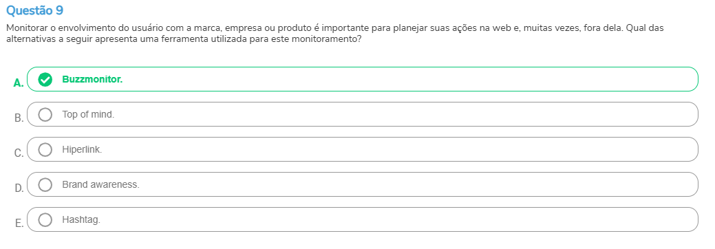 <p>Questão 9 Monitorar envolvimento do usuário com a marca, empresa ou produto é importante para planejar suas ações na web e, muitas vezes, fora dela. Qual das alternativas a seguir apresenta uma ferramenta utilizada para este monitoramento? A. Buzzmonitor. B. Top of C. Hiperlink D. Brand E. Hashtag.</p>