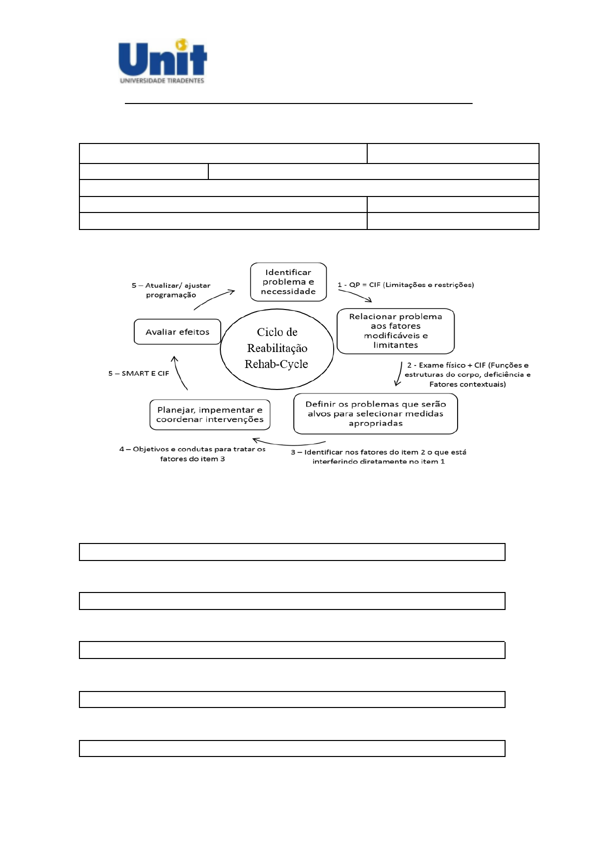 <p>Universidade Tiradentes</p><p>SIC-Sistema Integrado de Clínicas</p><p>Ficha de avaliação: Avaliação Neurofuncional aula prática - 2023</p><p>Nome: Data de nascimento/Idade:</p><p>Sexo: Diagnóstico neurofuncional:</p><p>Aluno(s):</p><p>Início do tratamento: Tempo de lesão:</p><p>Professor(a):</p><p>Etapa 1: ANAMNESE</p><p>Queixa Principal (Queixa funcional) De acordo com a CIF-desempenho: atividade e participação</p><p>História da Doença Atual</p><p>História da Doença Pregressa</p><p>Antecedentes Familiares</p><p>História Social</p><p>Universidade Tiradentes</p><p>SIC-Sistema Integrado de Clínicas</p><p>Ficha de avaliação: Avaliação Neurofuncional aula prática - 2023</p><p>2: Rehab - EXAME FÍSICO e CIF - Funções e estruturas do corpo e fatores contextuais</p><p>SINAIS VITAIS (verificar somente em casos que justifiquem alterações clínicas)</p><p>PA:</p><p>FC:</p><p>SATURAÇÃO:</p><p>AVALIAÇÃO DE TÔNUS</p><p>Passividade</p><p>[ ] Normopassivo [ ] Hipopassivo [ ] Hiperpassivo Grupo(s) muscular(es):</p><p>Extensibilidade</p><p>[ ] Normoextensivo [ ] Hipoextensivo [ ] Hiperextensivo Grupo(s) muscular(es):</p><p>Mensuração tônica (escores 1 a 4 para hipertonia elástica/espasticidade e 3 e 4 para</p><p>hipertonia plástica)</p><p>Escala de AshwortModificada</p><p>0 Tônus normal</p><p>1</p><p>Aumento de tônus no início ou final do</p><p>movimento</p><p>1+ Aumento de tônus em <50%</p><p>2 Aumento de tônus em >50%</p><p>3</p><p>Movimentação difícil em</p><p>flexo-extensão</p><p>4 Partes rígidas em flexão ou extensão</p><p>Grupo Muscular [Escore] D [Escore] E</p><p>MOVIMENTOS INVOLUNTÁRIOS (Identificar e localizar quando presentes: clônus,</p><p>tipos de tremores, automatismo medular em extensão e/ou flexão):</p><p>CONTRATURA</p><p>[ ] Ausente [ ] Presente</p><p>Tipo: [ ] Neurogênica [ ] Neuromiogênica [ ] Neuromioartrogênica</p><p>Localizar:</p><p>Universidade Tiradentes</p><p>SIC-Sistema Integrado de Clínicas</p><p>Ficha de avaliação: Avaliação Neurofuncional aula prática - 2023</p><p>SENSIBILIDADE</p><p>Tipo: [ ] Tátil [ ] Dolorosa [ ] Térmica</p><p>[ ] Normoestesia [ ] Hipoestesia [ ] Hiperestesia</p><p>Área:</p><p>MANOBRAS DEFICITÁRIAS</p><p>Avaliar Resposta</p><p>0 Não realiza</p><p>1</p><p>Realiza com</p><p>dificuldade</p><p>2 Realiza</p><p>Manobra Avaliar</p><p>Mingazzini</p><p>Barré</p><p>Queda dos MMII em abdução</p><p>Braços estendidos</p><p>Raimiste</p><p>Firmar Jornal</p><p>GRAU DE FORÇA SUBJETIVA</p><p>Escore Resposta</p><p>0 Não realiza esboça de contração</p><p>1 Esboça contração</p><p>2 Realiza movimento, mas não vence</p><p>a gravidade</p><p>3 Vence a gravidade</p><p>4 Vence a gravidade e pouca</p><p>resistência</p><p>5 Vence a gravidade e muita</p><p>resistência</p><p>Grupo Muscular [Escore] D [Escore] E</p><p>EQUILÍBRIO CORPORAL E COORDENAÇÃOMOTORA</p><p>0 Não realiza</p><p>1 Realiza com dificuldade</p><p>2 Realiza</p><p>Teste</p><p>Romberg</p><p>Romberg sensibilizado</p><p>Index-dedo</p><p>Indez-nariz</p><p>Calcanhar-joelho</p><p>Calcanhar-joelho</p><p>sensibilizado</p><p>Prova do Rechaço (Stewart</p><p>Holmes)</p><p>Universidade Tiradentes</p><p>SIC-Sistema Integrado de Clínicas</p><p>Ficha de avaliação: Avaliação Neurofuncional aula prática - 2023</p><p>REFLEXOS MIOTÁTICOS</p><p>Tendão avaliado (Aplicar resposta em todos os tendões avaliados):</p><p>Tendão avaliado: ________________________</p><p>Resposta reflexa [ ] Normorreflexo [ ] Hiporreflexo [ ] Hiperreflexo</p><p>Tendão avaliado: ________________________</p><p>Resposta reflexa [ ] Normorreflexo [ ] Hiporreflexo [ ] Hiperreflexo</p><p>MEDIDA DE INDEPENDÊNCIA FUNCIONAL</p><p>MIF por Atividade (alinhar com as tarefas e atividades do desempenho segundo a CIF)</p><p>Atividade não realizada 0 Não realiza nada</p><p>Pouco realiza ou nenhum esforço 1 Assistência total</p><p>2 Assistência máxima</p><p>Realizada mais de 50% 3 Assistência moderada</p><p>4 Assistência mínima</p><p>Realizada sem assistência 5 Supervisão ou organização</p><p>6 Considerações de segurança</p><p>7 Ambiente modificado</p><p>8 Dispositivo auxiliar</p><p>9 Requer tempo adicional</p><p>10 Atividade realizada</p><p>Descreva e pontue a atividade 1: Atividade 2:</p><p>Atividade 3: Atividade 4:</p><p>MIF do Indivíduo</p><p>Universidade Tiradentes</p><p>SIC-Sistema Integrado de Clínicas</p><p>Ficha de avaliação: Avaliação Neurofuncional aula prática - 2023</p><p>Autocuidado</p><p>Alimentar-se</p><p>Arrumar-se</p><p>Tomar banho</p><p>Vestir-se (parte superior)</p><p>Vestir-se (parte inferior</p><p>Usar banheiro</p><p>Controle Esfincteriano</p><p>Bexiga</p><p>Intestino</p><p>Transferências</p><p>Leito, cadeira, cadeira de rodas</p><p>Vaso sanitário</p><p>Banheiro, chuveiro</p><p>Locomoção</p><p>Andar</p><p>Andar em cadeira de rodas</p><p>Subir/descer escadas</p><p>Comunicação</p><p>Compreensão</p><p>Expressão</p><p>Cognição Social</p><p>Interação Social</p><p>Solução de problemas</p><p>Memória</p><p>Somatório Final (MIF Indivíduo)</p><p>Níveis da MIF Indivíduo</p><p>1 Assistência Total <25%</p><p>2 Assistência Máxima 25-49%</p><p>3 Assistência Moderada 50-74%</p><p>4 Assistência Mínima 75-99%</p><p>5 Supervisão =100%</p><p>6 Independência modificada</p><p>(Dispositivo)</p><p>0%</p><p>7 Independência completa</p><p>(tempo/segurança)</p><p>0%</p><p>Escore Final da MIF Indivíduo</p><p>18 Dependência Total 100% Assist</p><p>19-60 Dependência</p><p>Modificada</p><p>50% Assist.</p><p>61-10</p><p>3</p><p>Dependência</p><p>Modificada</p><p>25% Assist.</p><p>104-1</p><p>26</p><p>Independência</p><p>completa/modificada</p><p>0% Assist</p><p>Escala Timed Get Up And Go – TUG (Tempo: )</p><p>MARCHA (Este item será avaliado utilizando a Escala Timed Get Up And Go – TUG � 3 metros de</p><p>distância):</p><p>Fase 1 (Balanço inicial):</p><p>Fase 2 (Balanço médio):</p><p>Fase 3 (Balanço final):</p><p>Fase 4 (Apoio 