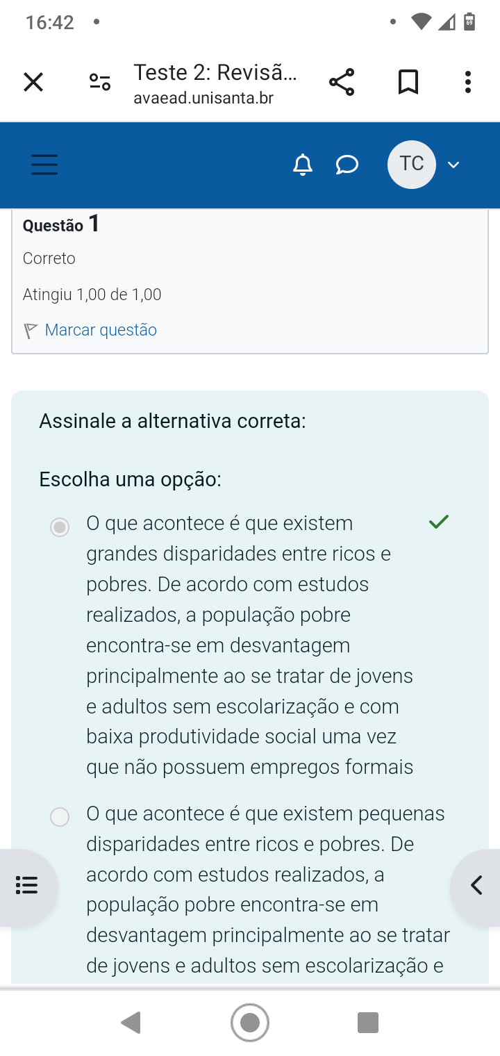 <p>16:42 X Teste 2: Revisã... avaead.unisanta.br V Questão 1 Correto Atingiu 1,00 de 1,00 Marcar questão Assinale a alternativa correta: Escolha uma opção: O que acontece é que existem grandes disparidades entre ricos e pobres. De acordo com estudos realizados, a população pobre encontra-se em desvantagem principalmente ao se tratar de jovens e adultos sem escolarização e com baixa produtividade social uma vez que não possuem empregos formais O que acontece é que existem pequenas disparidades entre ricos e pobres. De acordo com estudos realizados, a < população pobre encontra-se em desvantagem principalmente ao se tratar de jovens e adultos sem escolarização e</p>